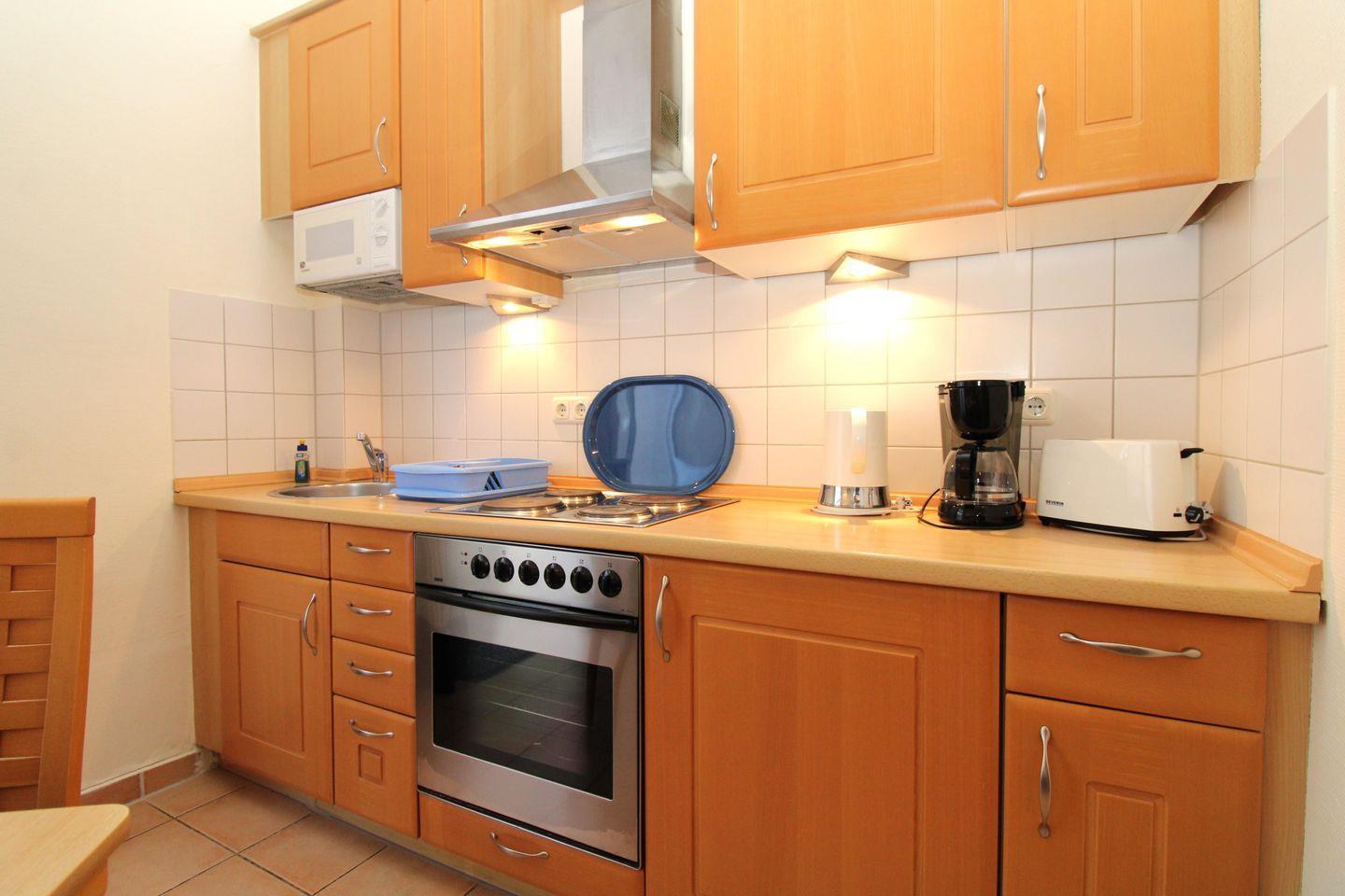 Die offene Küche beinhaltet eine voll ausgestattete Einbauküchenzeile mit 4-Platten-Herd, Backofen, Dunstabzug, Mikrowelle, Kühlschrank mit Gefrierfach, Kaffeemaschine, Wasserkocher und Toaster. Die Küche ist mit Geschirr, Gläsern, Besteck und Töpfen komplett ausgestattet.