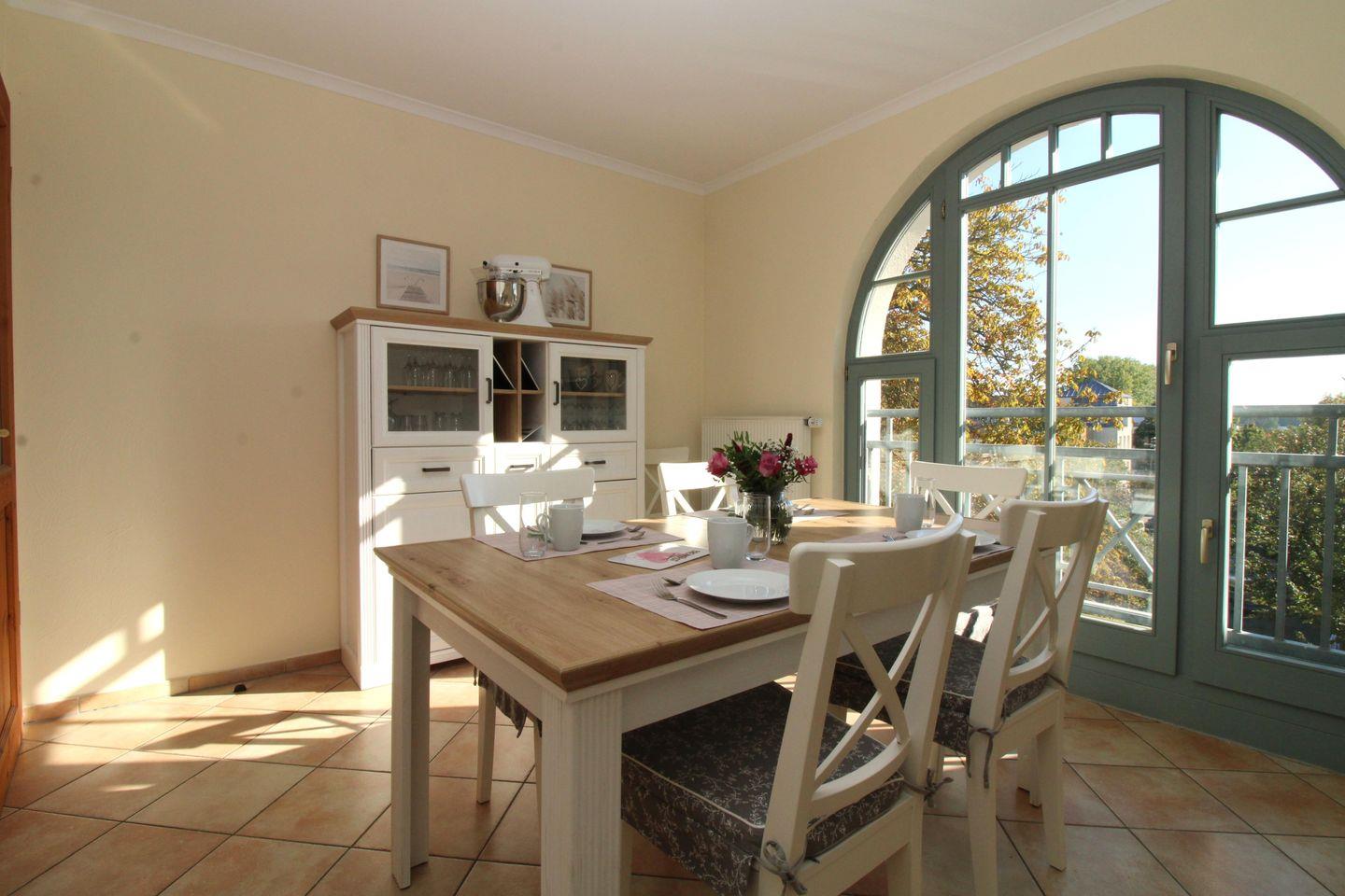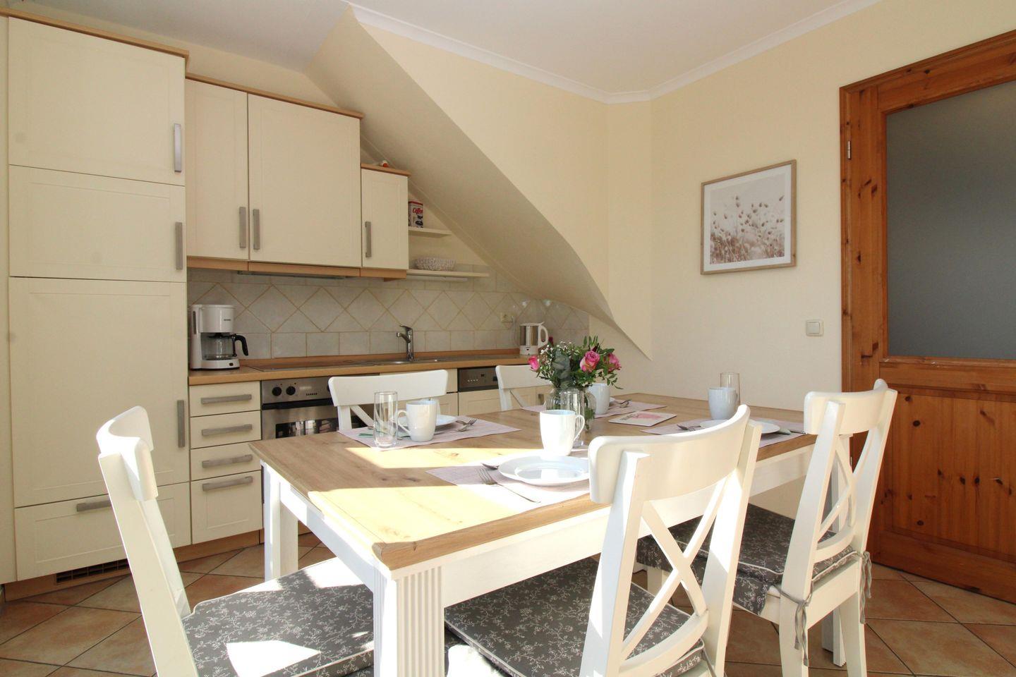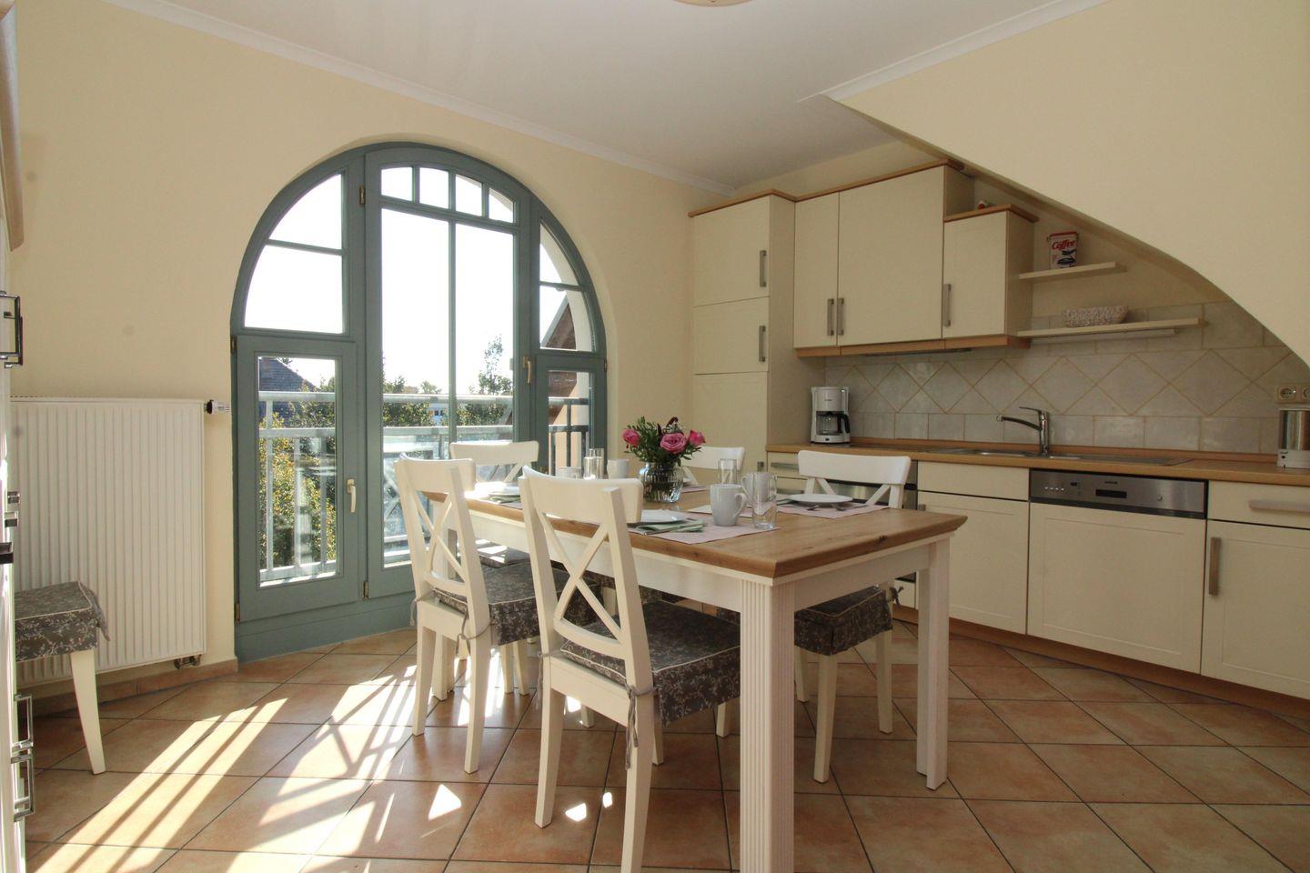 Die separate Küche mit großen bodentiefen Fenstern beinhaltet einen großen Esstisch mit 4 Stühlen, einen Geschirrschrank, eine voll ausgestattete Einbauküchenzeile mit 4-Zonen-Ceran-Kochfeld, Backofen, Dunstabzug, Kühlschrank mit Gefrierfach, Geschirrspülmaschine, Kaffeemaschine, Wasserkocher und Toaster. Die Küche ist mit Geschirr, Gläsern, Besteck und Töpfen komplett ausgestattet.