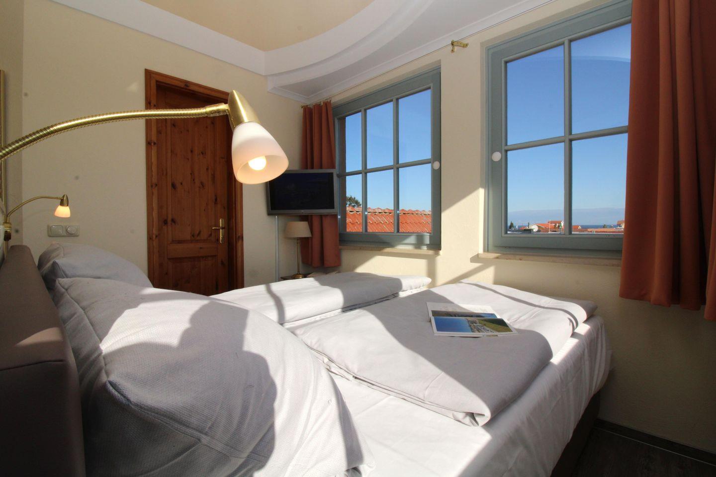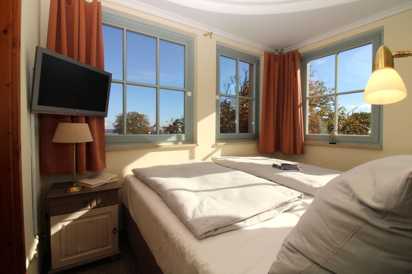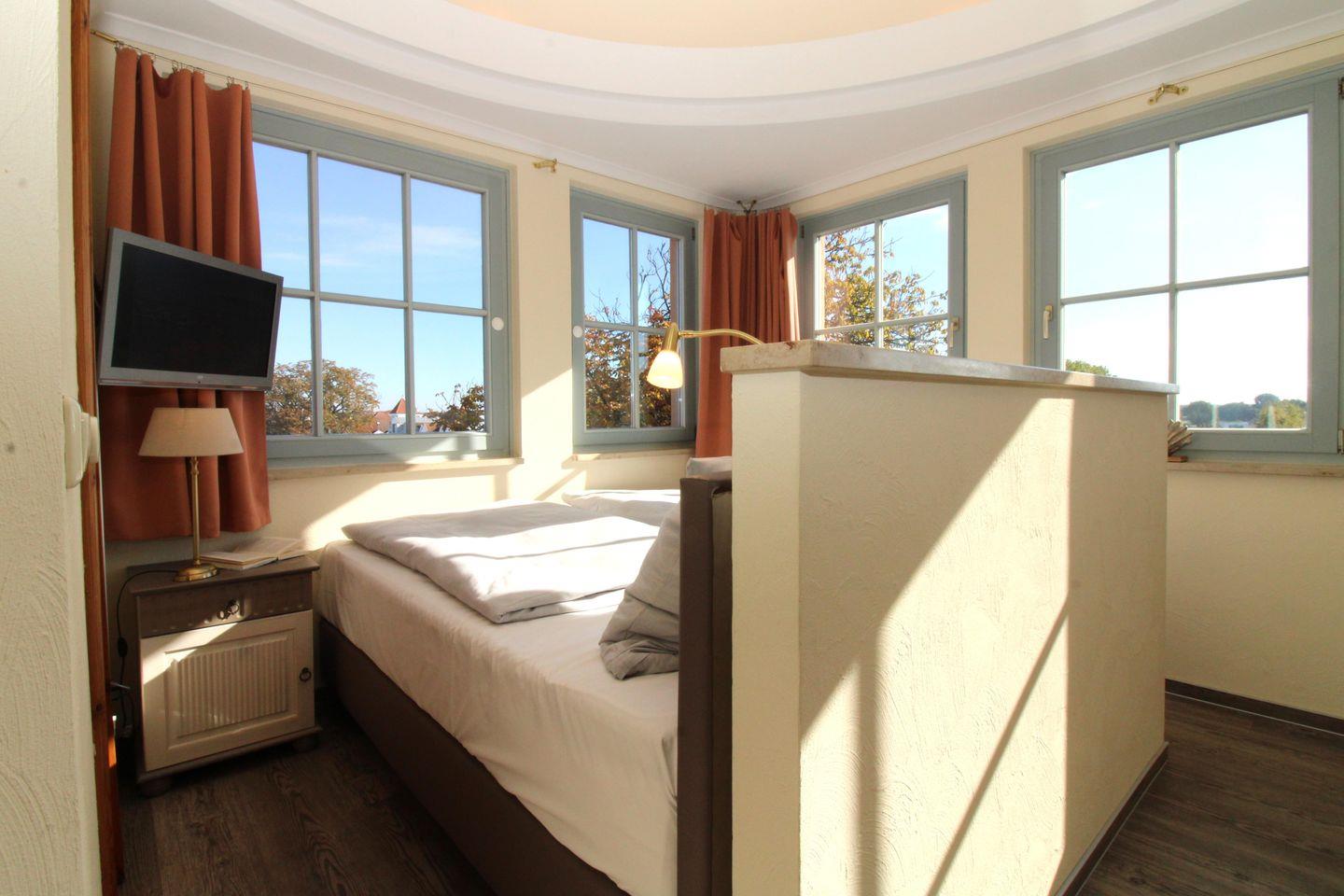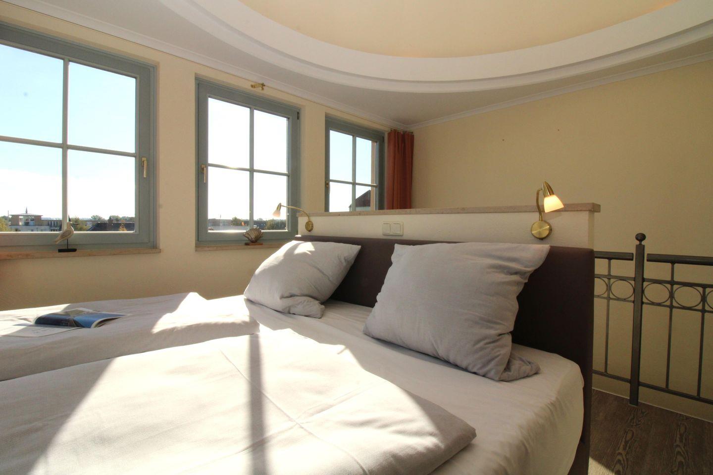 Das separate und zusätzliche 2. Schlafzimmer im Turm der Wohnung (Obergeschoss) ist etwas ganz Besonderes: von hier aus genießen Sie in 3 Richtungen freien Blick weit über die Dächer des Ostseebades, am Horizont sehen Sie die vor Ihnen liegende Ostsee. Dieses Schlafzimmer verfügt ebenfalls über ein bequemes Boxspringbett (180 cm x 200 cm), Nachttische mit Nachttischlampen sowie einen kleinen Einbau-Kleiderschrank.
