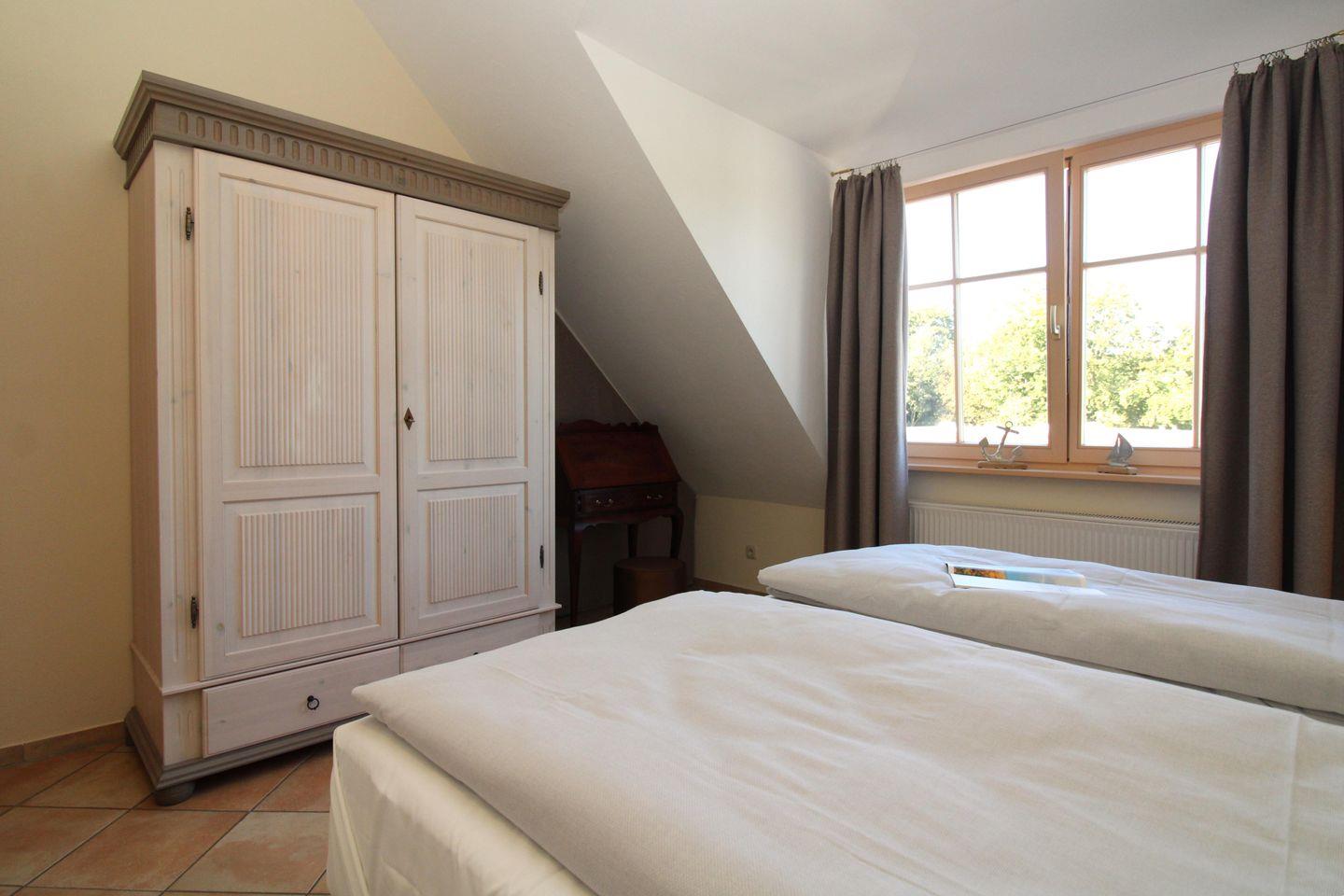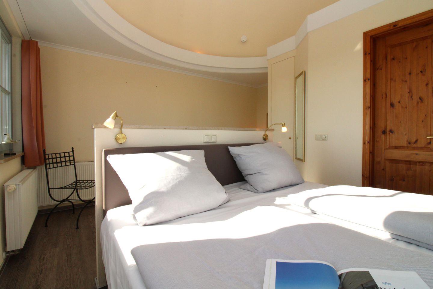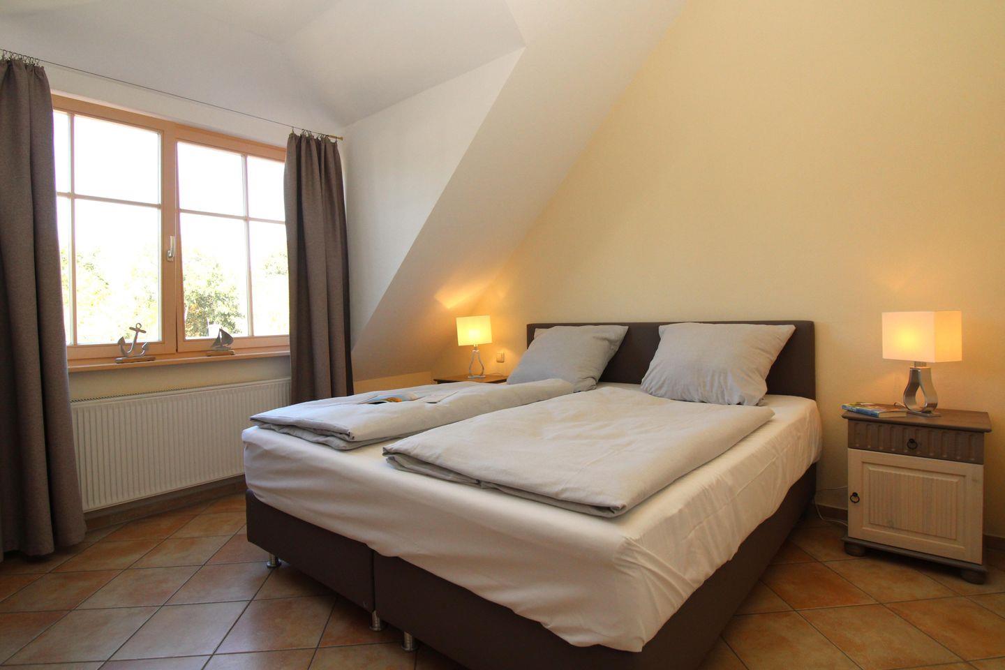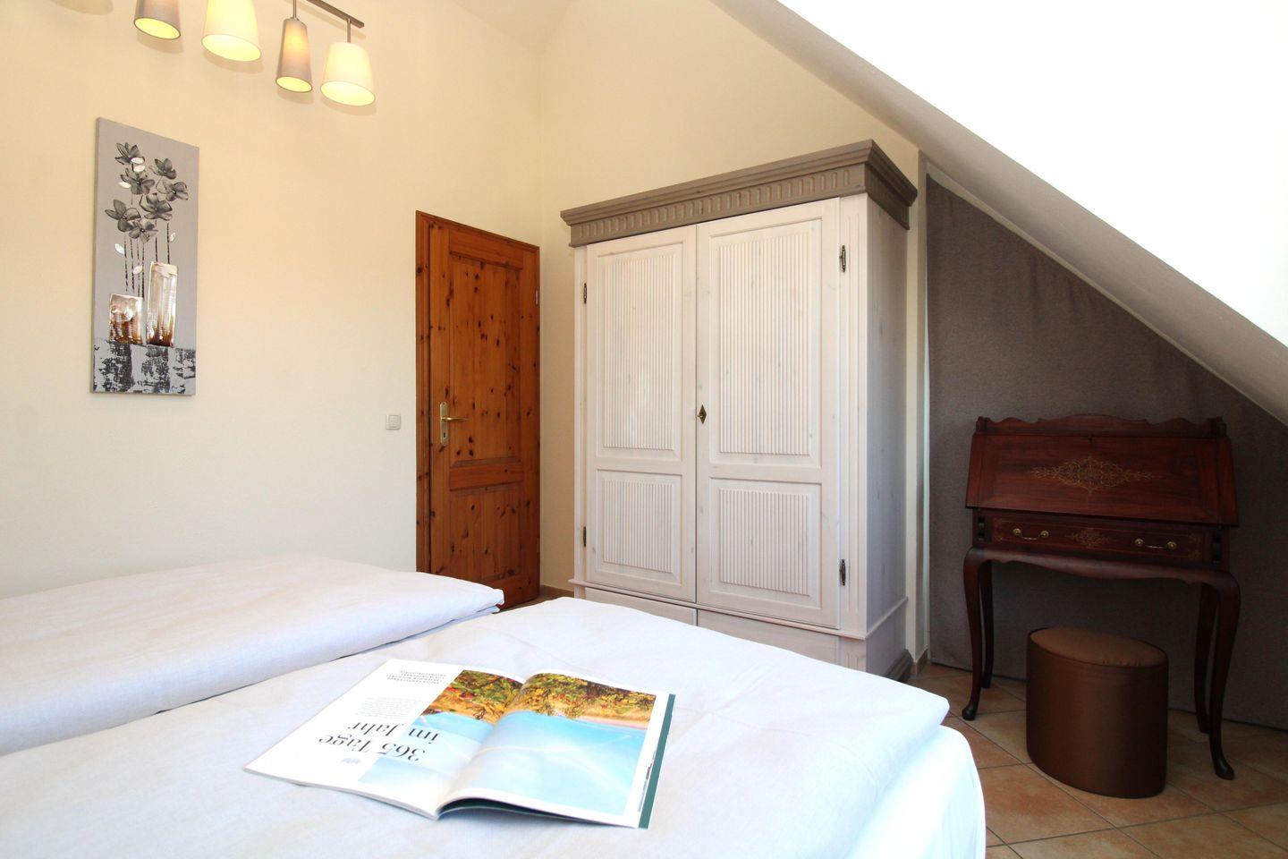 Das separate und zusätzliche 2. Schlafzimmer im Turm der Wohnung (Obergeschoss) ist etwas ganz Besonderes: von hier aus genießen Sie in 3 Richtungen freien Blick weit über die Dächer des Ostseebades, am Horizont sehen Sie die vor Ihnen liegende Ostsee. Dieses Schlafzimmer verfügt ebenfalls über ein bequemes Boxspringbett (180 cm x 200 cm), Nachttische mit Nachttischlampen sowie einen kleinen Einbau-Kleiderschrank.