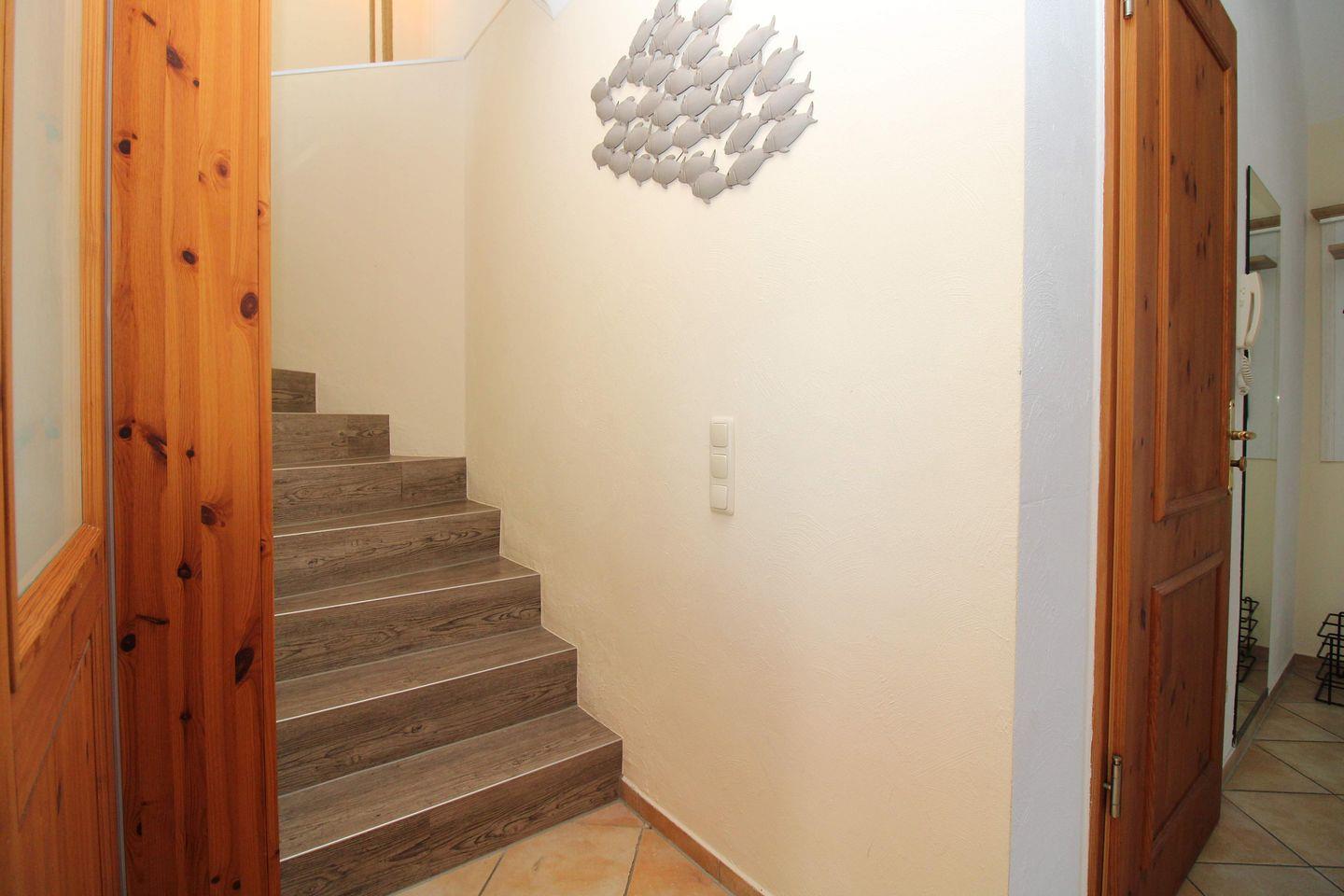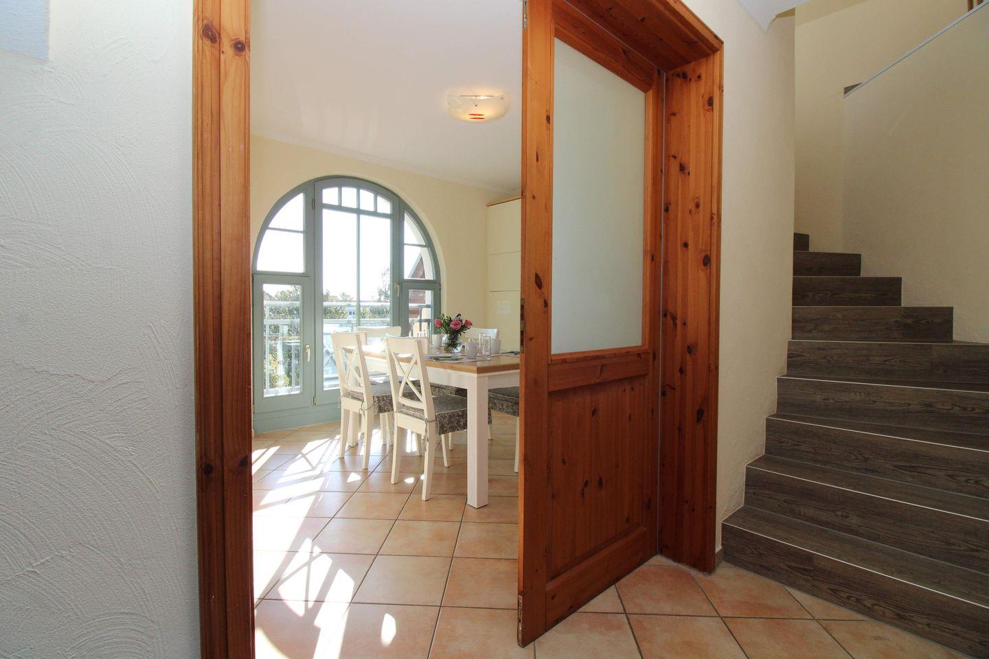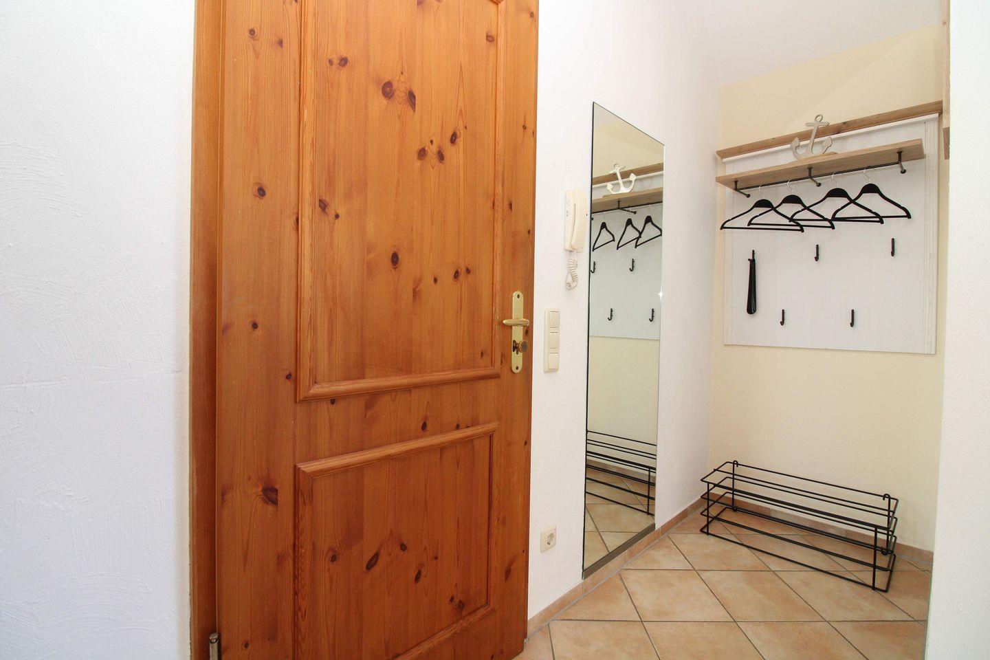 Vom geräumigen Eingangsbereich mit großer Garderobe, Wandspiegel und Schuhablage erreichen Sie bequem alle Räume Ihrer Ferienwohnung.