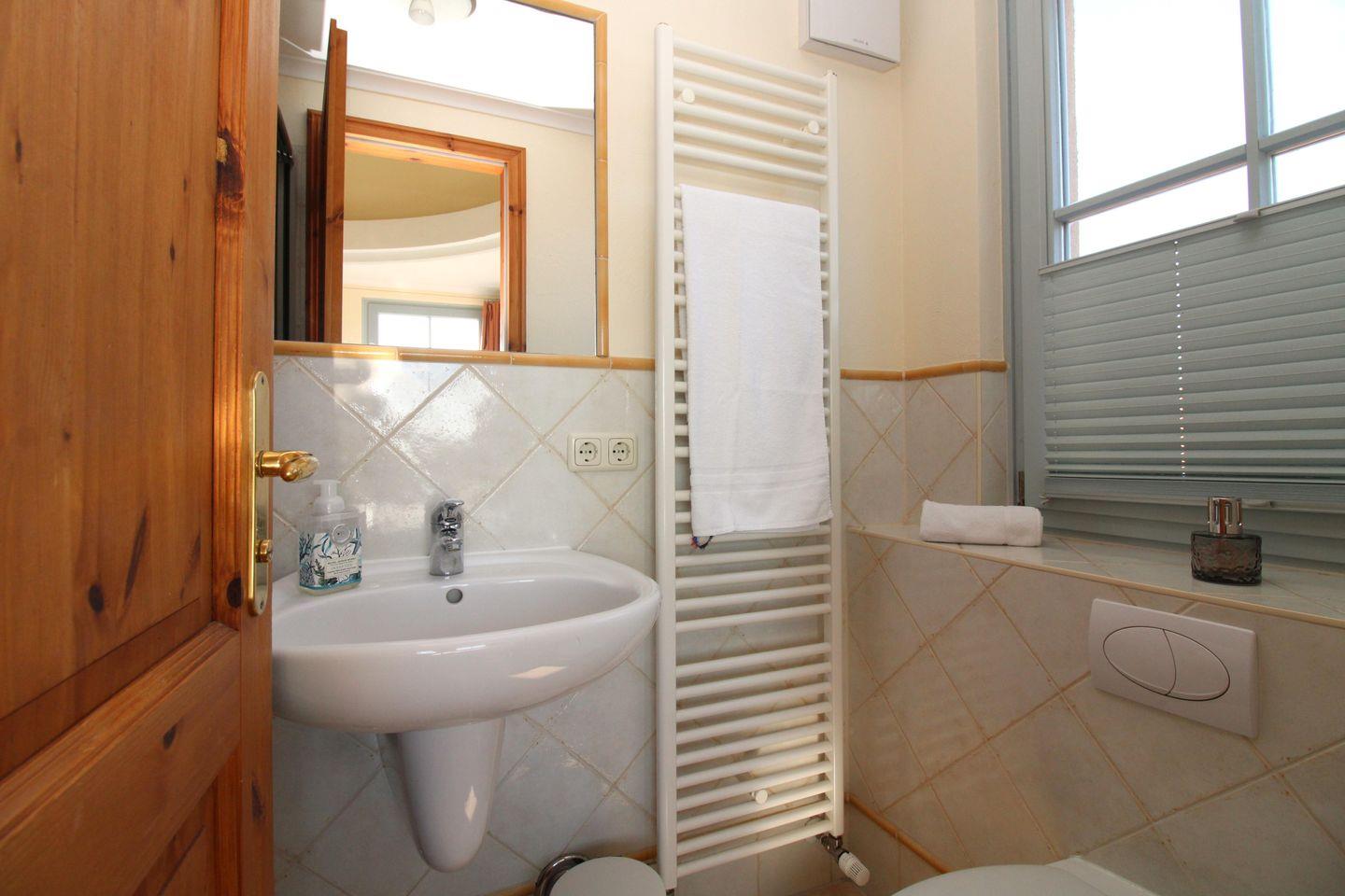 Das mediterran anmutende 1. Badezimmer (mit Tageslicht / Fenster) verfügt über eine Dusche mit niedrigem Einstieg, Waschbecken, Bidet, WC, ein Badezimmerregal, einen Handtuch-Heizkörper, Fußbodenheizung, Föhn sowie ausreichend Ablagemöglichkeiten.