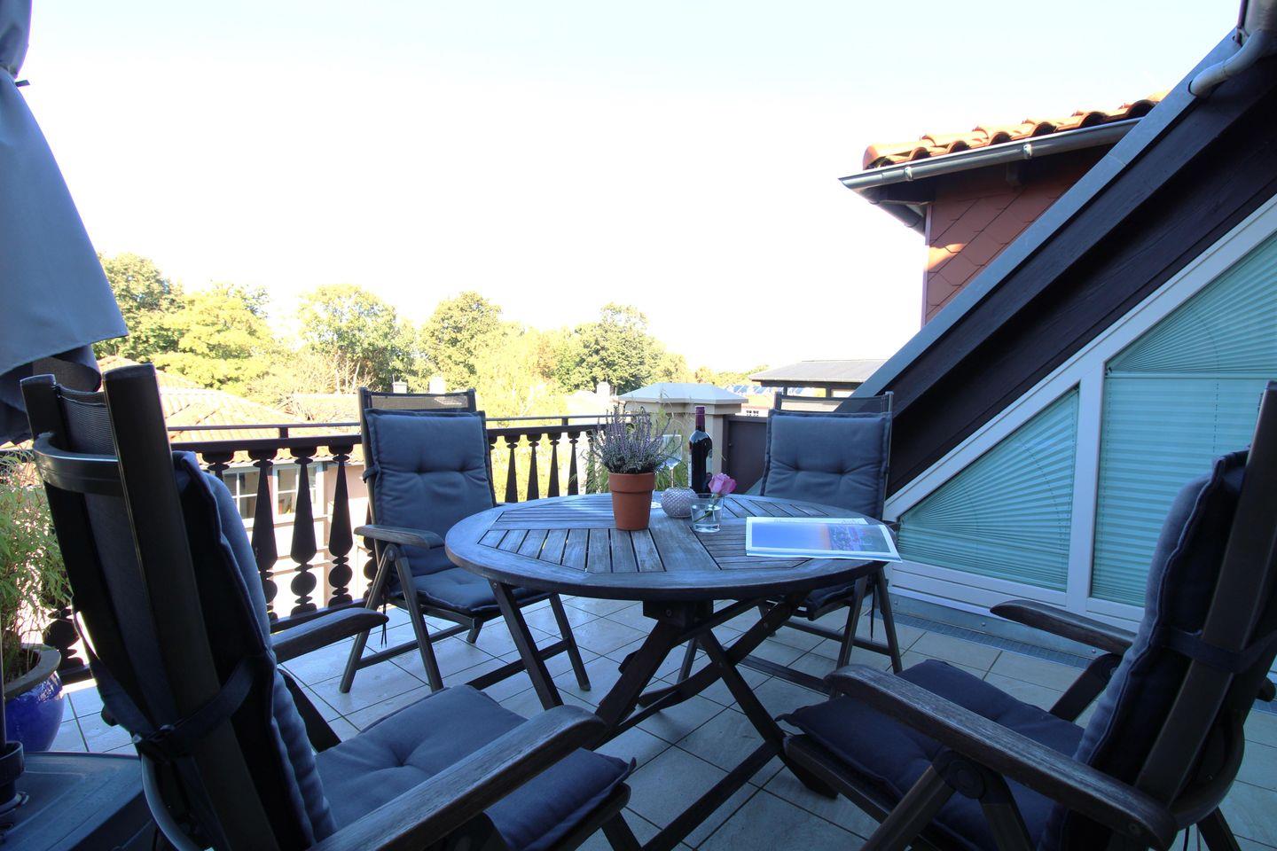 Das großzügige und lichtdurchflutete Wohnzimmer verfügt über eine bequeme Couch, 2 Sessel, einen Couchtisch sowie ein Sideboard. Vom Wohnzimmer aus haben Sie direkten Zugang zu der ca. 10 m² großen und sonnigen Dachterrasse (nach Süden und Westen ausgerichtet) mit Balkonmöbeln und Sonnenschirm. Hier sitzen Sie entspannt und gemütlich mit Blick über die Dächer und ins Grüne und können abends bei einem guten Glas Wein in Ruhe die lauen Sommernächte genießen!