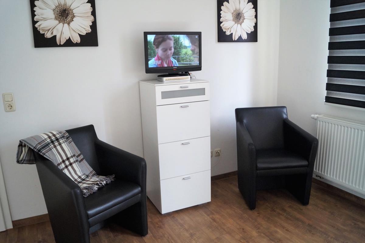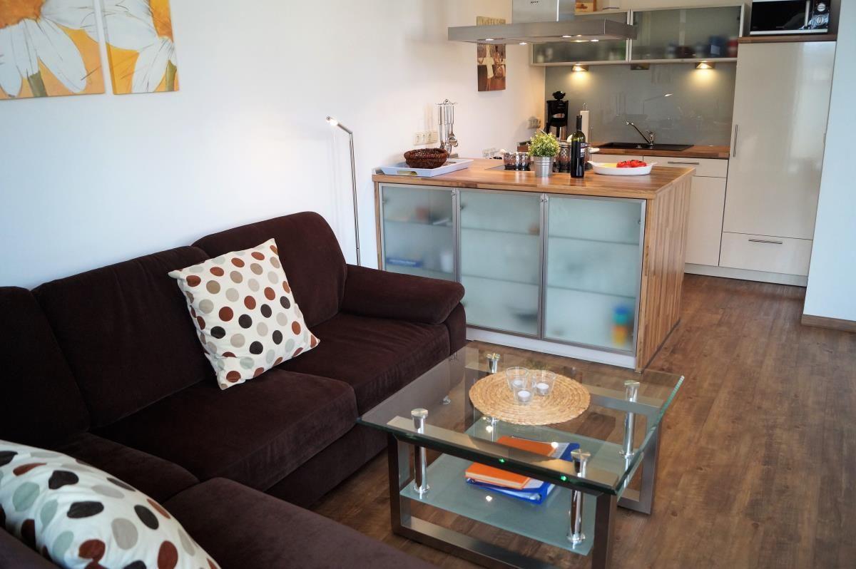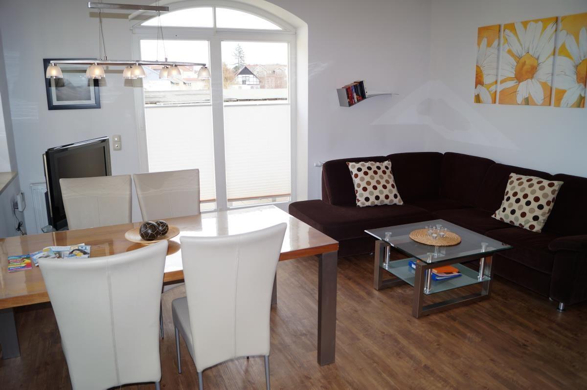 Herzstück der Ferienwohnung ist das großzügige Wohnzimmer mit der offenen Wohnküche. Große Fenster sorgen den ganzen Tag für eine helle und freundliche Atmosphäre. Dazu trägt auch die bis ins Dach geöffnete Zimmerdecke bei. Vom Wohnzimmer aus gelangt man auf den möblierten Balkon. Auch für die Unterhaltung am Abend ist gesorgt: Ein großer LED-TV im Wohnzimmer mit DVD-Player lädt zu langen Film-Abenden ein. Die Küche ist komplett ausgestattet und lässt keine Wünsche offen. Der WLAN-Anschluss kann kostenfrei genutzt werden. Damit Sie im Urlaub keinen Parkplatz suchen müssen, befindet sich direkt hinter dem Haus ein PKW-Stellplatz. Fahrräder können trocken und sicher auf dem Grundstück abgestellt werden.