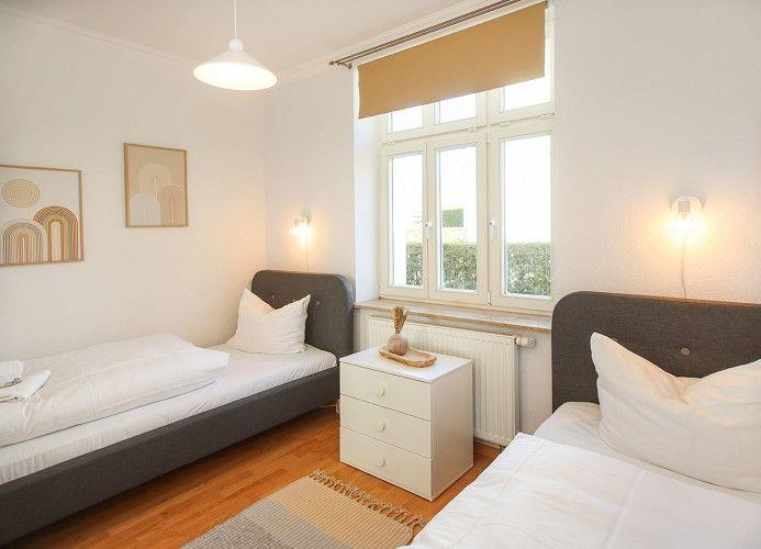Das eine, größere Schlafzimmer verfügt über ein schönes Doppelbett und einen geräumigen Kleiderschrank. In der praktischen Kommode findet ein Teil der Urlaubsgarderobe zusätzlichen Stauraum. In dem zweiten separaten Schlafraum stehen zwei Einzelbetten, die für jüngere wie ältere Gäste gleichermaßen gut geeignet sind.