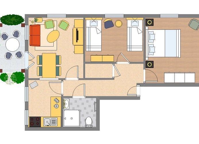 Auf einer Gesamtwohnfläche von ca. 65m² stehen dem Gast zwei separate Schlafzimmer, ein Wohnbereich mit praktischer Durchreiche, eine schöne Landhausküche sowie ein Badezimmer zur Verfügung. Vom Wohnzimmer aus gelangt man auf die schöne geschützte und teilüberdachte Terrasse. Eine schöne Sitzecke sowie ein Esstisch ermöglichen gemütliche Urlaubs-Abende. Praktisch die Durchreiche zur Küche: hier kann das Geschirr auf kurzem Wege in die Küche gebracht werden. Diese ist so ausgestattet, dass Gerichte schnell und problemlos zubereitet werden können.