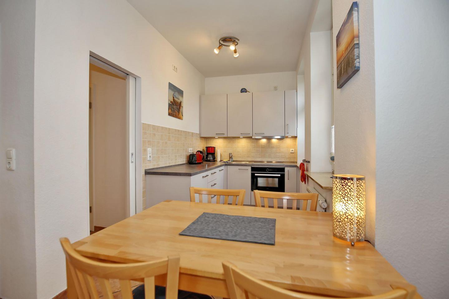 Die moderne Küchenzeile der Ferienwohnung ist für dich mit einem Kühlschrank mit Gefrierfach, einer Mikrowelle, einem 4-Zonen-Cerankochfeld, einem Geschirrspüler und einem Backofen voll ausgestattet. Kleine Helfer, wie ein Wasserkocher, eine Kaffeemaschine sowie ein Toaster vervollständigen die Kücheneinrichtung.