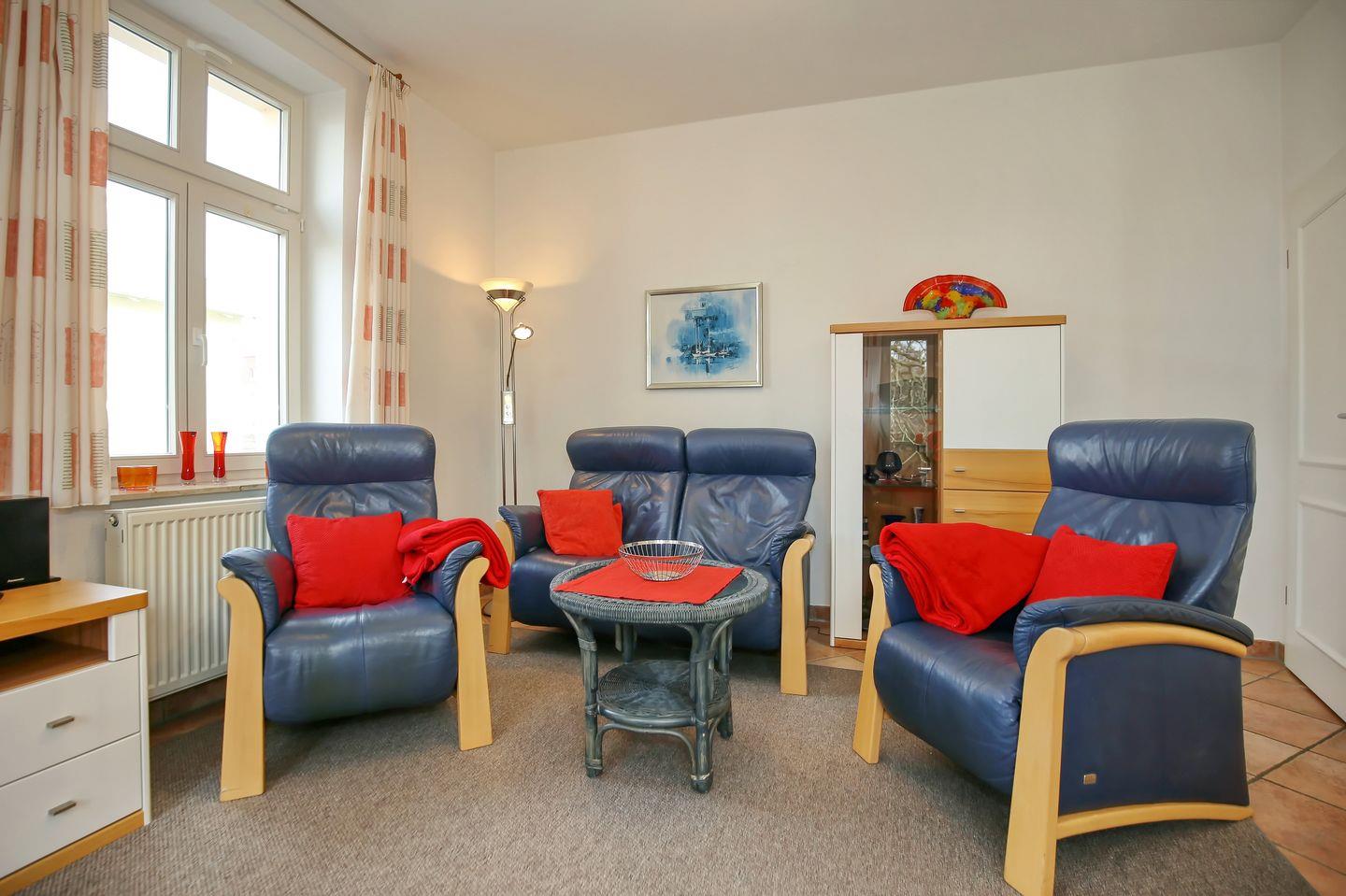 Der gemütliche Wohnbereich ist für dich mit einer Couch, zwei Sesseln, einem Couchtisch, einem Flachbild-TV sowie einem DVD-Player eingerichtet. Den vorhandenen WLAN-Anschluss nutzt du kostenlos. Genieße hier gesellige Abende. Der Essbereich bietet dir mit einem großen Tisch und 4 Stühlen viel Platz für gemeinsame Mahlzeiten.