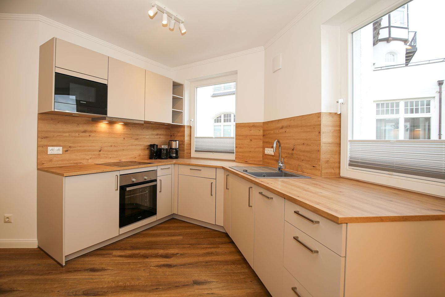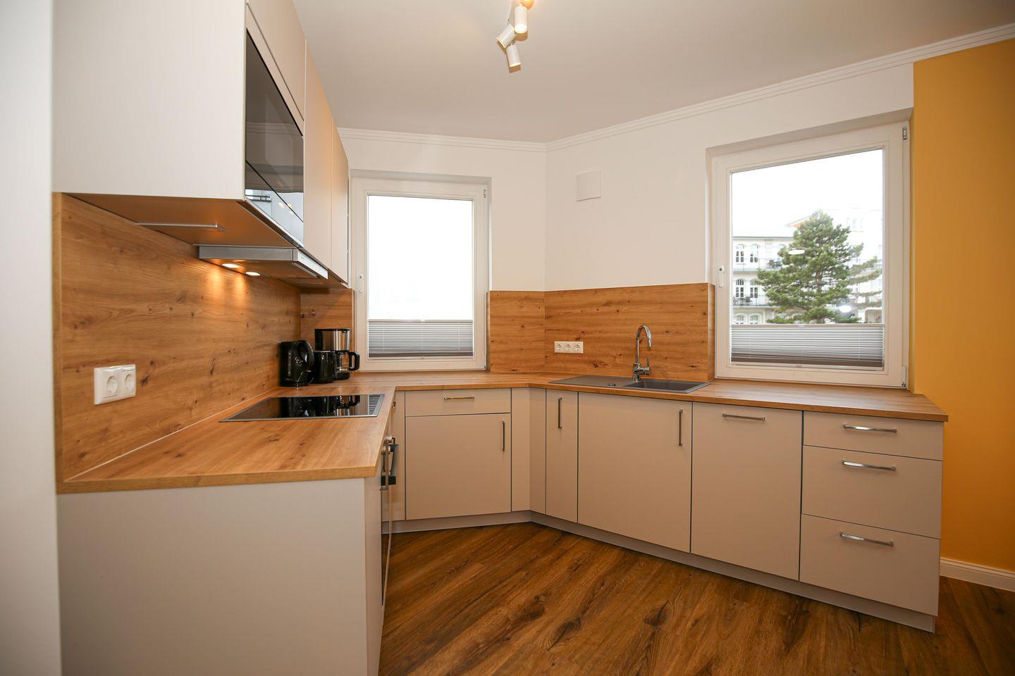 Die angrenzende offene Küchenzeile ist mit einem Kühlschrank mit Gefrierfach, einem Geschirrspüler, einem 4-Platten-Cerankochfeld, einer Mikrowelle und einem Backofen voll ausgestattet. Die Küchenausstattung wird komplettiert durch einen Toaster, eine Kaffeemaschine und einen Wasserkocher. Von hier aus hast du ebenfalls einen Blick auf die Ostsee.