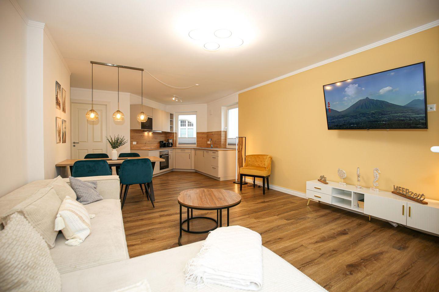Der Wohnbereich der Ferienwohnung ist für dich mit einer gemütlichen Couch und einem Flachbild-TV eingerichtet. Der Essbereich ist im Wohnbereich integriert und bietet dir Platz für gemeinsame Mahlzeiten.