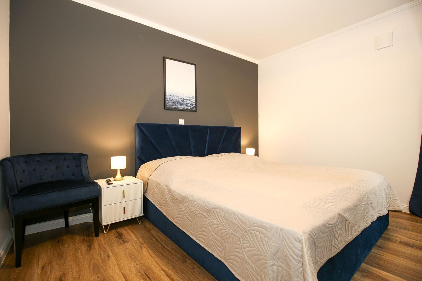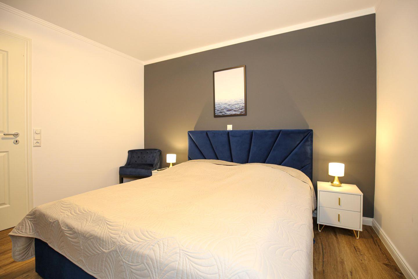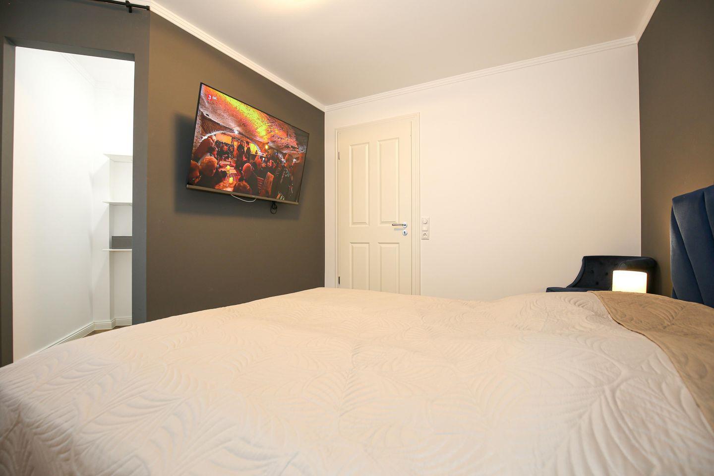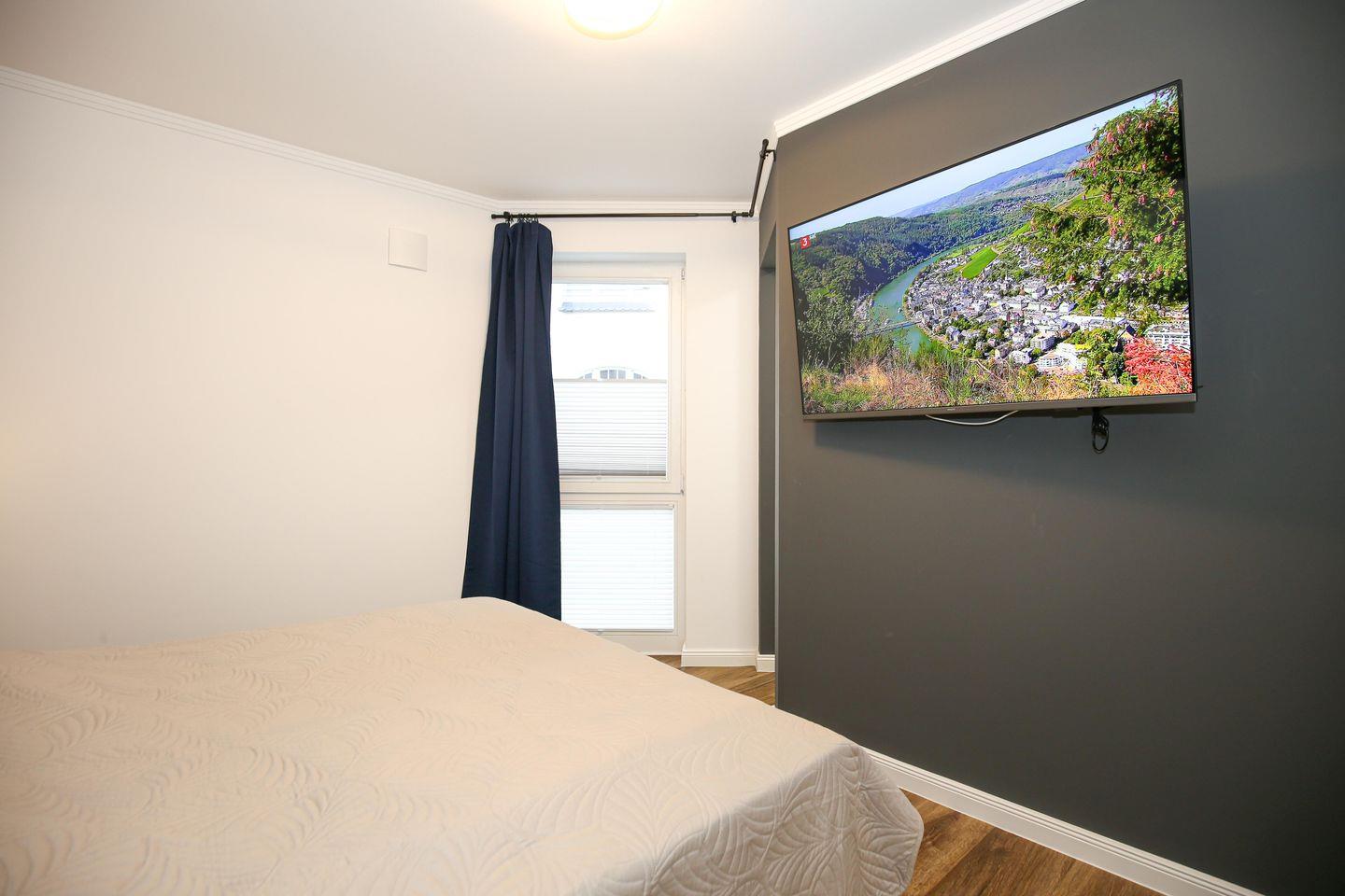 Das Schlafzimmer der Ferienwohnung ist mit einem komfortablen Boxspringbett ( 180 x 200 cm) eingerichtet. Für deine Garderobe bietet der Kleiderschrank ausreichend Stauraum. Zudem erwartet dich hier ein zweiter Flachbild-TV. Zur Verdunklung dienen blickdichte Vorhänge an den Fenstern.