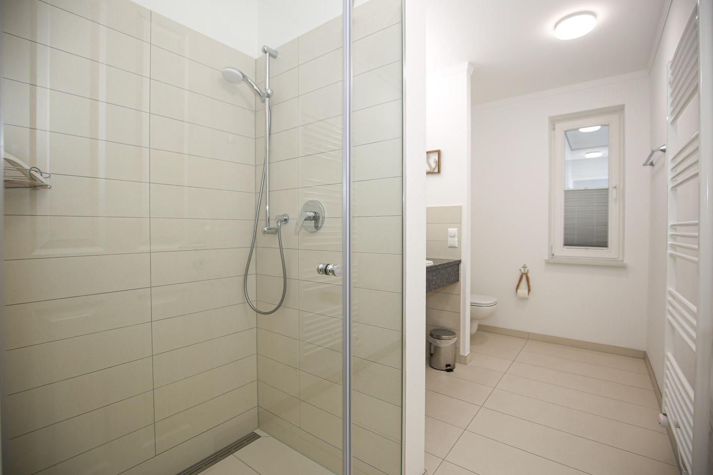 Das Tageslichtbad mit ebenerdiger Dusche ist mit einem großzügigen Waschtisch und einem Föhn ausgestattet.