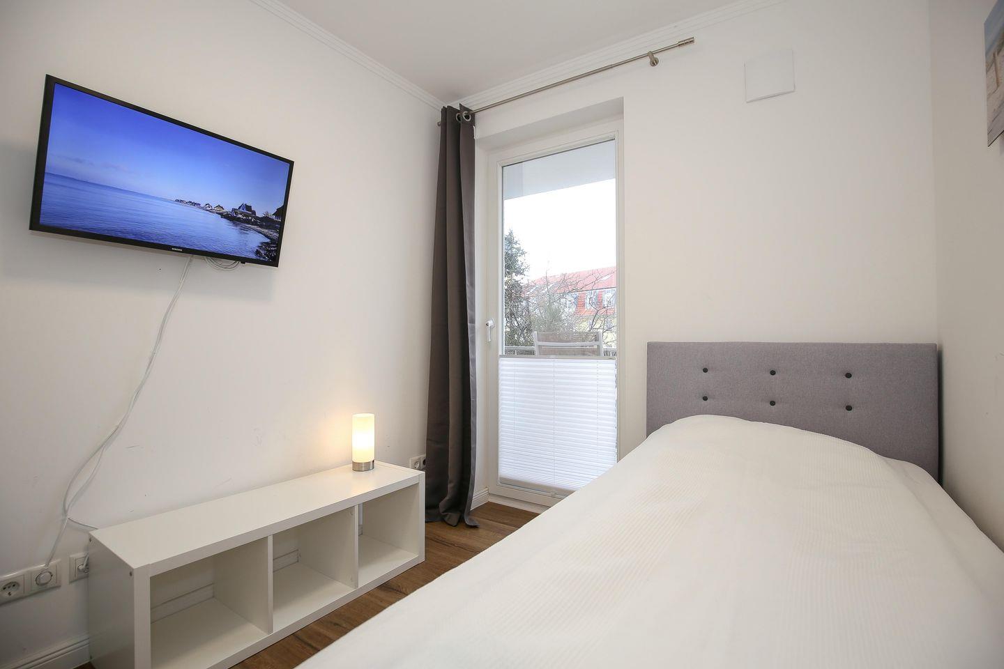 Das Schlafzimmer der Ferienwohnung ist mit einem komfortablen Boxspringbett ( 180 x 200 cm) eingerichtet. Für deine Garderobe bietet der Kleiderschrank ausreichend Stauraum. Zudem erwartet dich hier ein zweiter Flachbild-TV. Zur Verdunklung dienen blickdichte Vorhänge an den Fenstern.