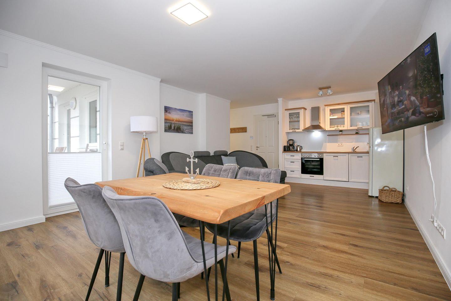 Die angrenzende offene Küchenzeile ist mit einem Kühlschrank mit Gefrierfach, einem Geschirrspüler, einem 4-Platten-Cerankochfeld und einem Backofen voll ausgestattet. Die Küchenausstattung wird komplettiert durch einen Toaster, eine Kaffeemaschine und einen Wasserkocher. Von hier aus hast du ebenfalls einen Blick auf die Ostsee.