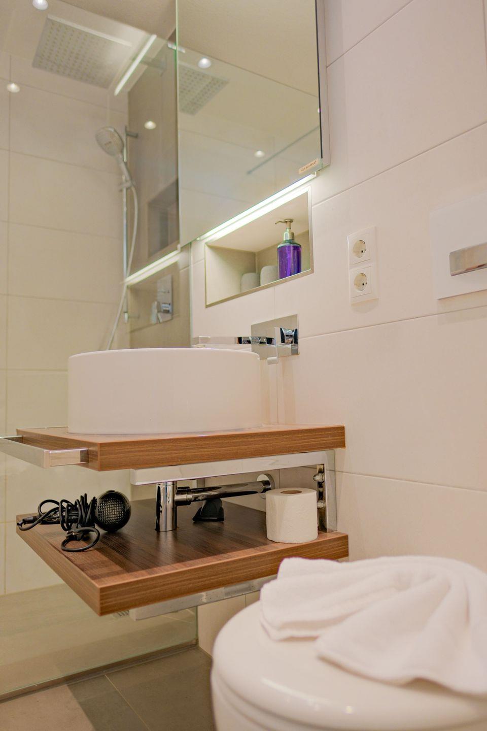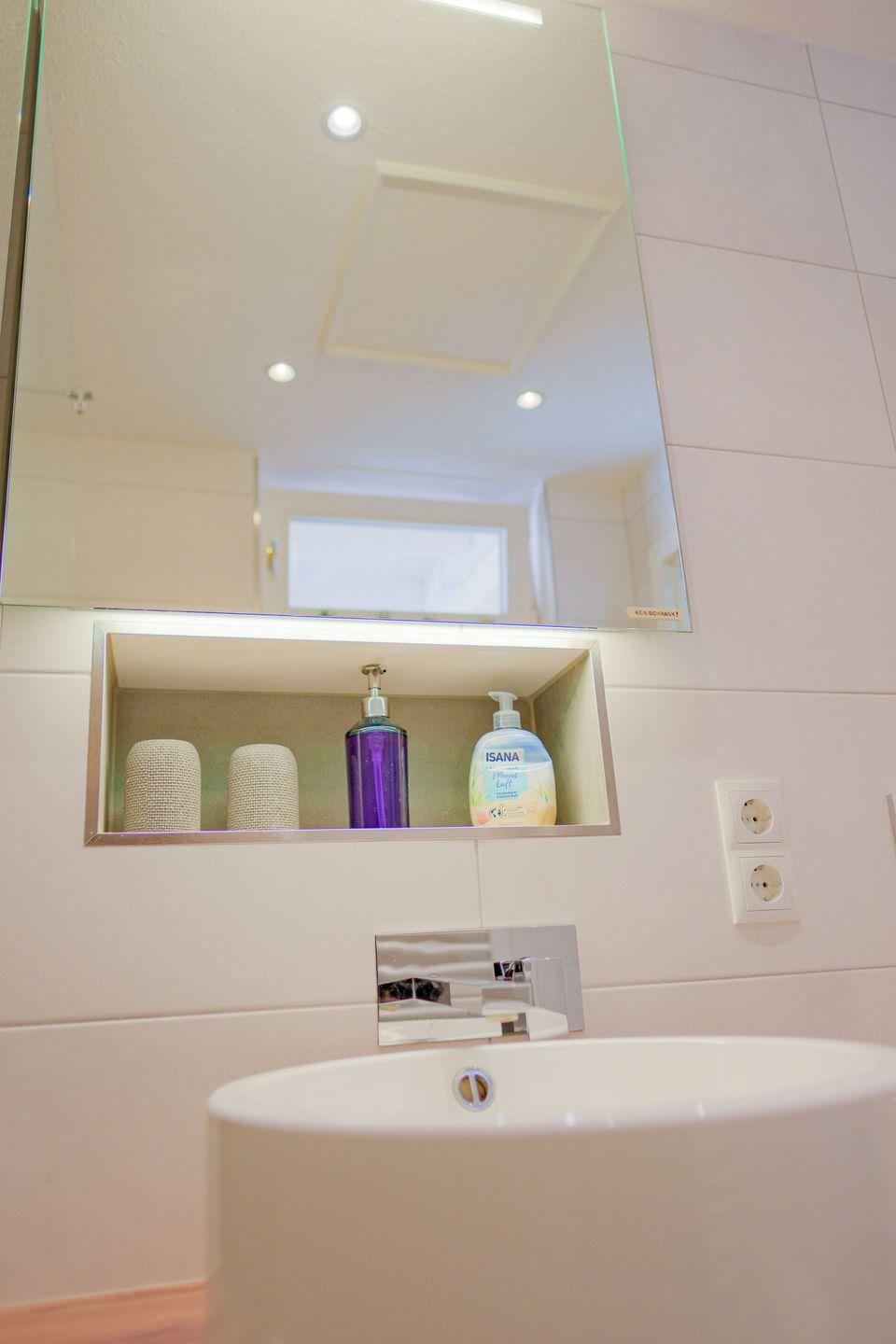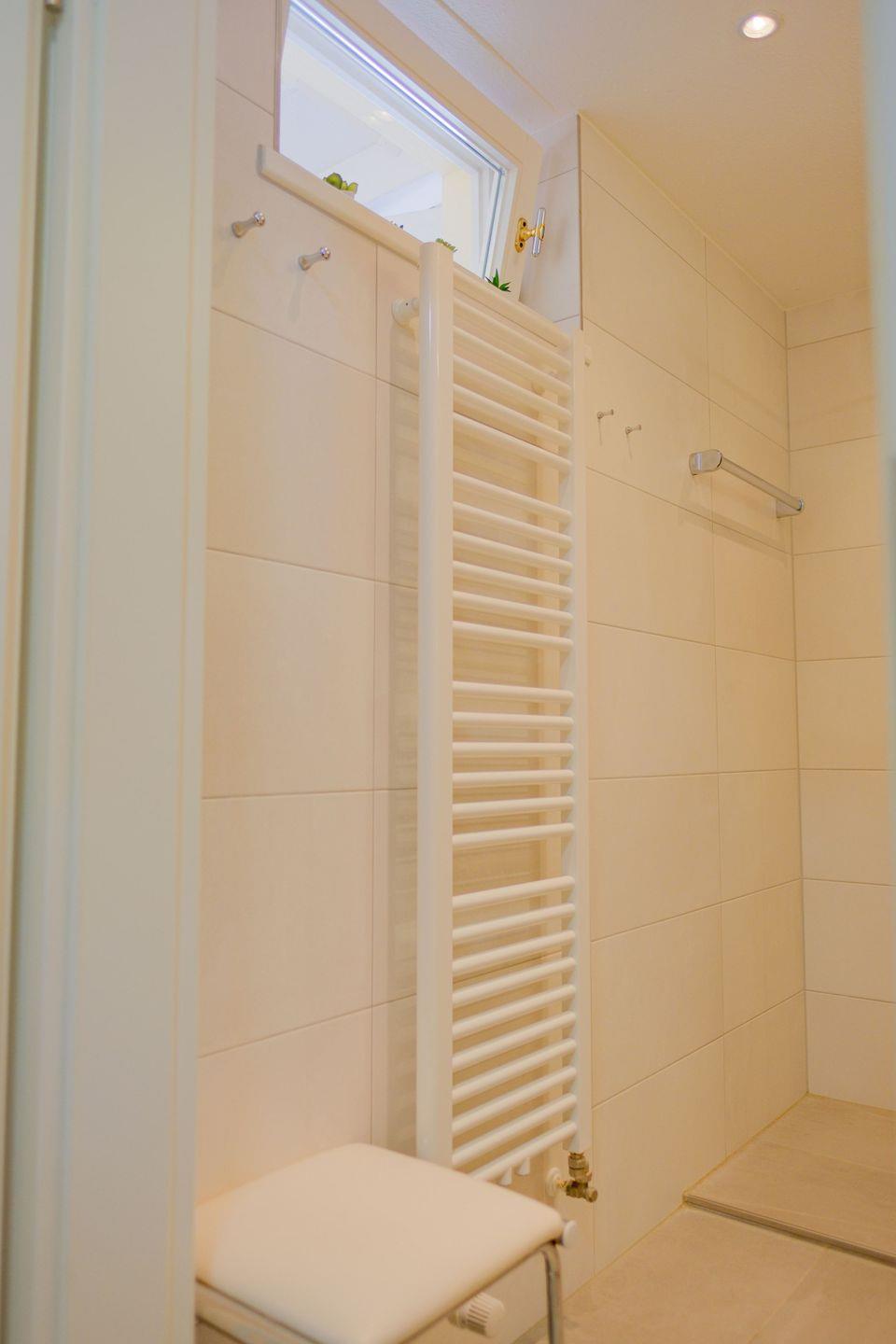 Das Badezimmer ist modern ausgestattet mit Dusche, WC und frischen Handtüchern. WLAN, Flachbild-TV, Waschmaschine und Trockner im Haus sorgen für zusätzlichen Komfort.