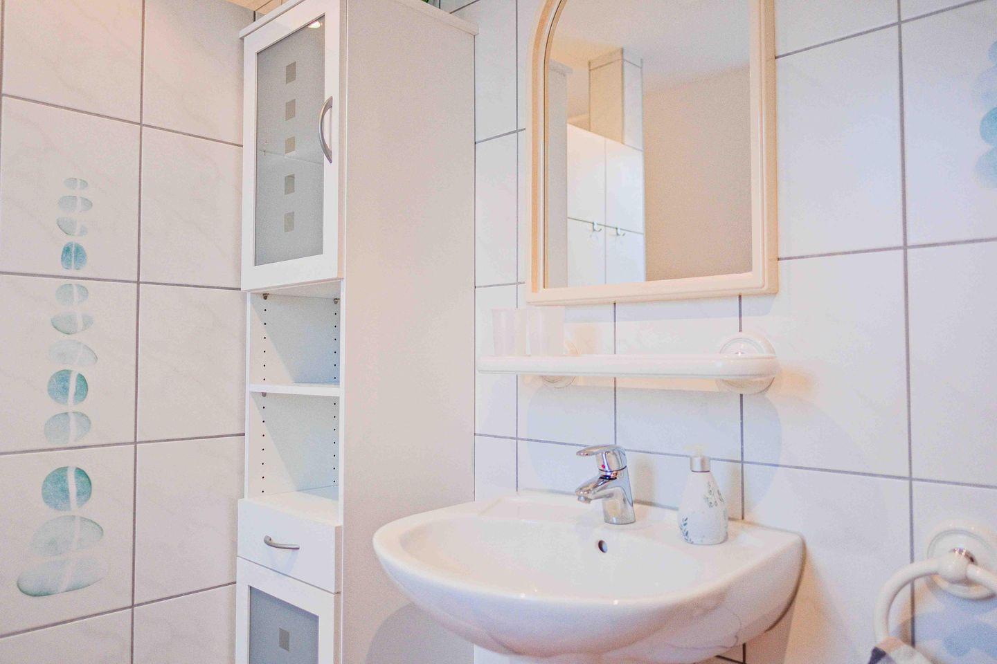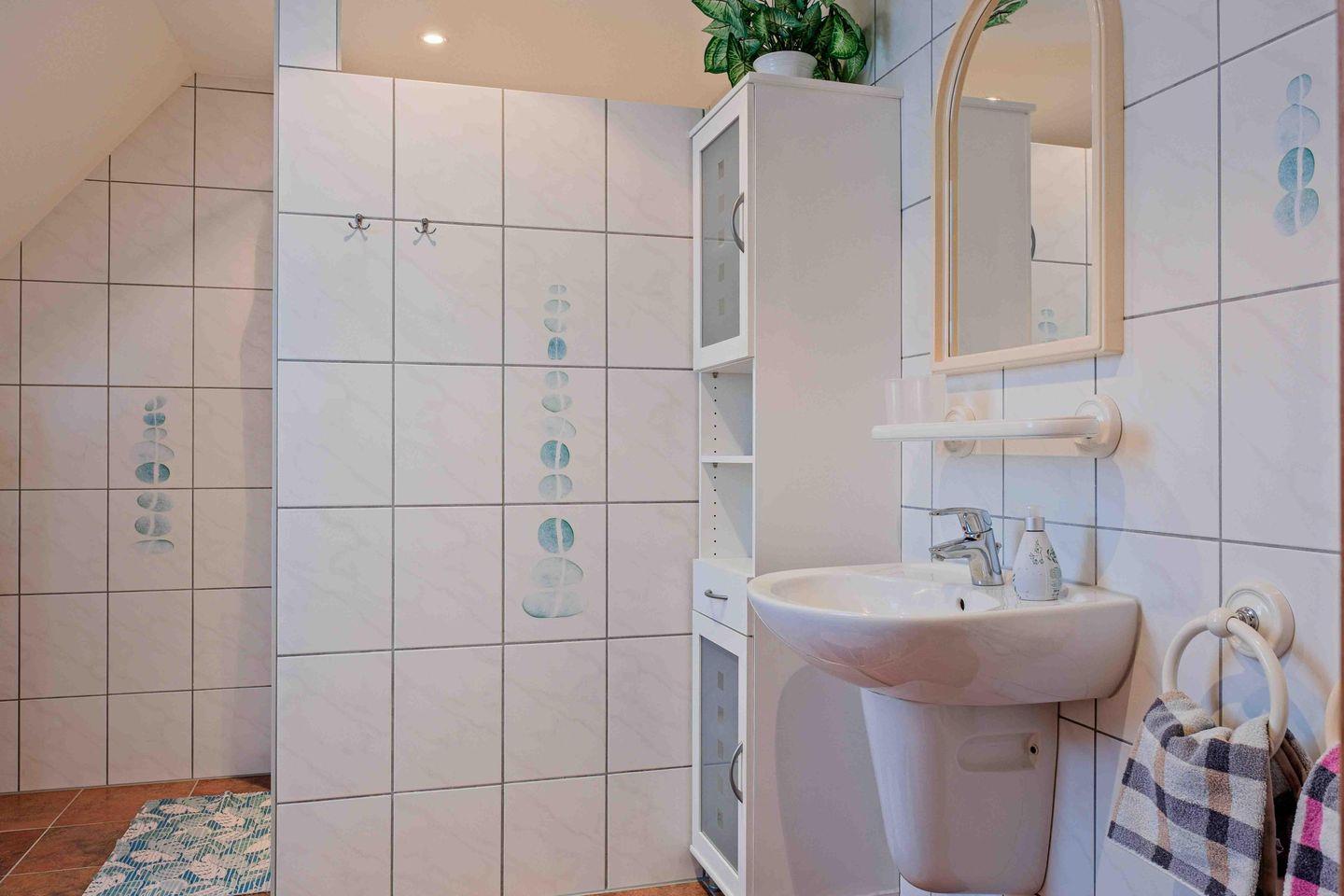 Das große Badezimmer überzeugt mit Dusche, WC und Waschtisch sowie viel Platz und Tageslicht – ideal auch für längere Aufenthalte.