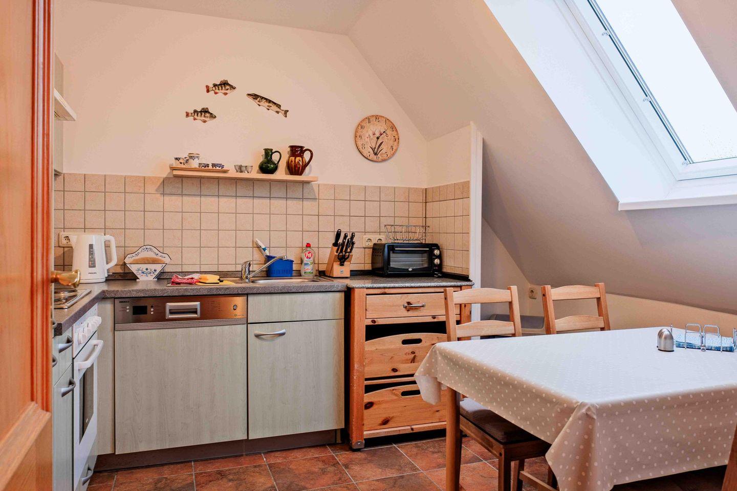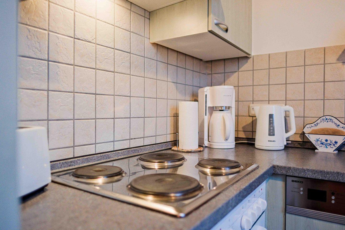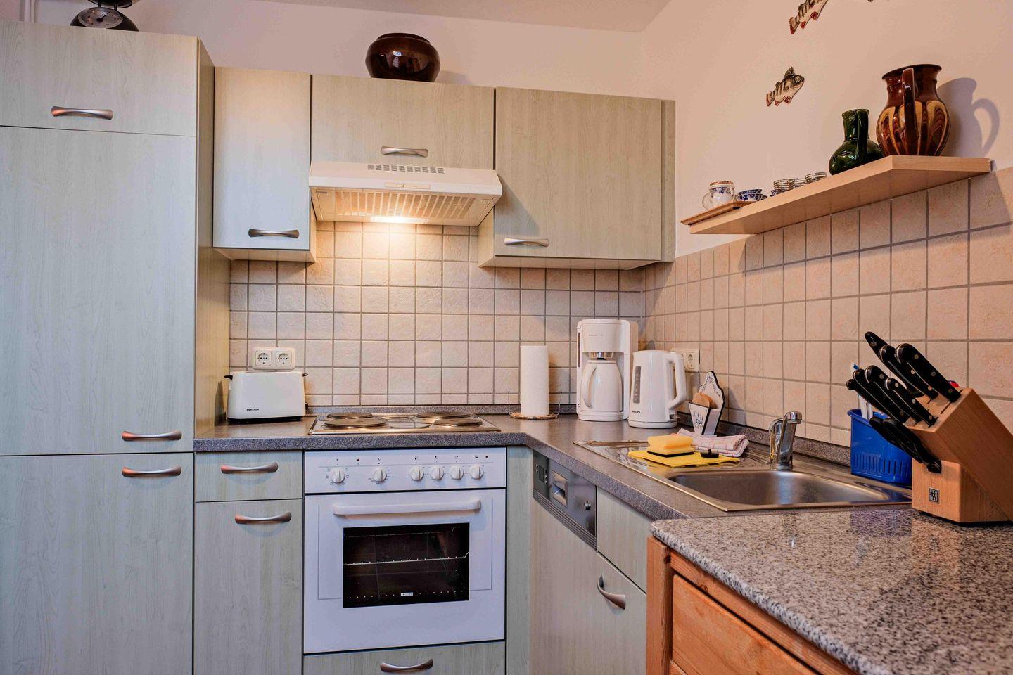 Die separate Küche ist funktional ausgestattet und bietet alles, was Sie für die tägliche Selbstversorgung benötigen. Ob gemeinsames Frühstück oder ein gemütliches Abendessen – hier starten und beenden Sie Ihren Urlaubstag ganz entspannt.