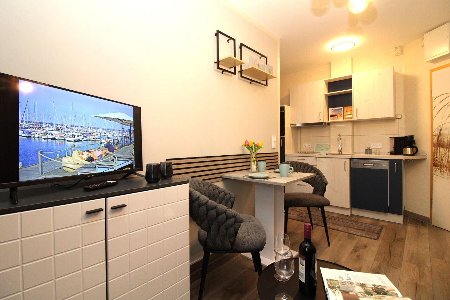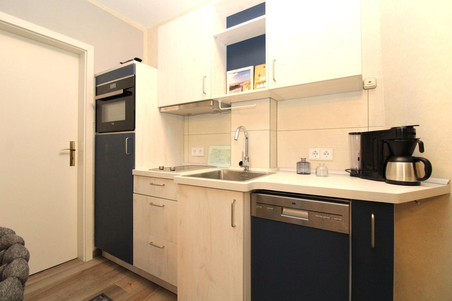 Die offene Küche beinhaltet eine voll ausgestattete Einbauküchenzeile mit 2-Zonen-Ceran-Kochfeld, Backofen, Dunstabzug, Kühlschrank mit Gefrierfach, Geschirrspülmaschine, Kaffeemaschine, Wasserkocher und Toaster. Die Küche ist mit Geschirr, Gläsern, Besteck und Töpfen komplett ausgestattet.
