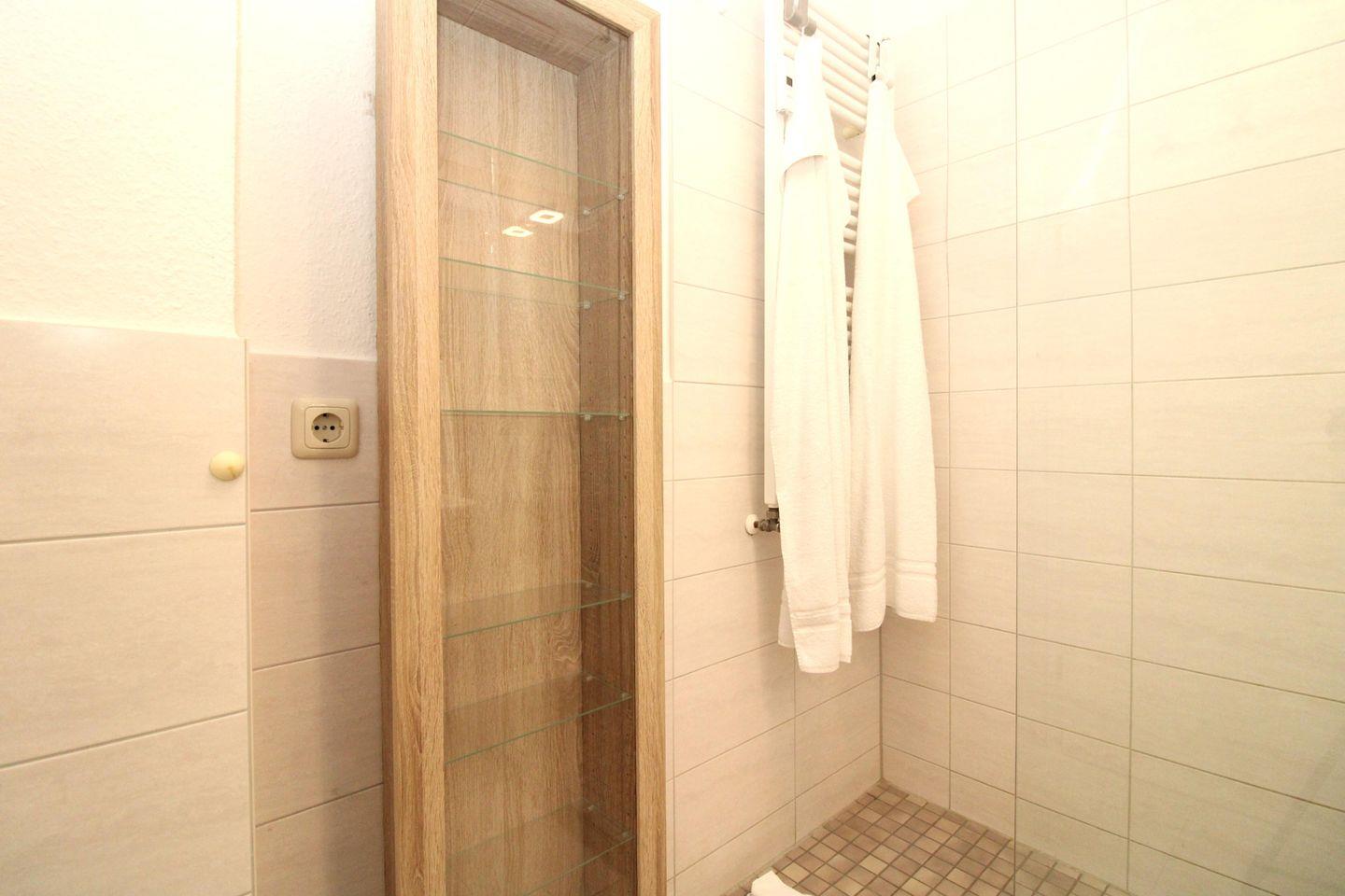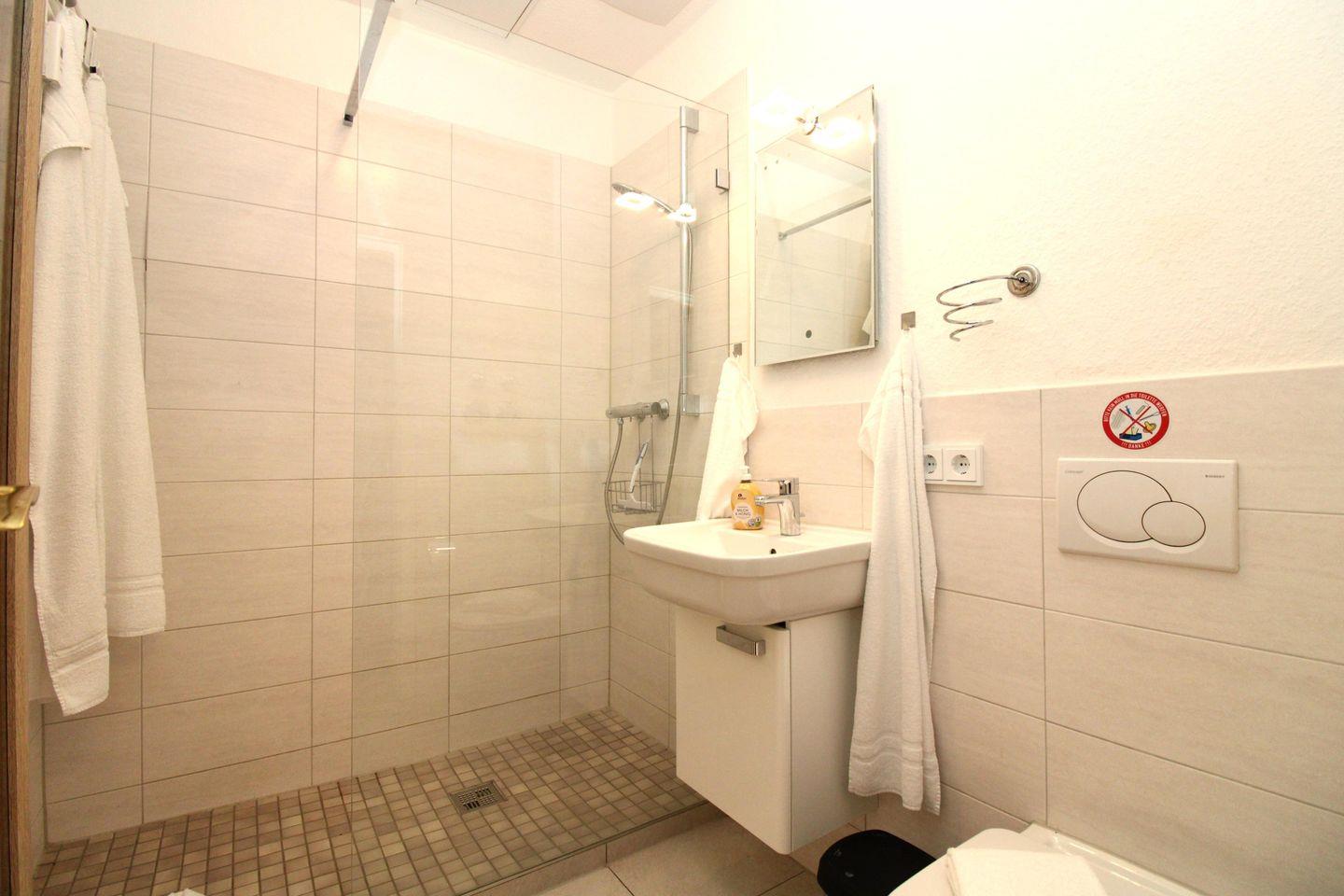 Das freundliche und moderne Badezimmer verfügt über eine begehbare Dusche mit bodengleichem, seniorenfreundlichem Einstieg, Waschbecken mit Unterschrank, WC, einen geräumigen Badezimmerschrank, Föhn sowie einen Handtuch-Heizkörper.