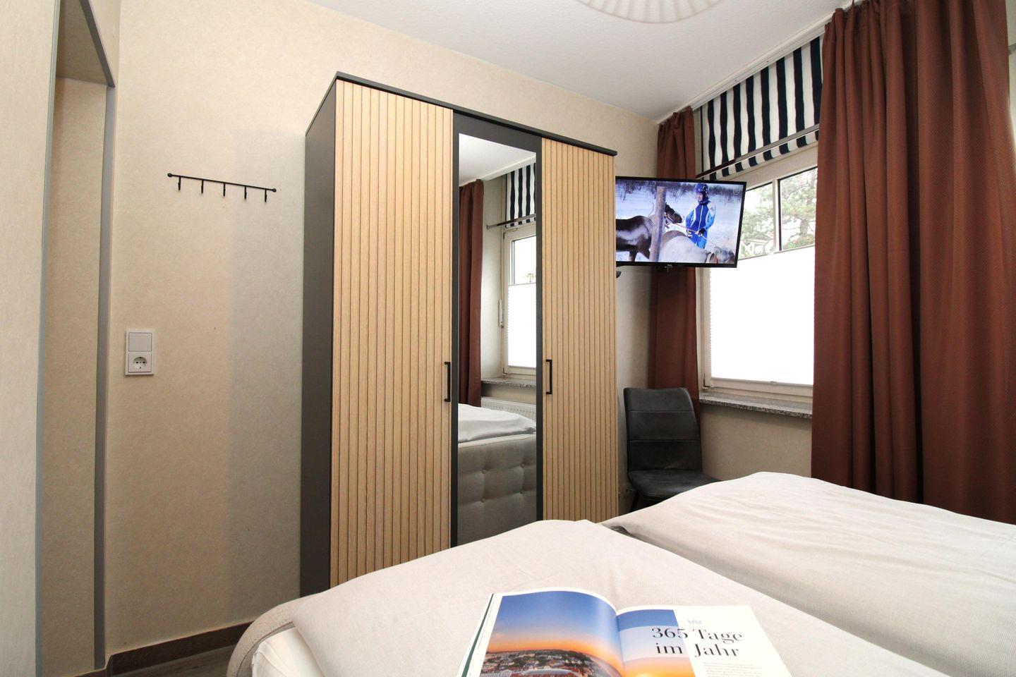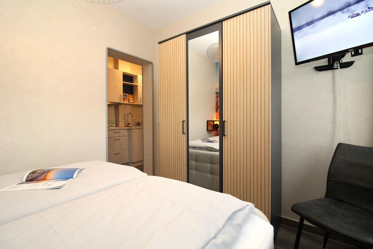 Das gemütliche Schlafzimmer ist mit einem bequemen Boxspring-Doppelbett (160 cm x 200 cm), Nachttischen mit Nachttischlampen, einem geräumigen Kleiderschrank sowie einem weiteren TV-Gerät eingerichtet.