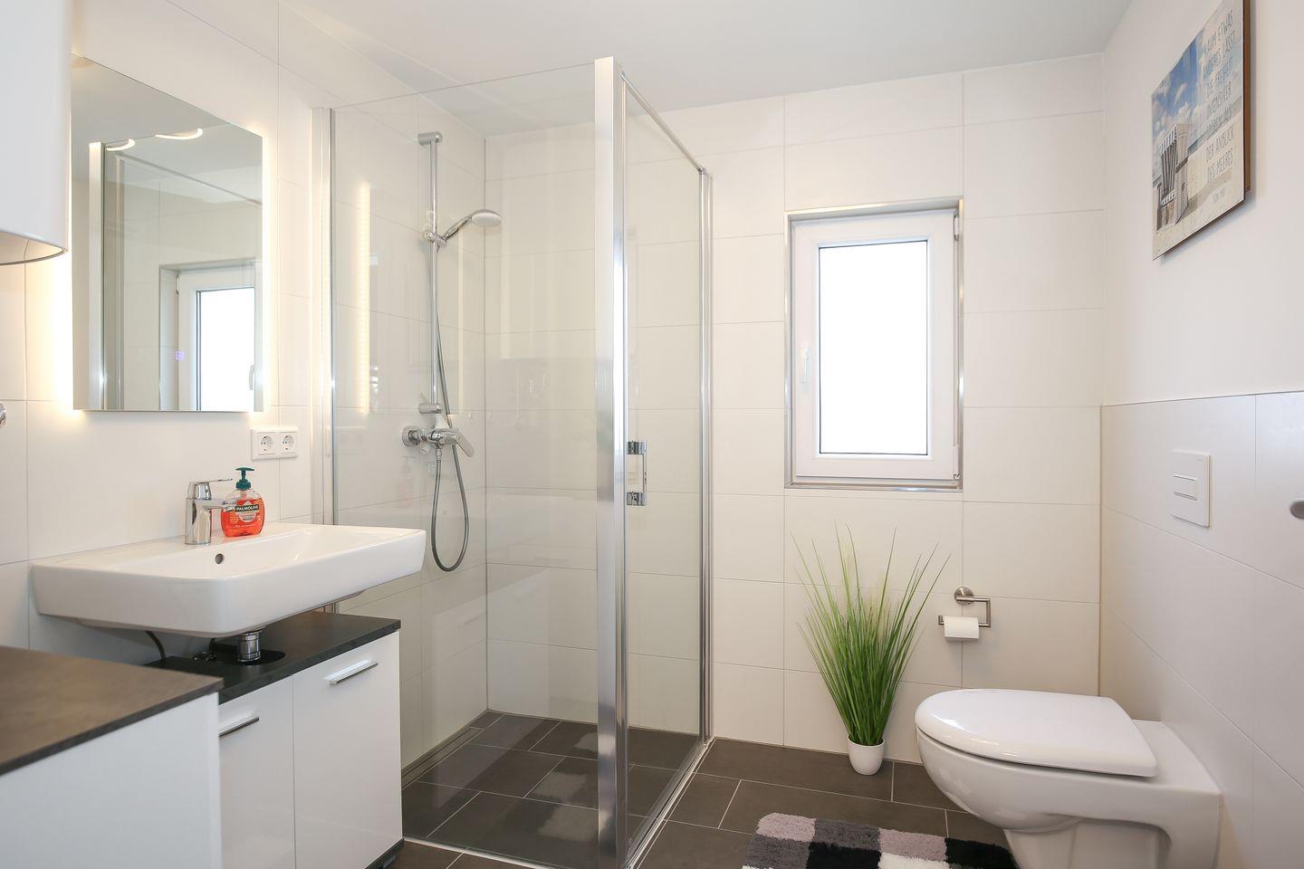 Das Bad mit ebenerdiger Dusche verfügt über ein WC, einen Spiegel, einen Waschtisch und ausreichend Ablagemöglichkeiten.