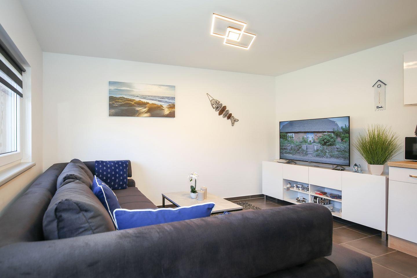 Im Wohnbereich des Bungalows laden eine moderne Doppelschlafcouch (150 × 200 cm), ein Flatscreen-TV sowie ein Radio zu gemütlichen Abendstunden ein. Zur Verdunkelung dienen Rollos.