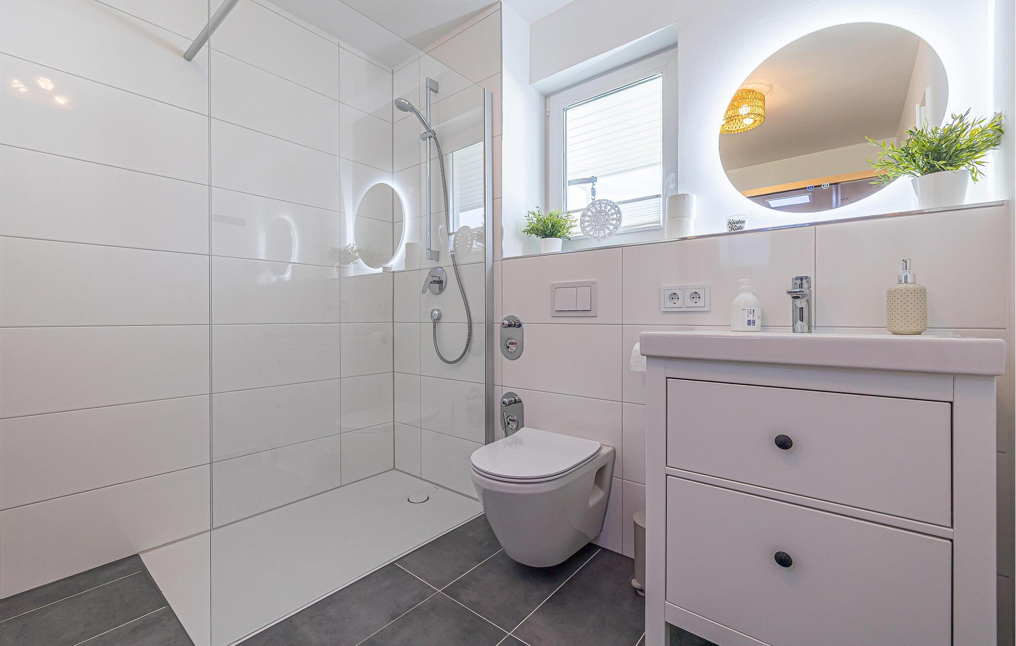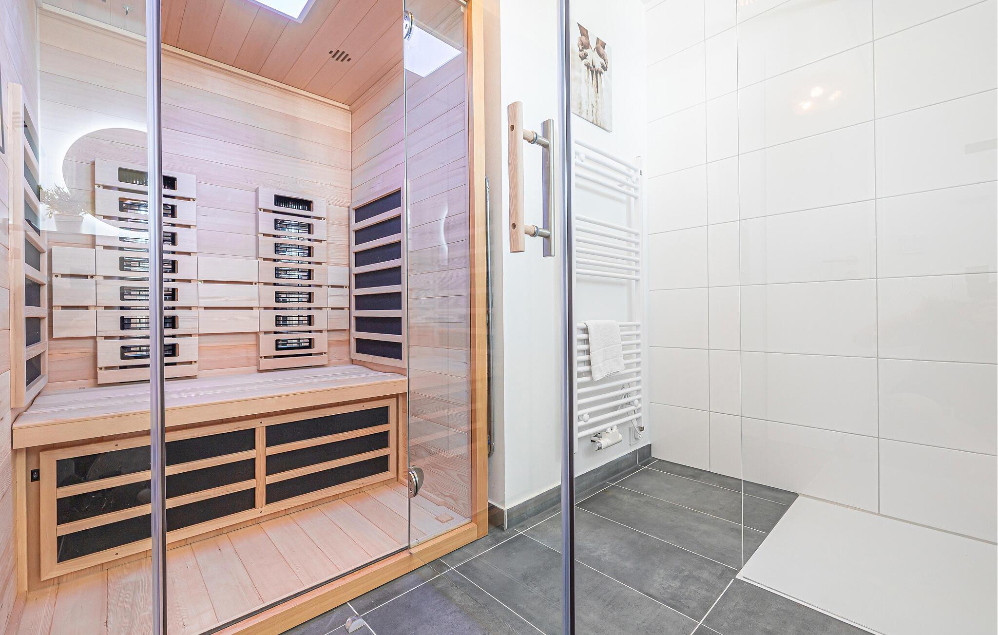 Ein Duschbad mit bodengleicher Dusche, InfrarotSauna (Wärmekabine) und Fußbodenheizung in der gesamten Ferienwohnung runden das Angebot ab und machen einen Urlaub in der kalten Jahreszeit attraktiv.