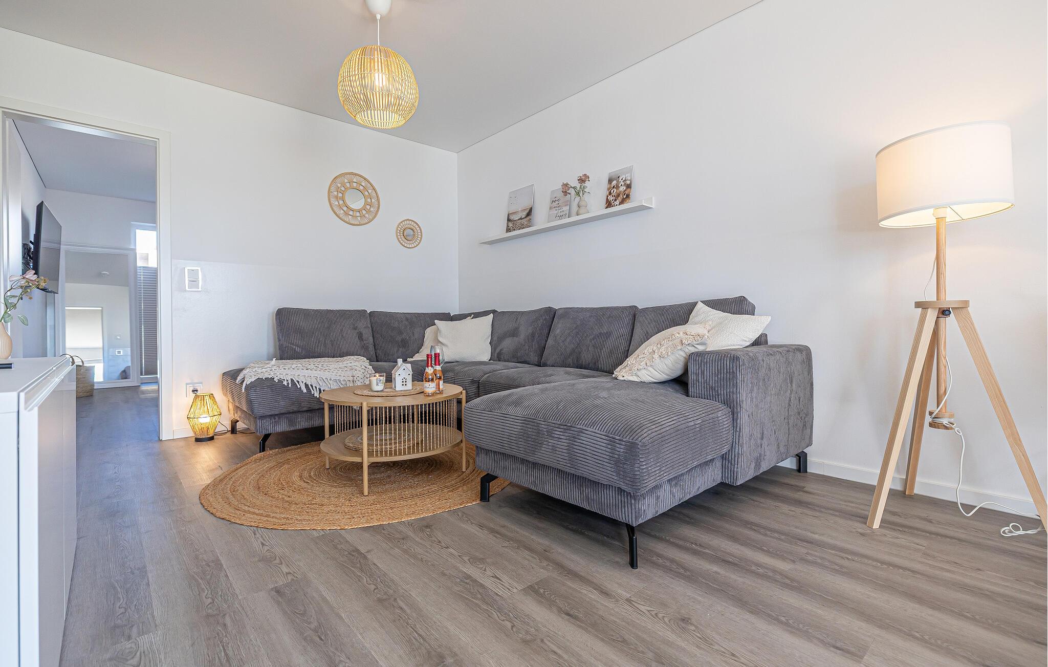 Bei Betreten der Ferienwohnung fällt einem direkt der gemütliche Wohnbereich ins Auge, welcher mit seiner kuscheligen Wohnlandschaft überzeugt. Die perfekte Oase für erholsame Familienabende.