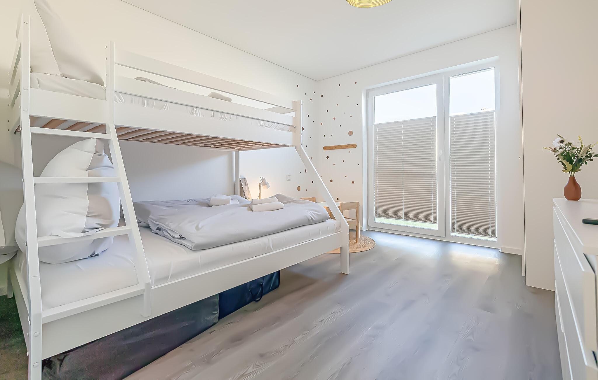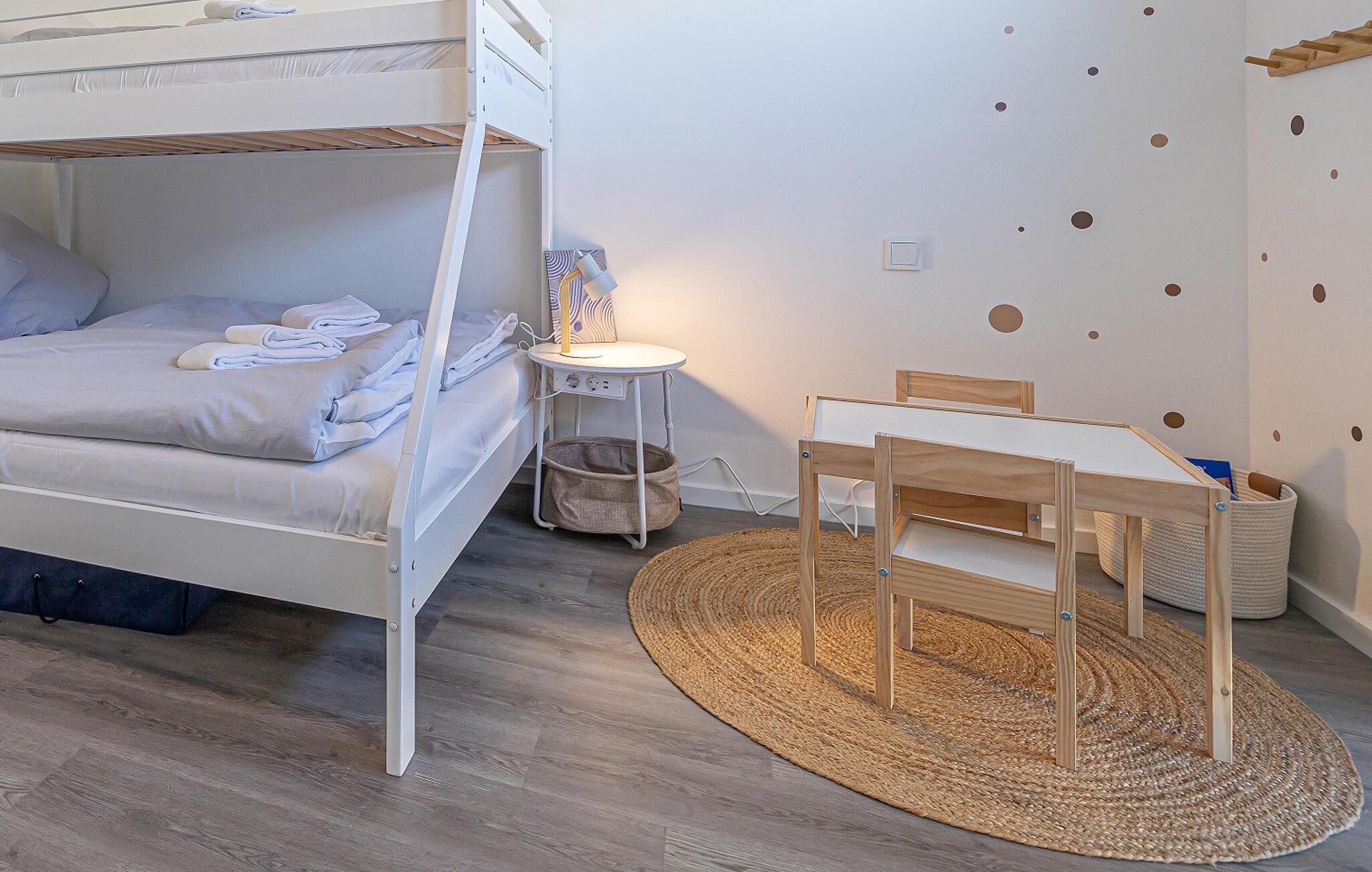 Zur Ferienwohnung gehören insgesamt zwei Schlafzimmer. Eines davon ist mit einem Doppelbett und eines mit einem Etagenbett mit drei Schlafplätzen, davon ein geräumiges Doppelbett unten und ein Einzelbett oben, ausgestattet. Hier befindet sich auch eine kleine Spielecke für Kinder.