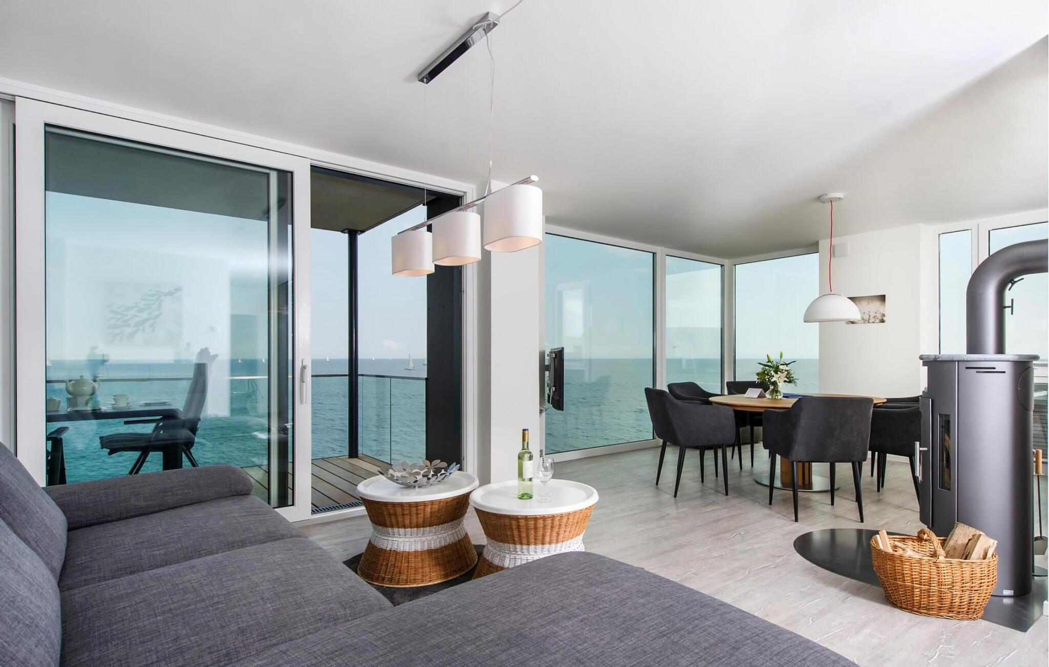 Lichtdurchflutet und mit einem phänomenalen Meerblick durch bodentiefe Fensterfronten gestaltet sich der Wohn- /Essbereich der modern eingerichteten Ferienwohnung Küstenküche. Am massiven Esstisch vorm Kaminofen, gemütlich auf dem Sofa oder aus der offenen und besonders hochwertigen Küche heraus, der Wasserblick auf die Weite der Ostsee stellt ein echtes Erlebnis dar und lässt klaren Gedanken freien Lauf. Von hier aus erreicht man den Balkon über den Wellen und befindet sich nun wahrhaftig AUF dem Meer.