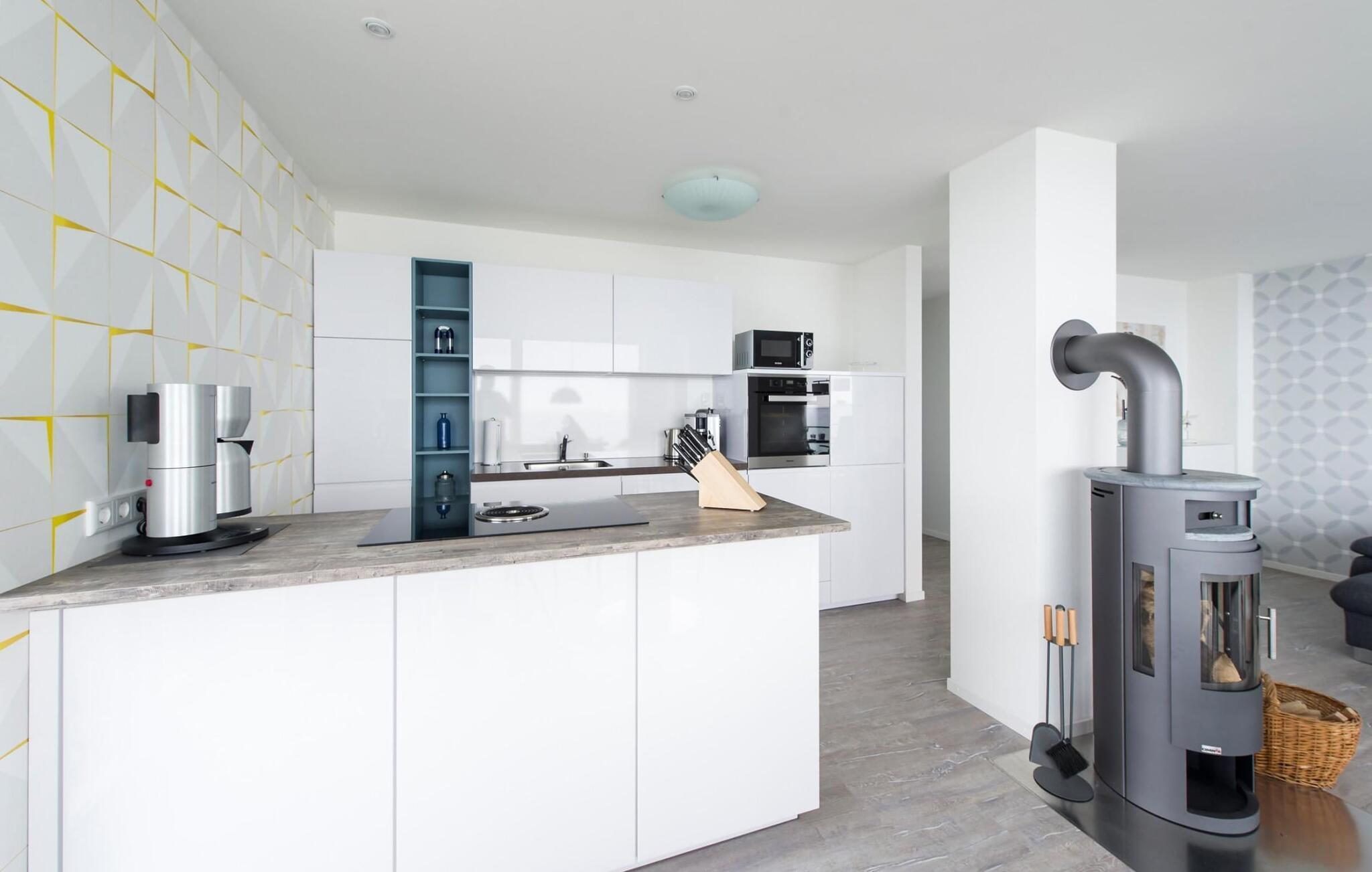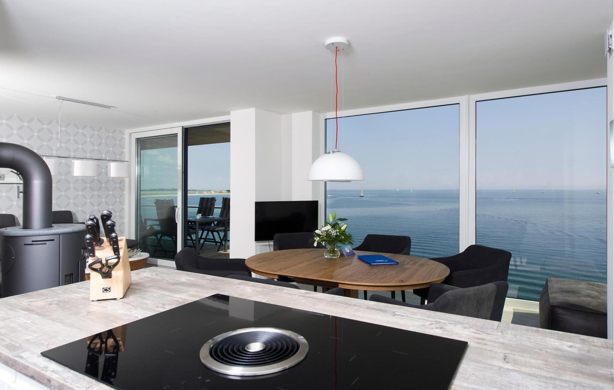 Unser Lieblingsplatz: Die voll ausgestattete Luxusküche in Insellösung vor Panorama Wasserfront, Kochlust mitten auf der Ostsee.