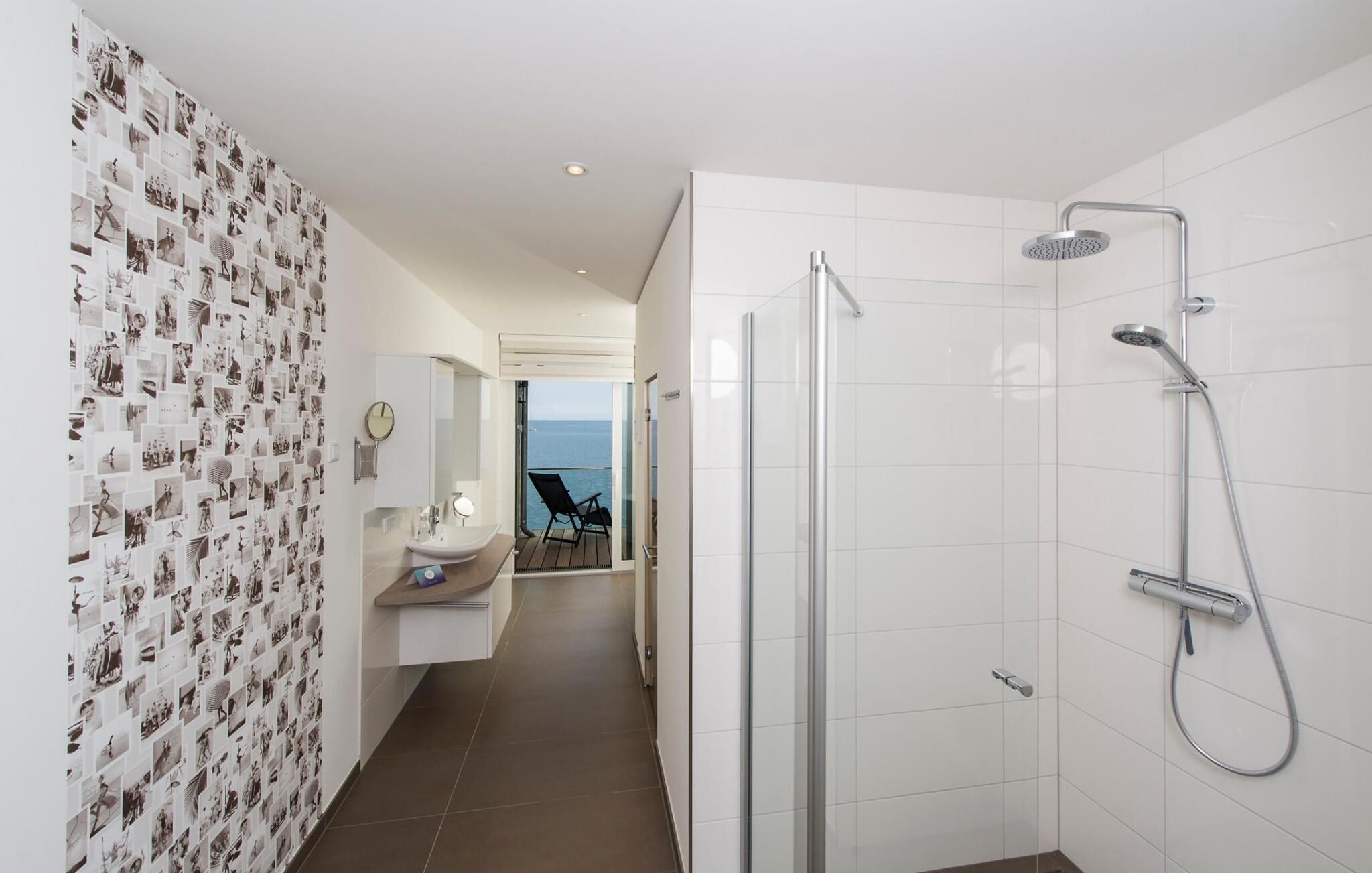 Das voll ausgestattete Badezimmer lässt Wellness-Herzen höher schlagen, denn neben finnischer Sauna und ebenerdiger Dusche überzeugt dieses mit einer Whirlpool-Badewanne und direktem Ostseeblick. Zudem verfügt die Wohnung über ein Gäste WC.