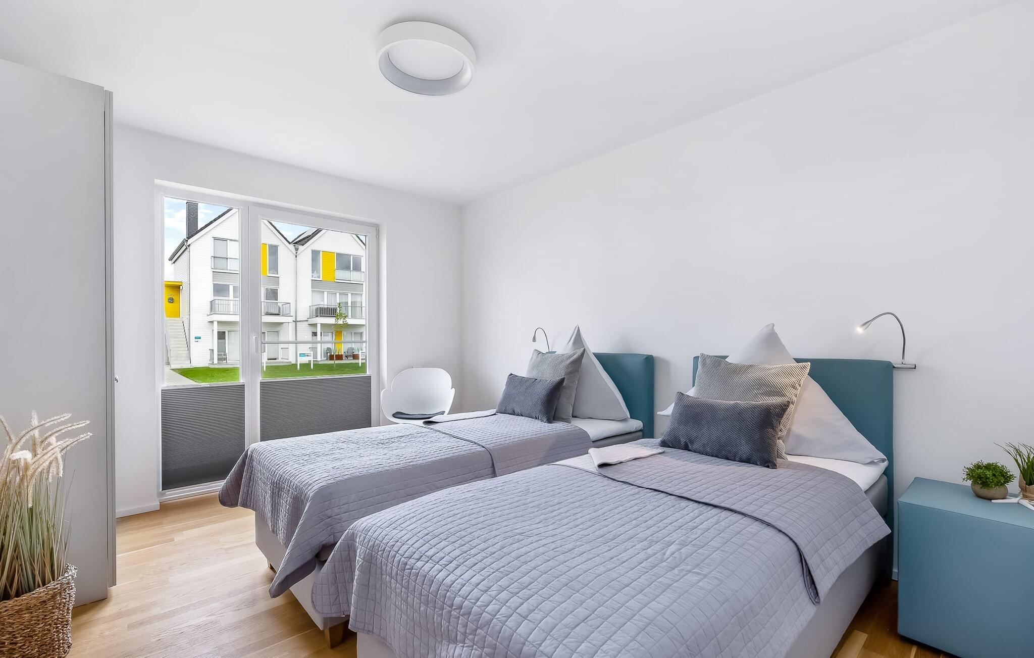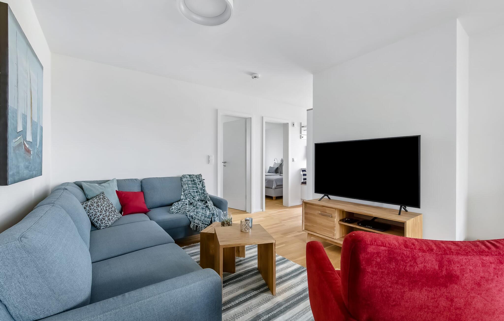 Es gibt zwei Schlafzimmer: Eines mit einem komfortablen Doppelbett und einem Fernseher ausgestattet, das andere bietet zwei Einzelbetten. Aus beiden Zimmern lässt sich ein Blick auf das Meer und den Hafen werfen.