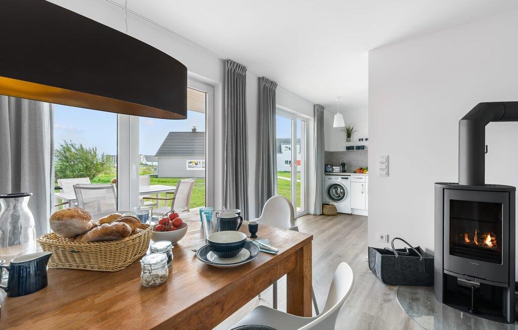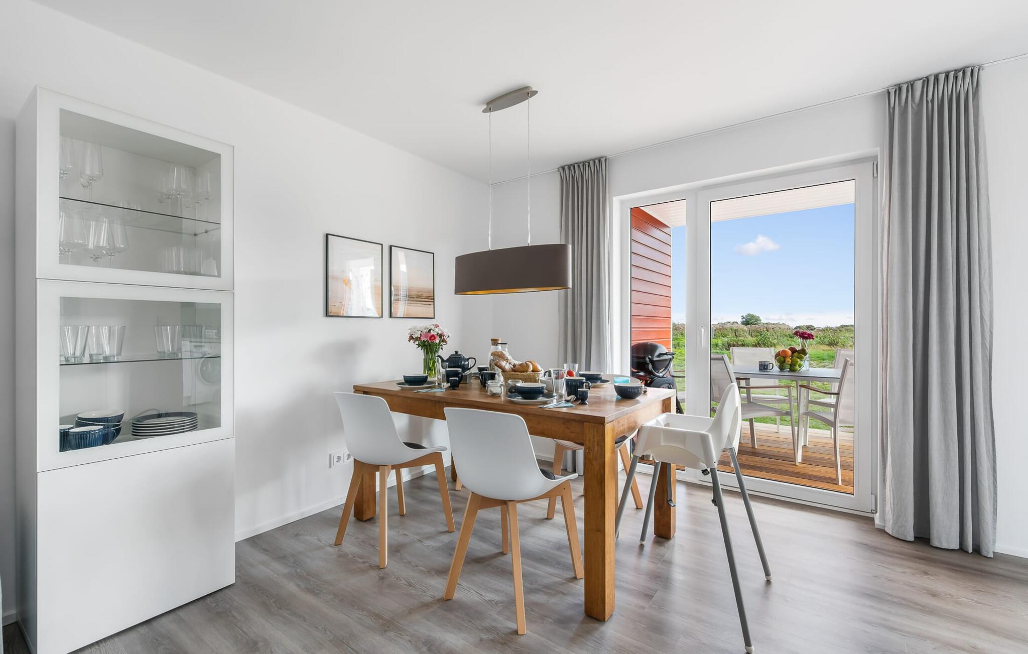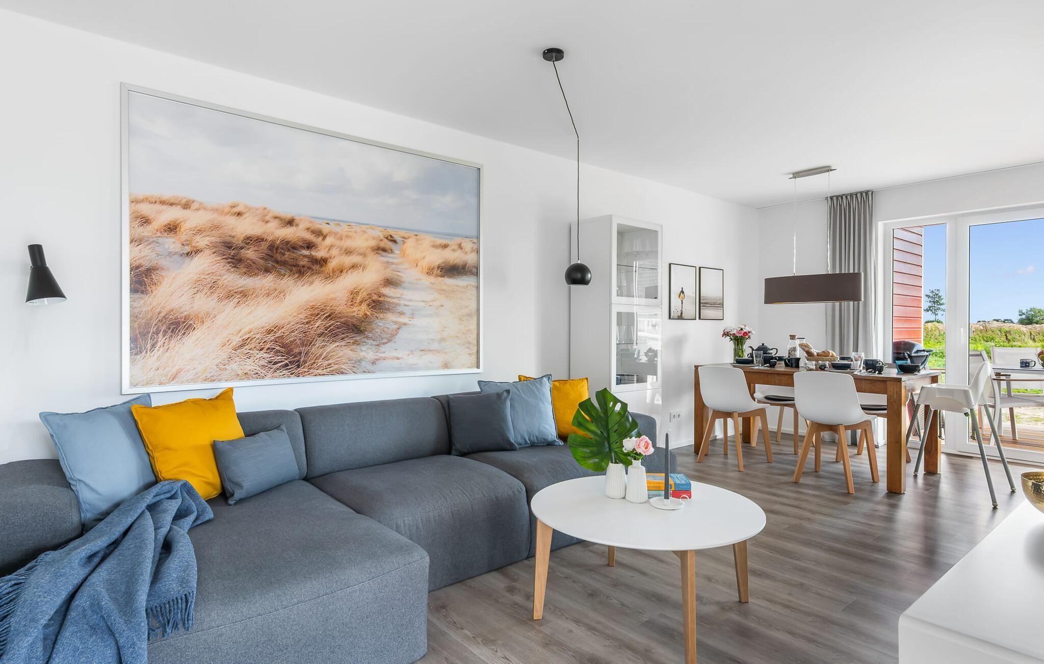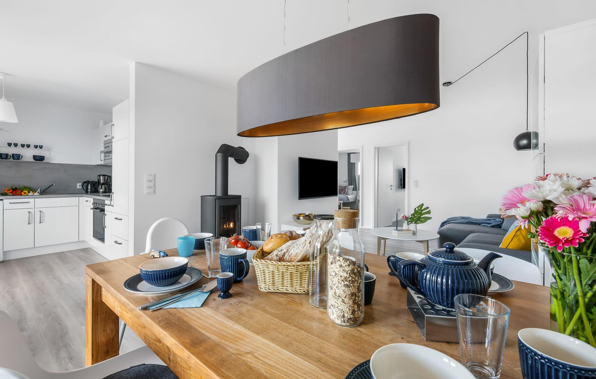 Die KÜSTENLIEBE ist im modernen skandinavischen Stil eingerichtet und der offene und großzügig gestaltete Wohn- und Essbereich versprüht Urlaubsatmosphäre vom ersten Augenblick an. Die gemütliche Sofaecke mit Fernseher (über DVBT) und Kaminofen lädt zum Faulenzen oder gemeinsamen Spielstunden ein. Dabei blickt ihr durch die bodentiefen Fenster auf die angrenzende Terrasse. Moderne Gartenmöbel und ein Grill laden zu geselligen Sommerabenden ein.