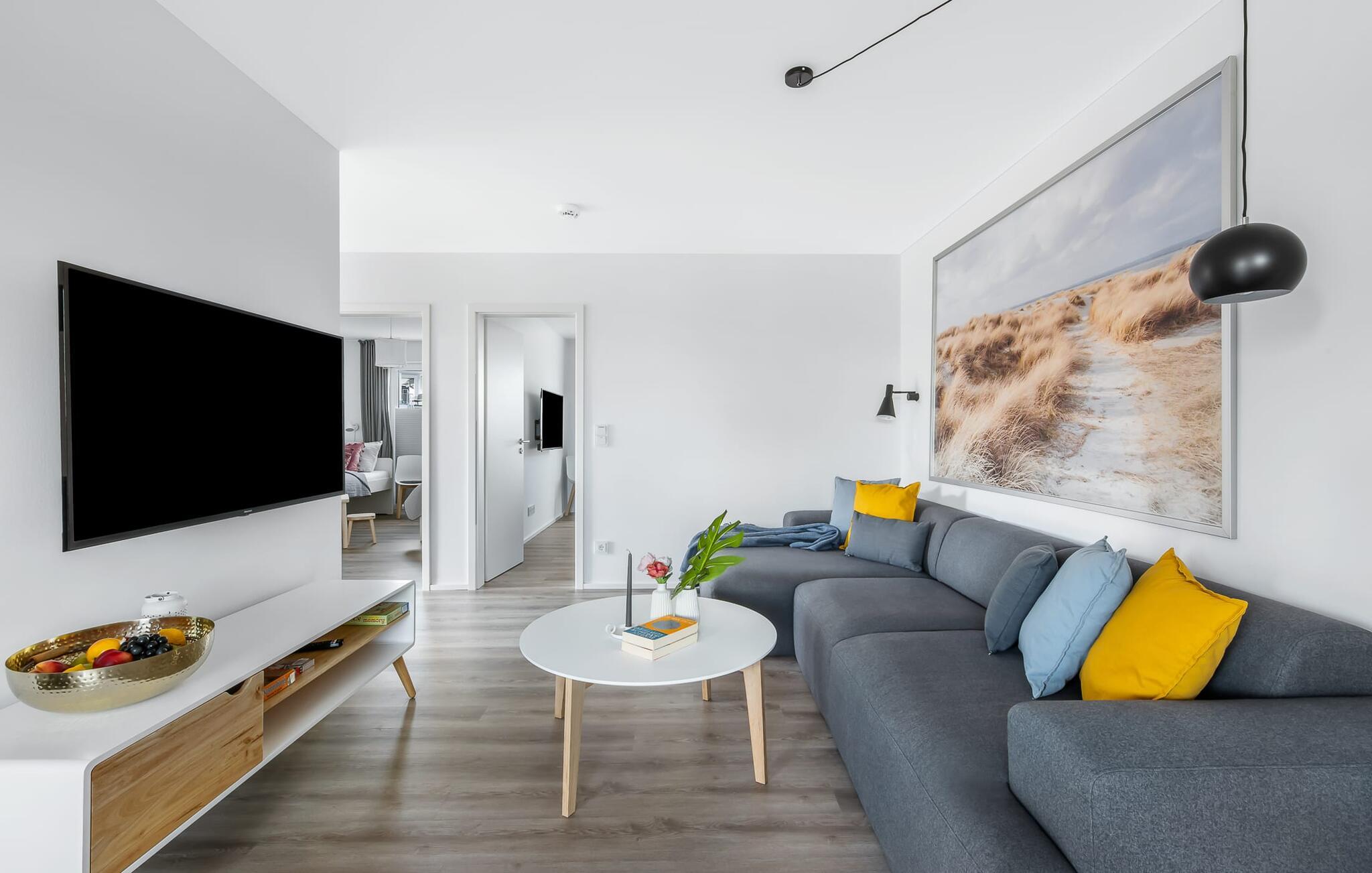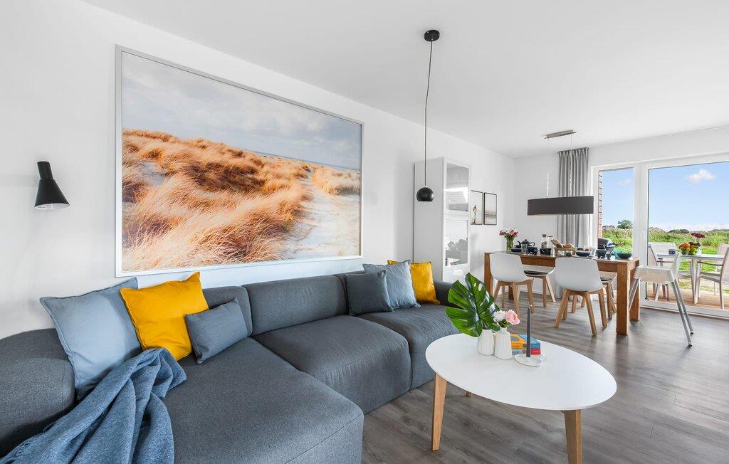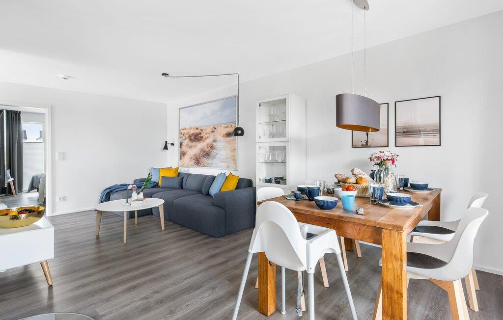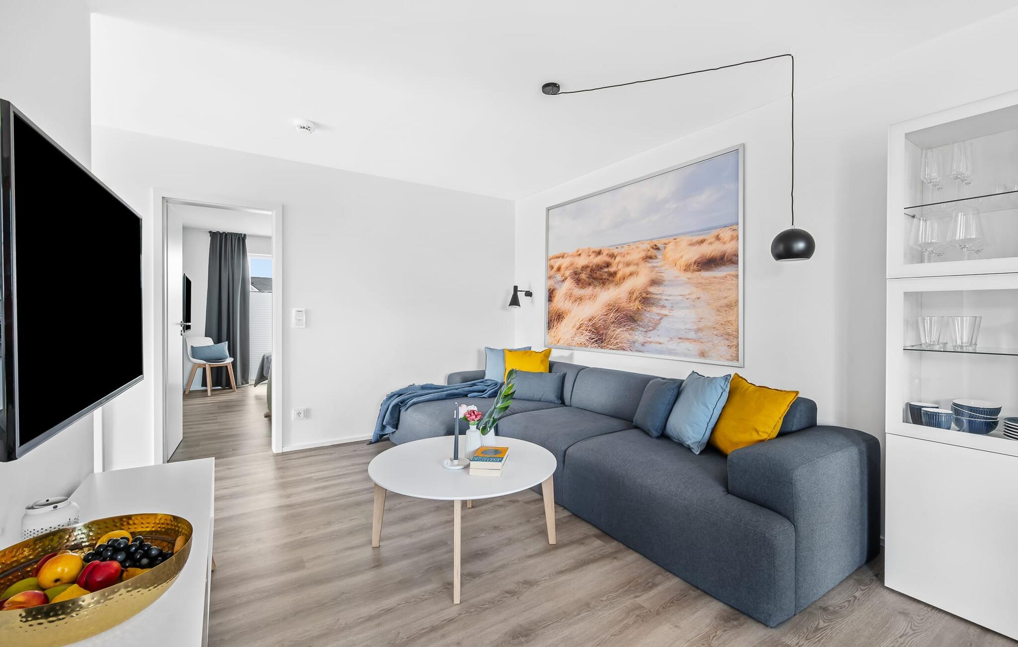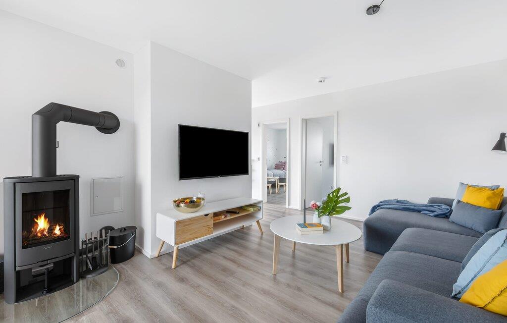 Die KÜSTENLIEBE ist im modernen skandinavischen Stil eingerichtet und der offene und großzügig gestaltete Wohn- und Essbereich versprüht Urlaubsatmosphäre vom ersten Augenblick an. Die gemütliche Sofaecke mit Fernseher (über DVBT) und Kaminofen lädt zum Faulenzen oder gemeinsamen Spielstunden ein. Dabei blickt ihr durch die bodentiefen Fenster auf die angrenzende Terrasse. Moderne Gartenmöbel und ein Grill laden zu geselligen Sommerabenden ein.