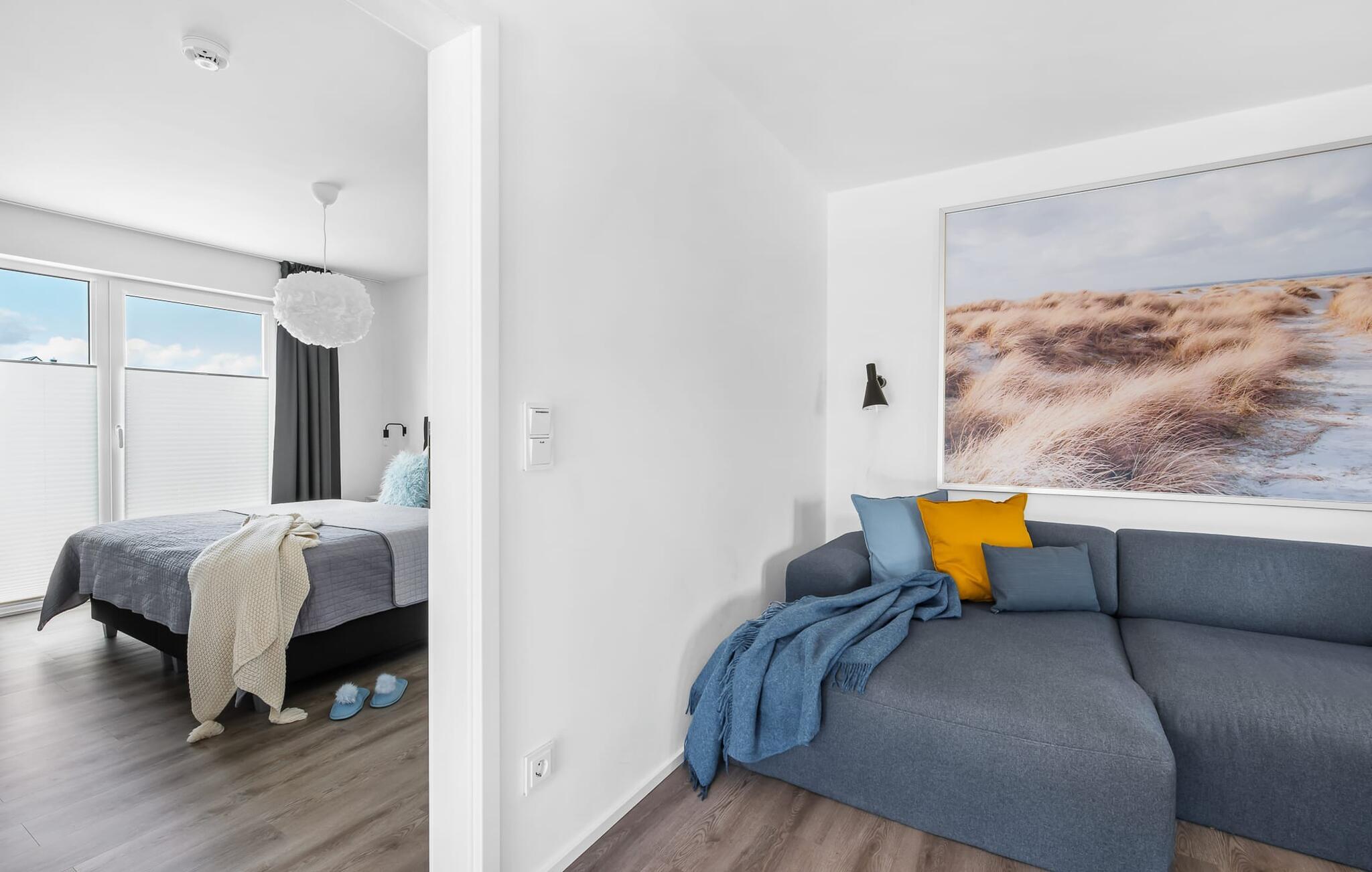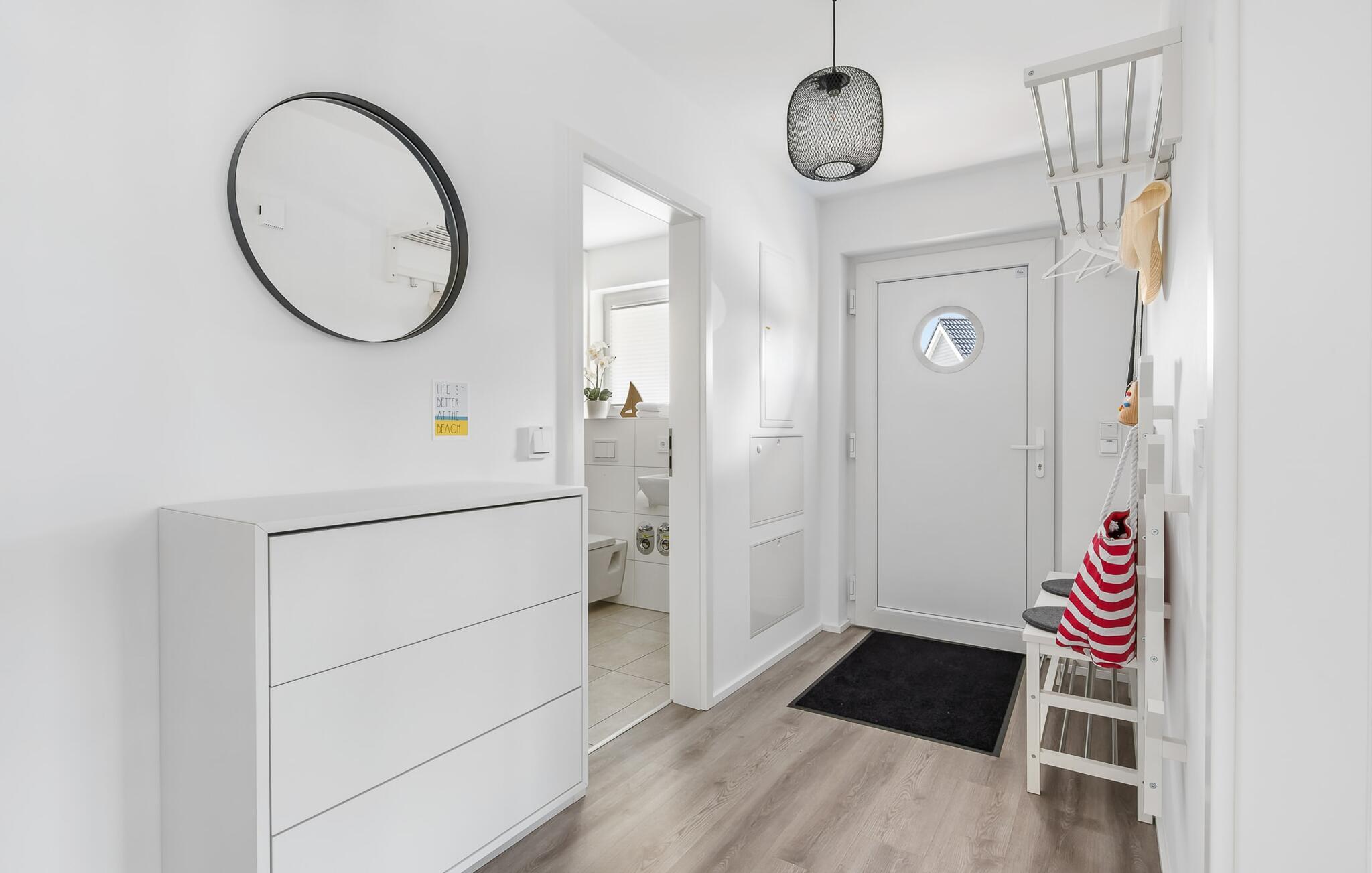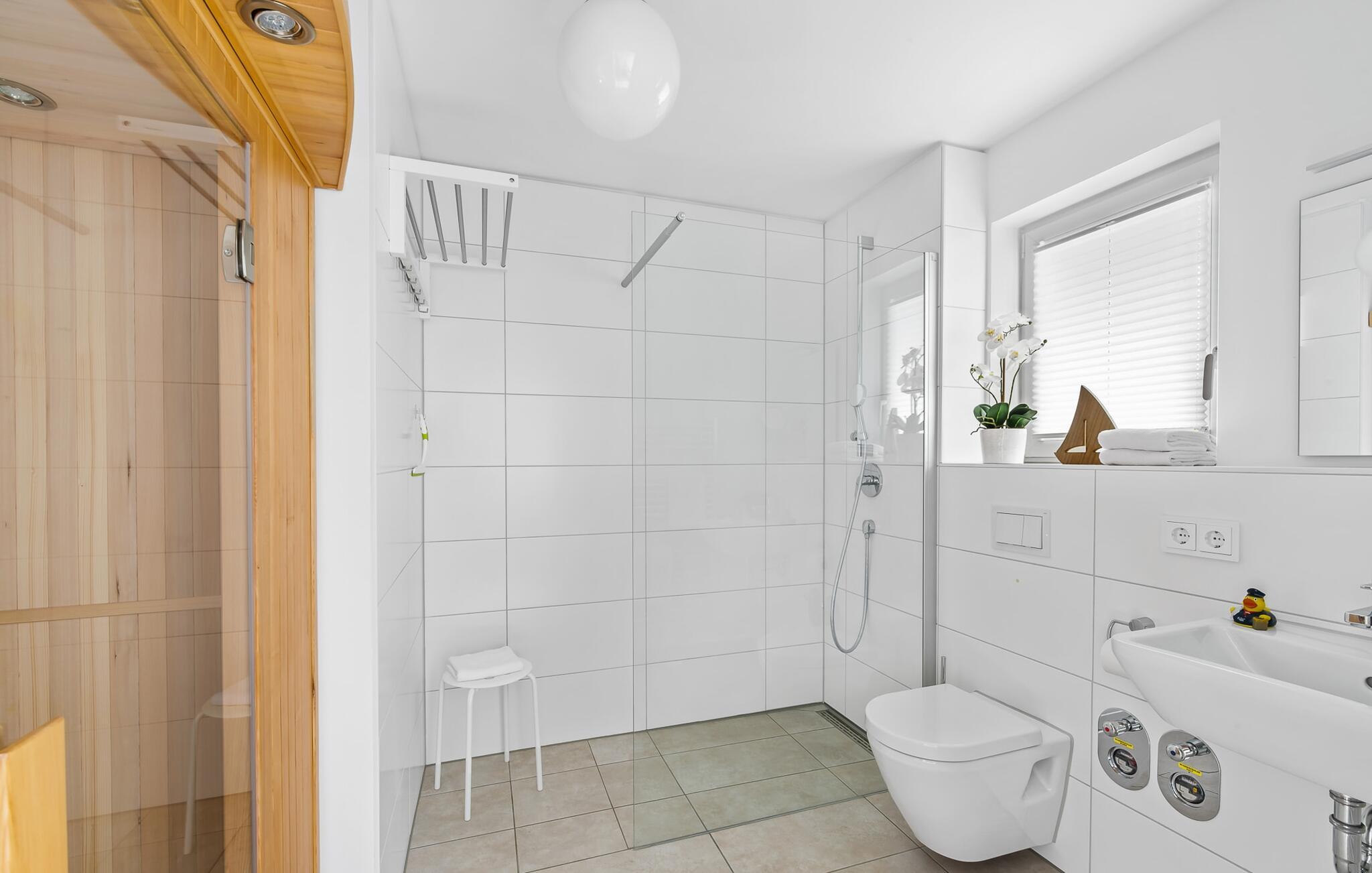 Im Badezimmer, das mit allem ausgestattet ist was man zum Wohlfühlen braucht, wartet nach langen Spaziergängen am Strand die Infrarotkabine für ein ausgiebiges Verwöhnprogramm. Die bodentiefe, schwellenlose Dusche lässt nach einem Strandbesuch auch keine Wünsche offen.