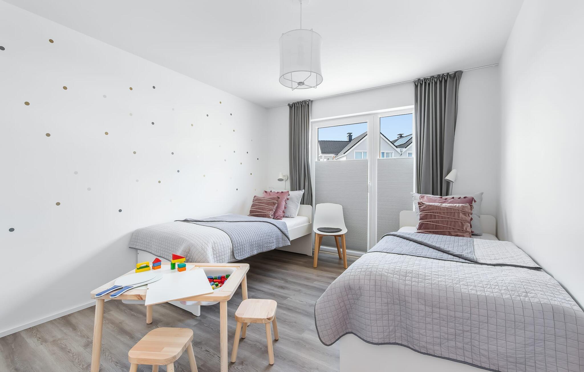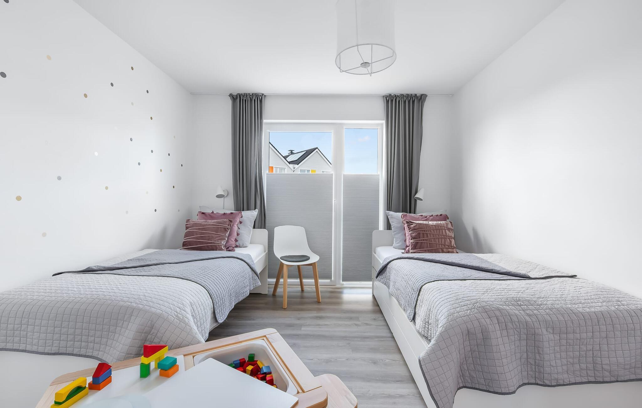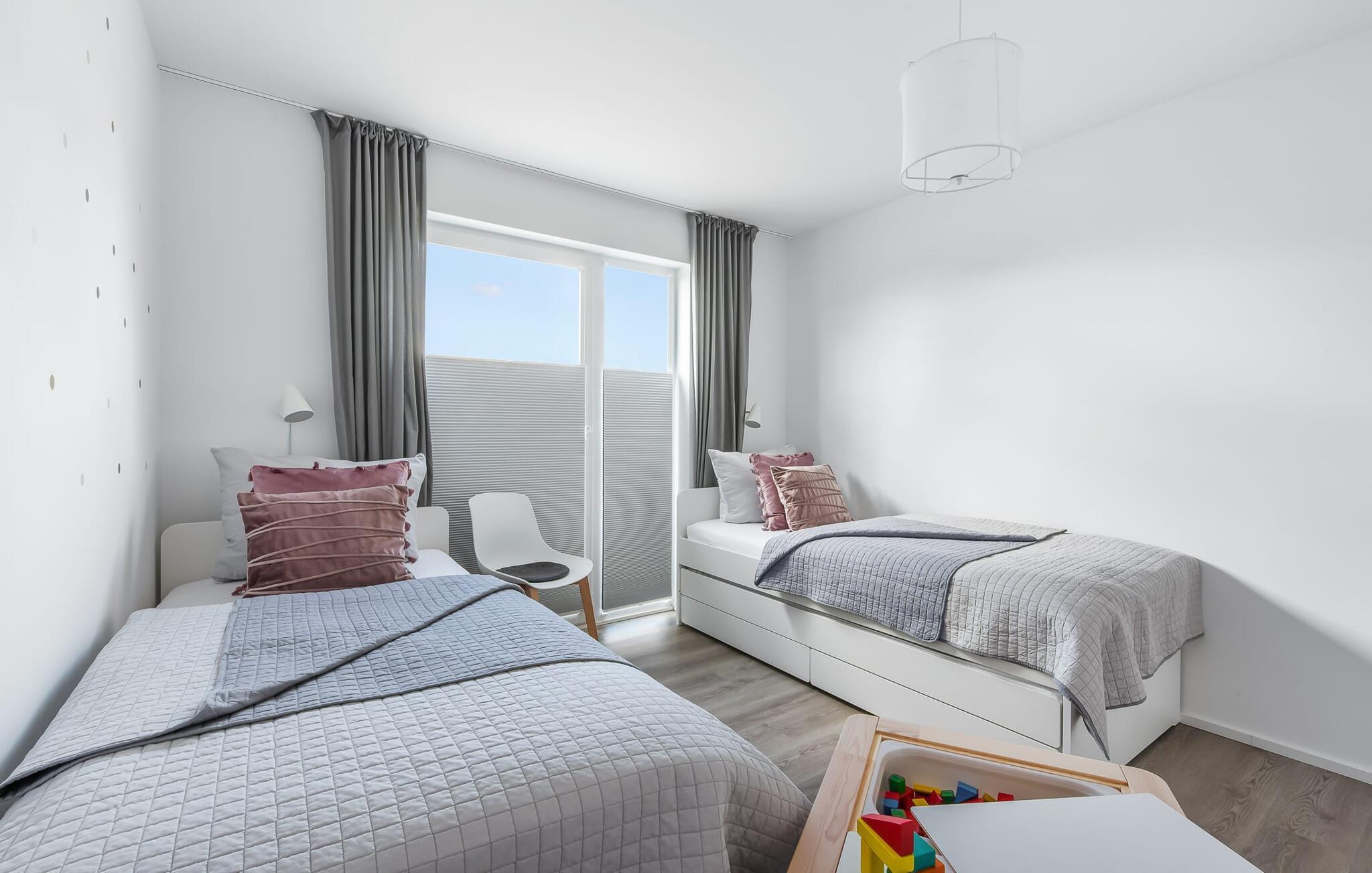 Das Hauptschlafzimmer ist mit einem 1,80 m breiten, komfortablen Boxspringbett ausgestattet. Das zweite Schlafzimmer kann sowohl als Doppelbett, wie auch mit 2 Einzelbetten und einem zusätzlichem Ausziehbett an die Bedürfnisse der Bewohner optimal angepasst werden. Eine Spielecke mit Maltisch sorgt für Abwechslung bei den kleinen Gästen. Babybett und Babystuhl sind im Haus vorhanden!