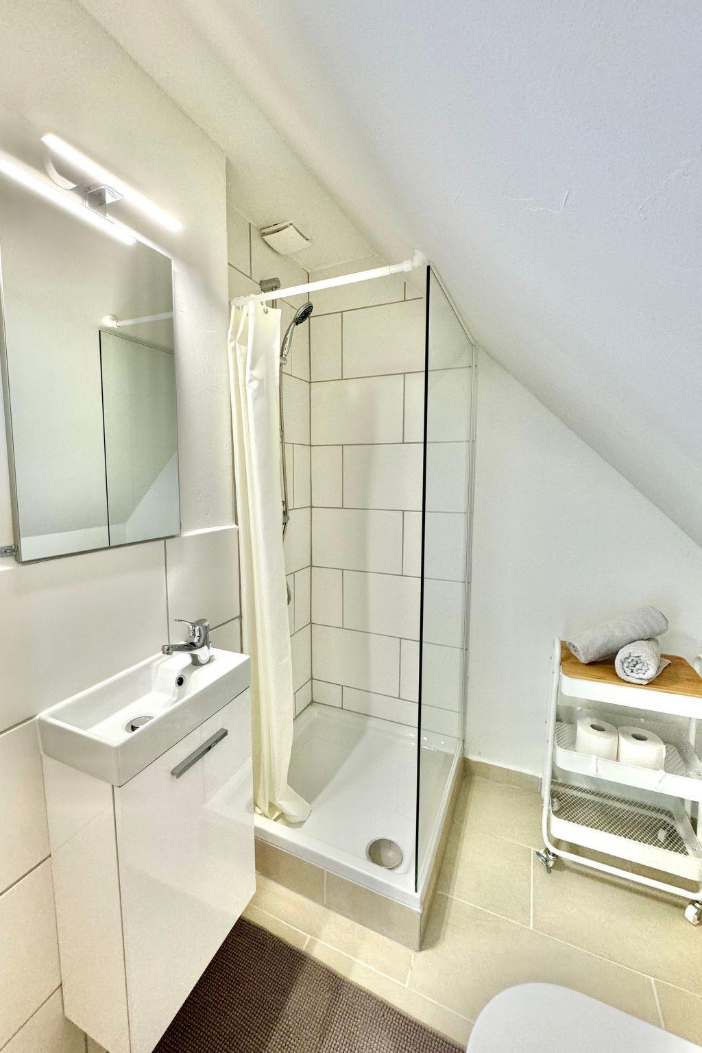 Die Dusche befindet sich auf dem Flur und steht Ihnen zur alleinigen Nutzung zur Verfügung. Obwohl sie nicht direkt im Zimmer ist, ist sie nur einen kurzen Weg entfernt und bietet Ihnen die Möglichkeit, sich zu erfrischen und zu duschen.