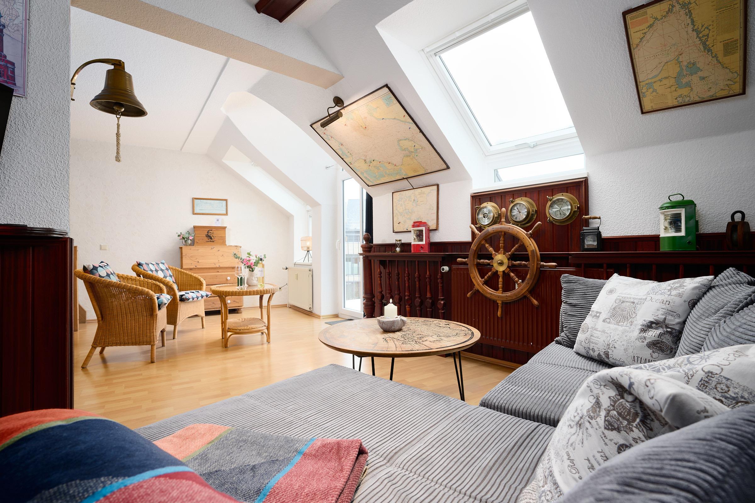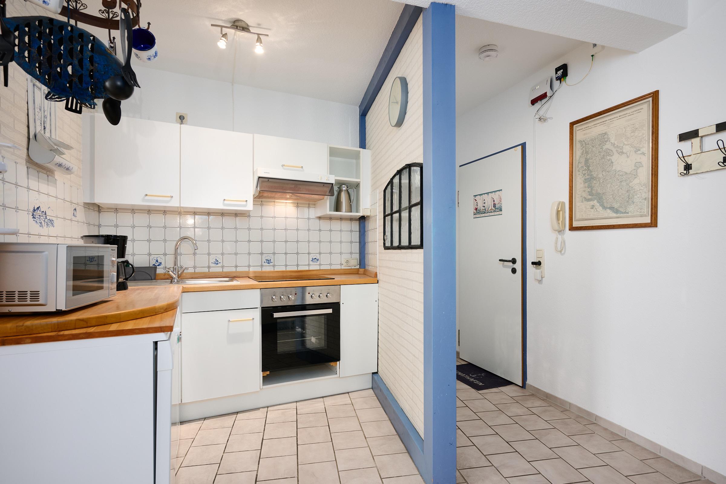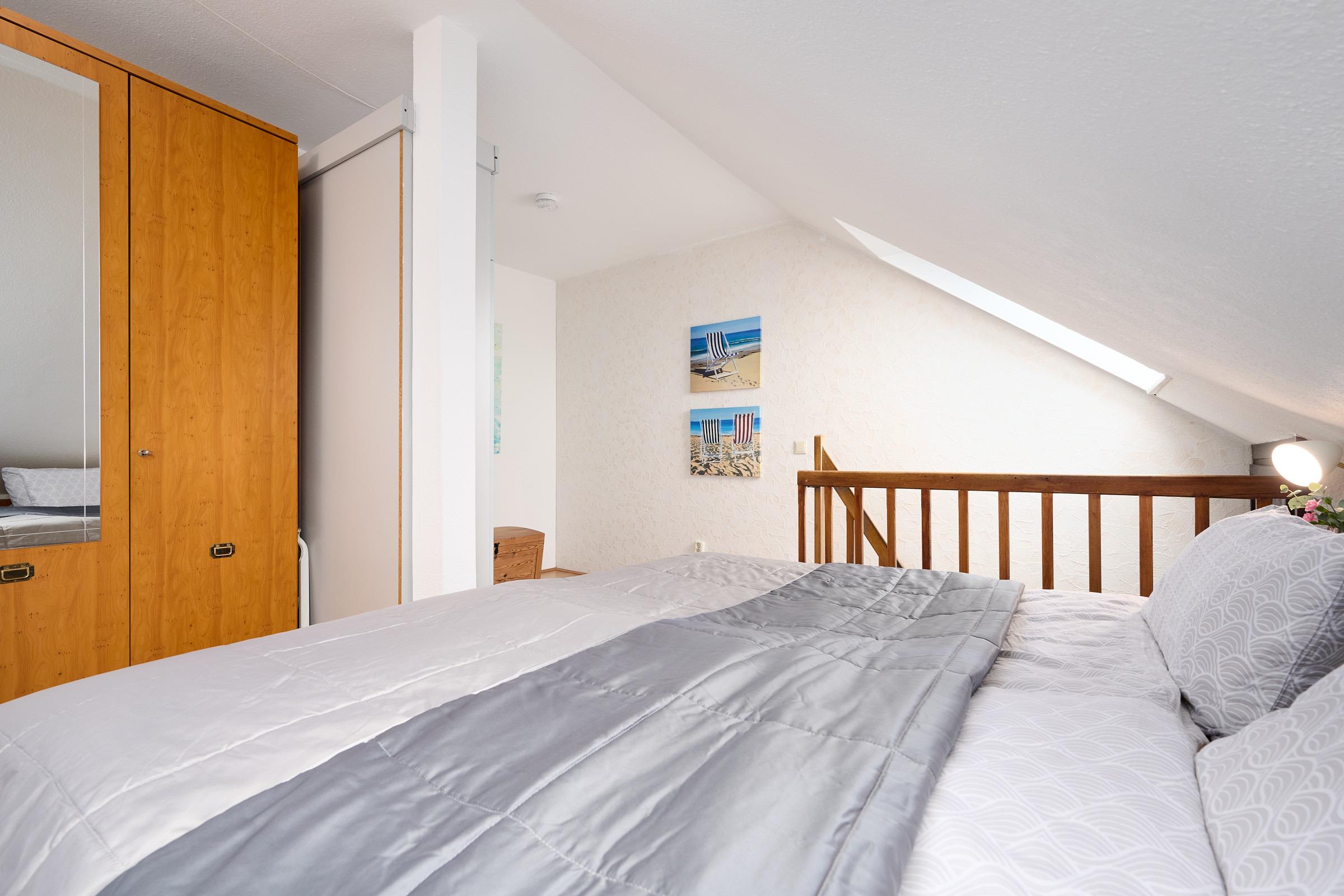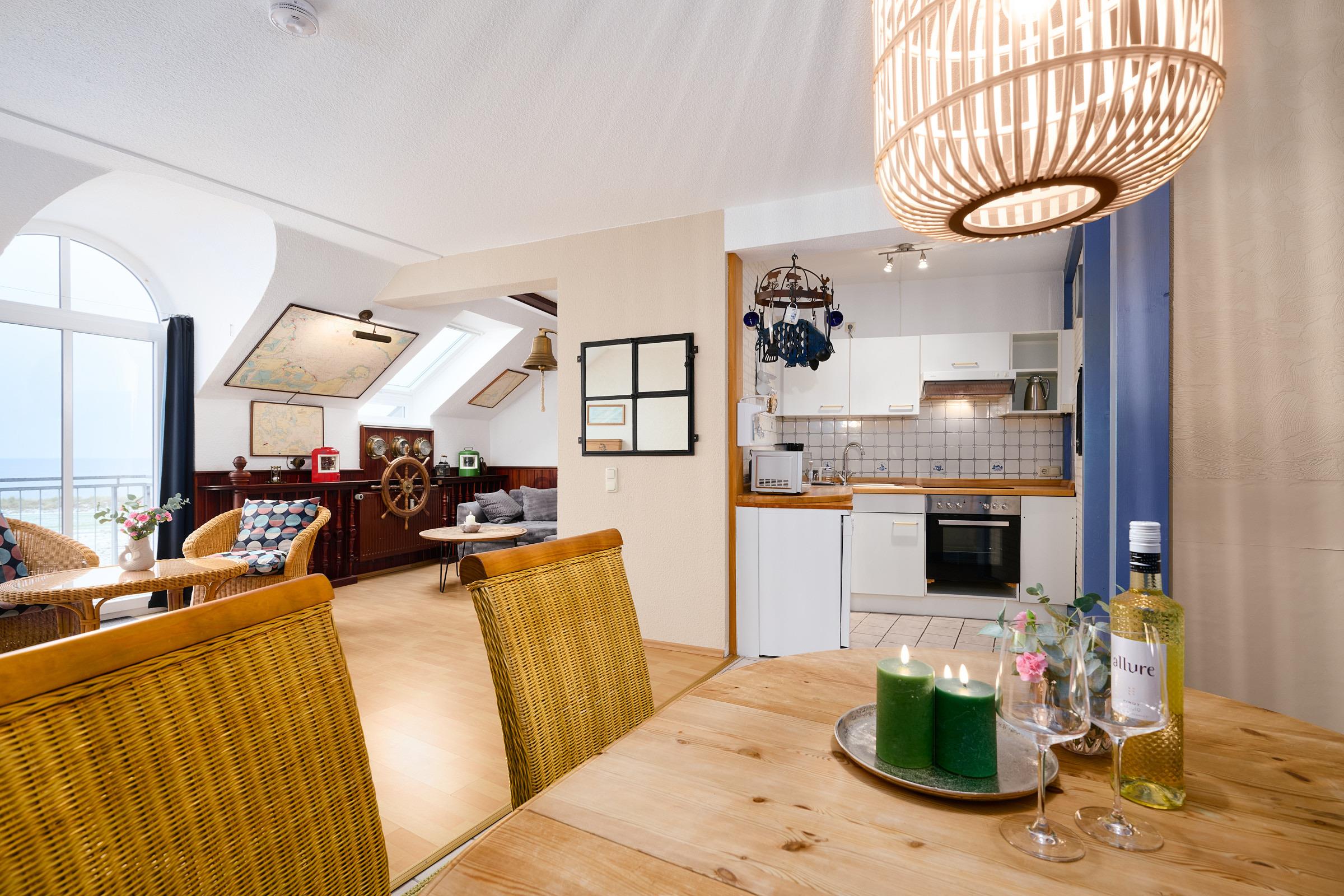 Der helle Wohnbereich lädt mit gemütlichem Sofa, Fernseher und Essbereich zum Entspannen ein. Vom angrenzenden Balkon mit Westausrichtung genießen Sie sonnige Stunden und den Blick auf das Meer. Die moderne Küche ist bestens ausgestattet mit Backofen, Geschirrspülmaschine, Kühlschrank mit Gefrierfach, Kaffeemaschine, Wasserkocher, Toaster und Mikrowelle – ideal, um auch im Urlaub komfortabel zu kochen. Im Schlafzimmer im 3. Obergeschoss sorgt ein komfortables Doppelbett für erholsamen Schlaf, ein zusätzliches Schlafsofa im Wohnbereich bietet Platz für zwei weitere Gäste. Das Badezimmer verfügt über eine Dusche (Einstiegshöhe: 4 cm), WC, Föhn und praktische Ablagemöglichkeiten.