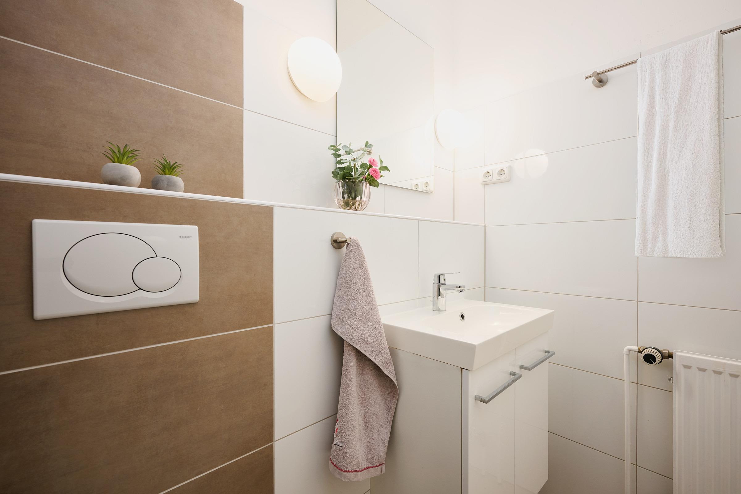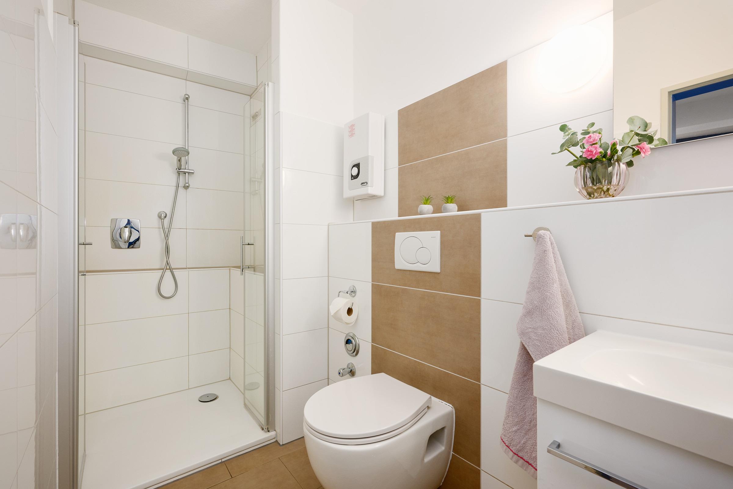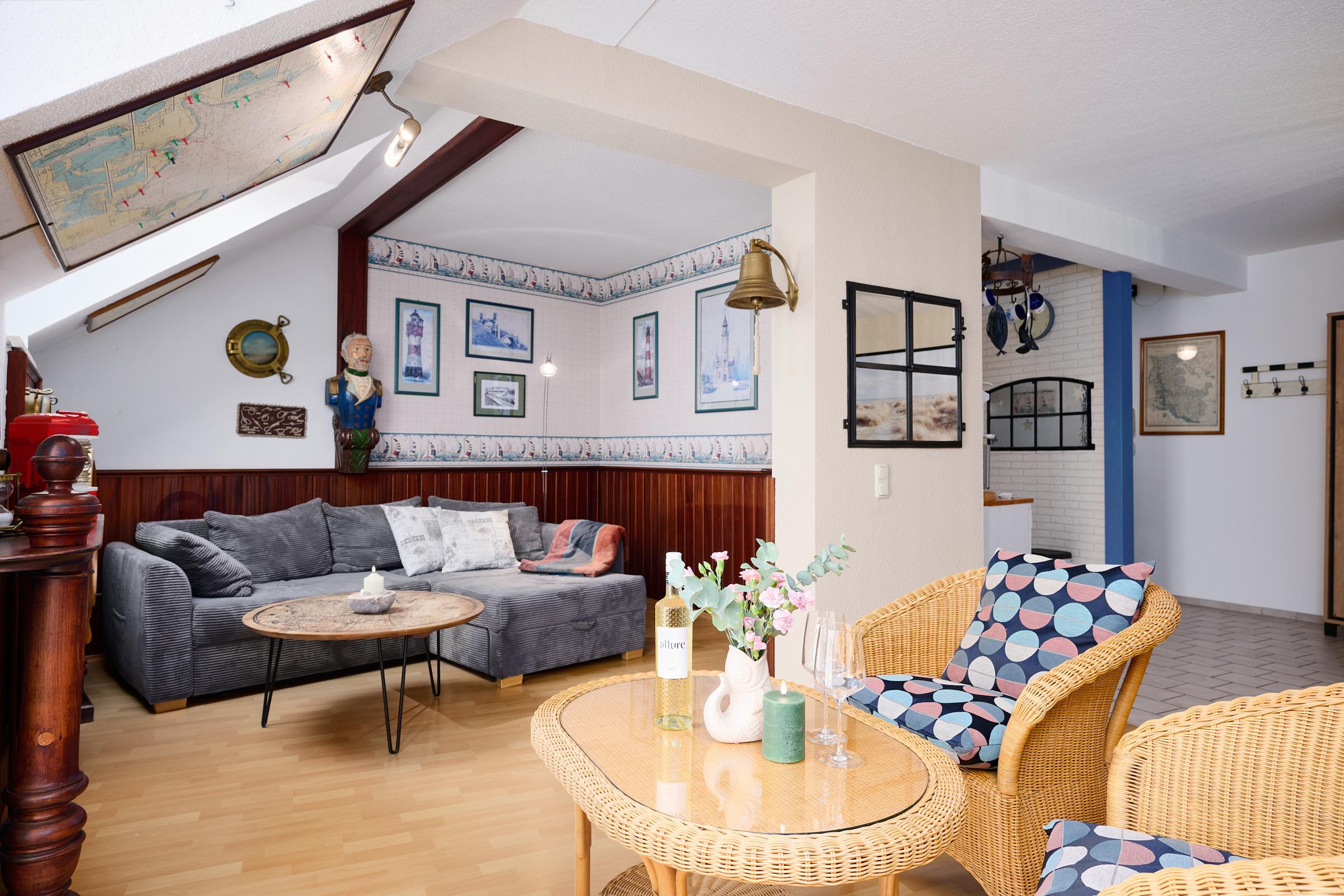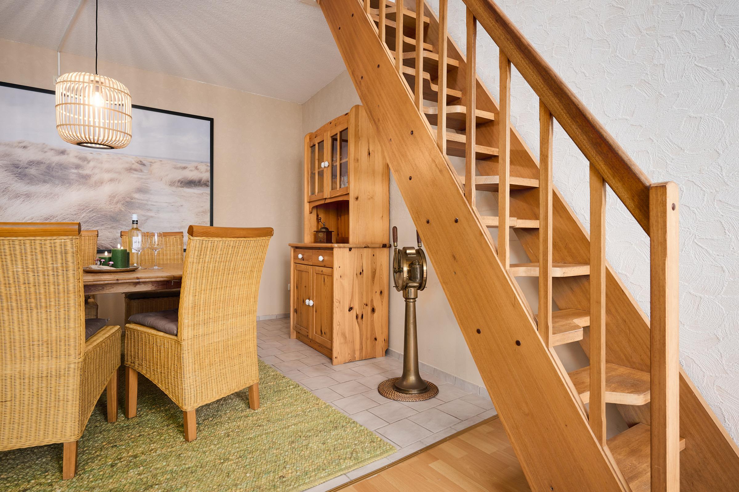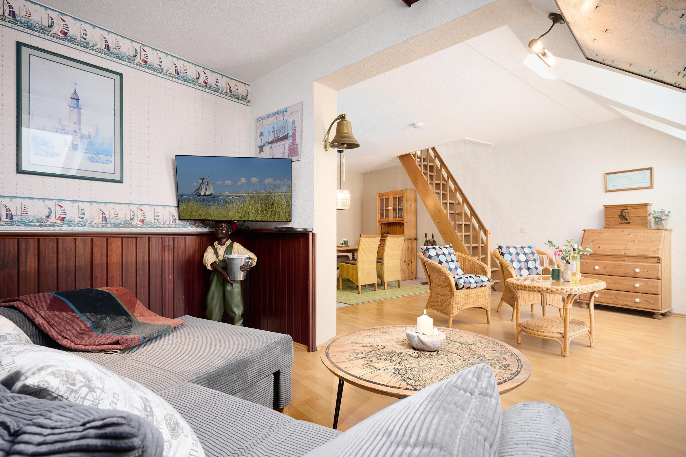 Der helle Wohnbereich lädt mit gemütlichem Sofa, Fernseher und Essbereich zum Entspannen ein. Vom angrenzenden Balkon mit Westausrichtung genießen Sie sonnige Stunden und den Blick auf das Meer. Die moderne Küche ist bestens ausgestattet mit Backofen, Geschirrspülmaschine, Kühlschrank mit Gefrierfach, Kaffeemaschine, Wasserkocher, Toaster und Mikrowelle – ideal, um auch im Urlaub komfortabel zu kochen. Im Schlafzimmer im 3. Obergeschoss sorgt ein komfortables Doppelbett für erholsamen Schlaf, ein zusätzliches Schlafsofa im Wohnbereich bietet Platz für zwei weitere Gäste. Das Badezimmer verfügt über eine Dusche (Einstiegshöhe: 4 cm), WC, Föhn und praktische Ablagemöglichkeiten.