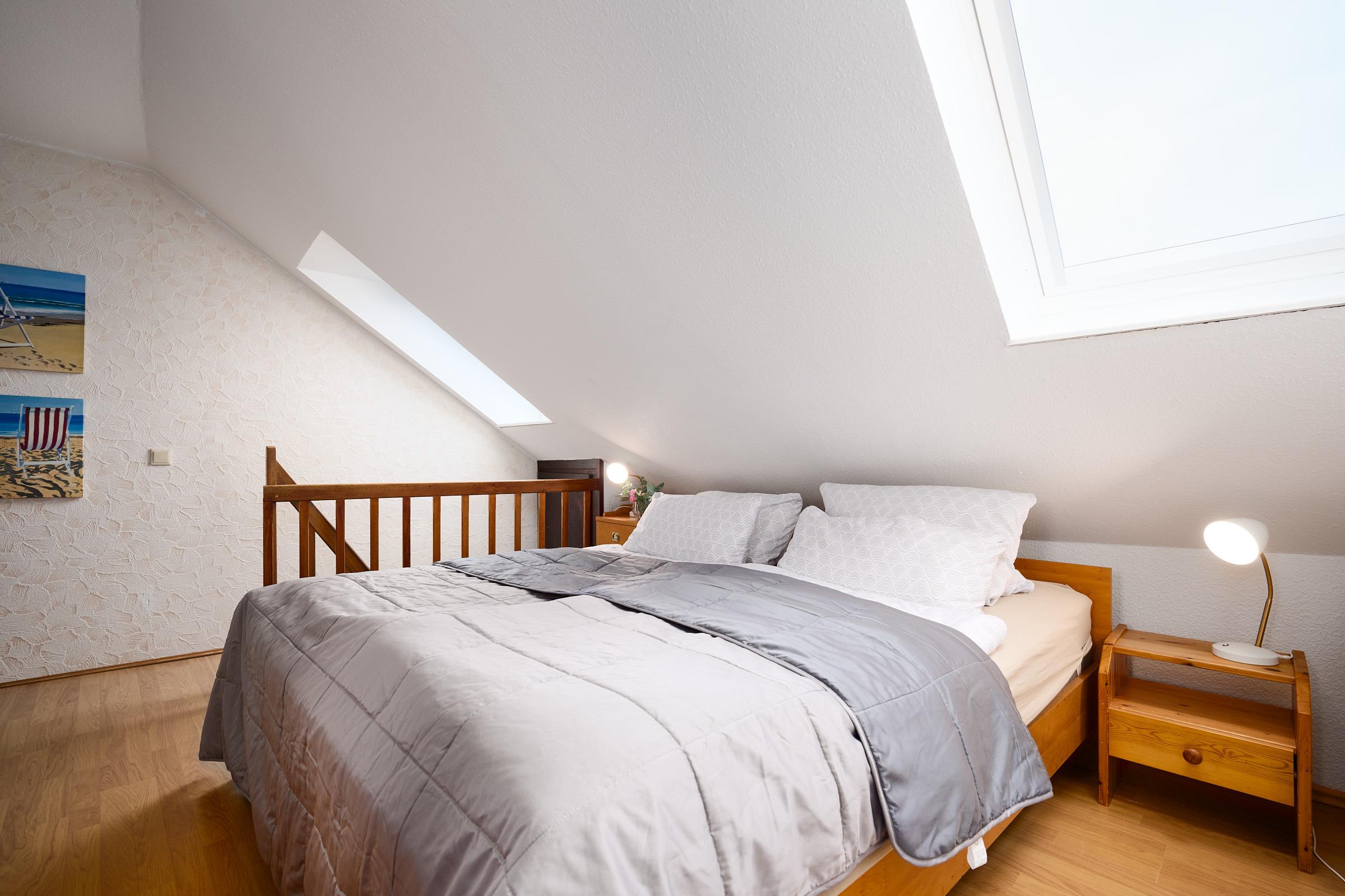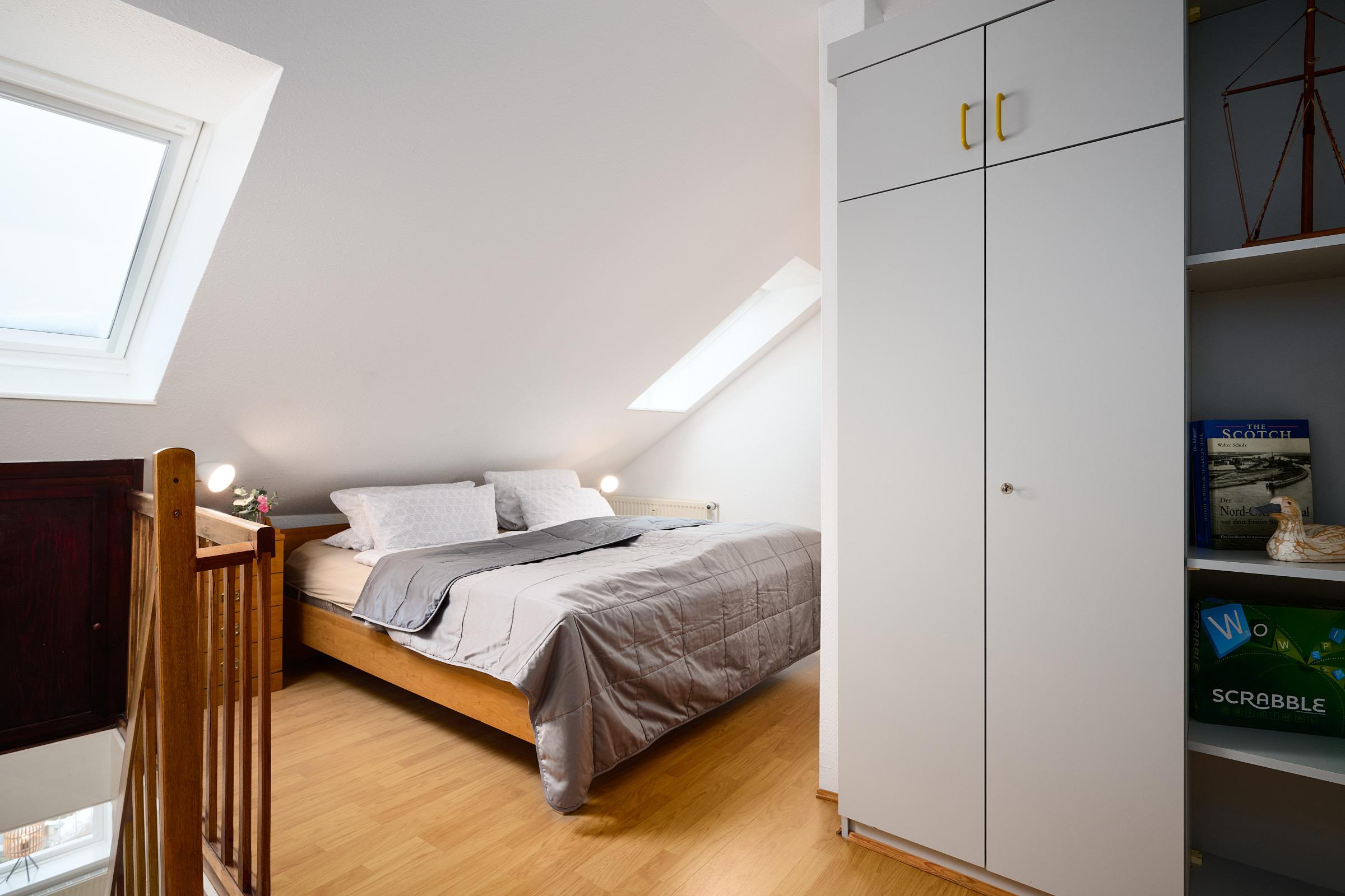Schlafzimmer 1 (3. OG): 1 Doppelbett (2x 90x200 cm), Kleiderschrank, Verdunkelung: Veluxrollo und Hitzeschutzmarkise, kein Platz für ein Babybett vorhanden