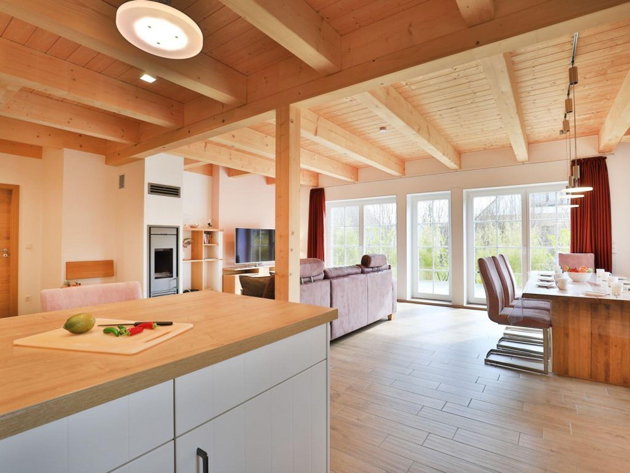 Die Möblierung im Erdgeschossbereich ist stilvoll. Eine Sofalandschaft lädt zur Auszeit am wohligen Kaminofen ein. Fernseher, Musikanlage und auch kostenfreie WLAN-Nutzung sind vorhanden. Vom Wohnbereich gelangen Sie eine saisonal möblierte Terrasse in süd-/westliche Ausrichtung. Der große Garten ist ideal für Kinder und bietet zudem eine Grillmöglichkeit. Die offene Küche ist in den Wohnbereich integriert und verfügt über ein Induktionskochfeld, Backofen, Mikrowelle, Kühlschrank, Gefrierschrank, Kaffeemaschine, Toaster, Wasserkocher, Geschirrspüler u.v.m. Ihre zubereiteten Mahlzeiten nehmen Sie an einem großen Esstisch zu sich. Bei schönem Wetter, bestimmt auch gerne auf der Terrasse mit Blick in den Garten. Eines der separaten Komfort- Schlafzimmer befindet sich auf der Wohnebene. Dieses Schlafzimmer ist mit einem Doppelbett, TV und einem eigenen Bad mit ebenerdiger Dusche ausgestattet. Auch ein Hauswirtschaftsraum mit kostenfreier Waschmaschine & Wäschetrocknernutzung sowie ein Gäste-WC sind im Erdgeschoss vorhanden.
