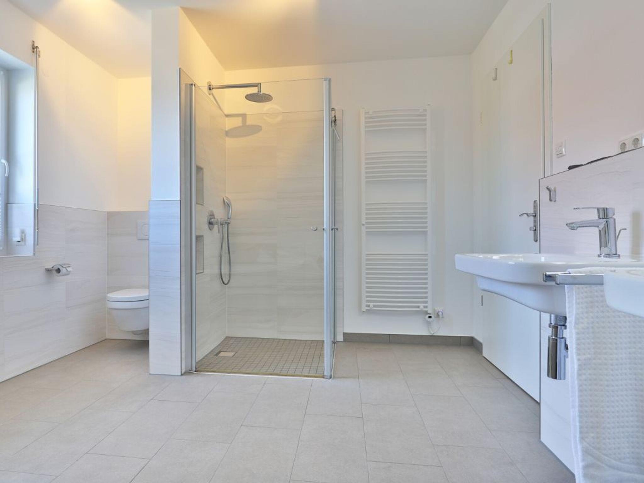 Über eine Treppe im Eingangsflur gelangen Sie in die obere Etage, wo sich zwei weitere Komfort Schlafzimmer befinden. 1x mit Doppelbett, Kleiderschrank, TV sowie Balkonzugang mit Blick über die Felder, 1x mit zwei Einzelbetten, Kleiderschrank und TV. Idealerweise besitzt auch diese Etage ein großzügiges Tageslicht Badezimmer mit Eckbadewanne, bodengleicher Dusche, zwei Waschtische und WC.