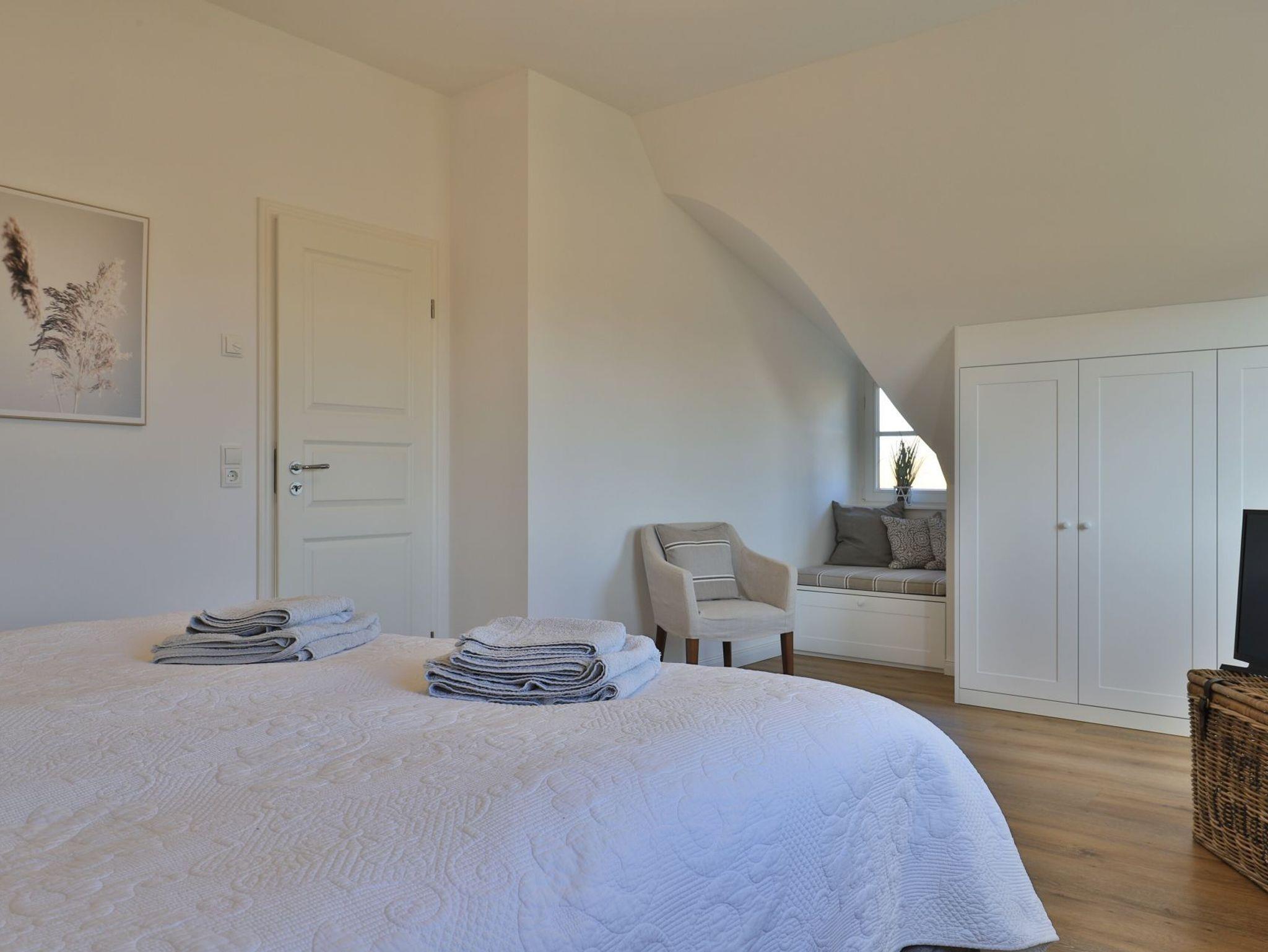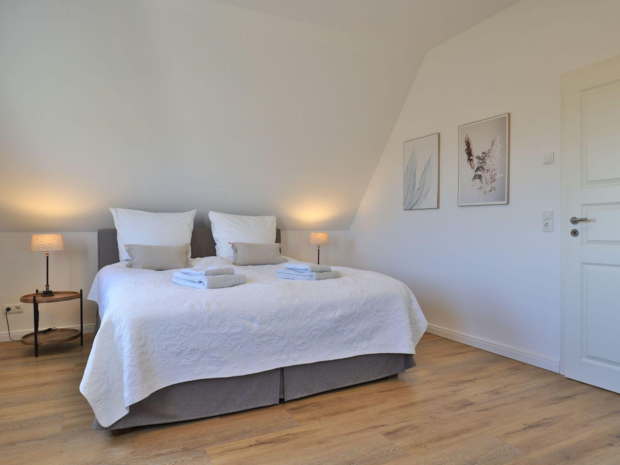 Hier befinden sich drei separate Schlafzimmer 2x mit ausziehbarem Einzelbett und Kleiderschrank, 1x mit Doppel Boxspringbett sowie SMART-TV, Kleiderschrank und Sitzecke. Ein zweites Badezimmer mit Dusche und Badewanne befindet sich ebenso im Obergeschoss des Hauses. Das gesamte Haus ist mit einer Fußbodenheizung ausgestattet.