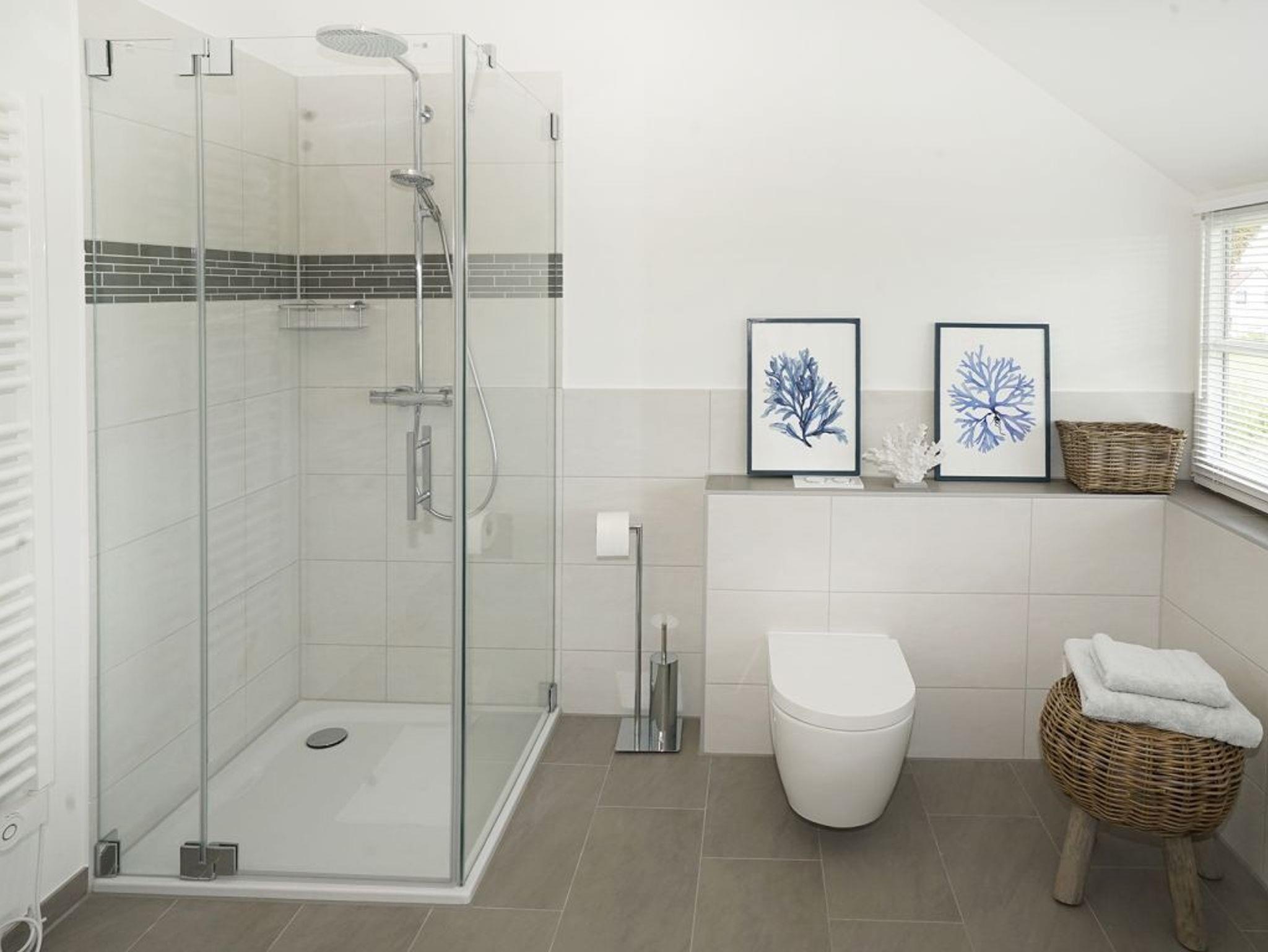 Hier befinden sich drei separate Schlafzimmer 2x mit ausziehbarem Einzelbett und Kleiderschrank, 1x mit Doppel Boxspringbett sowie SMART ? TV, Kleiderschrank und Sitzecke. Ein zweites Badezimmer mit Dusche und Badewanne befindet sich ebenso im Obergeschoss des Hauses. Das gesamte Haus ist mit einer Fußbodenheizung ausgestattet.