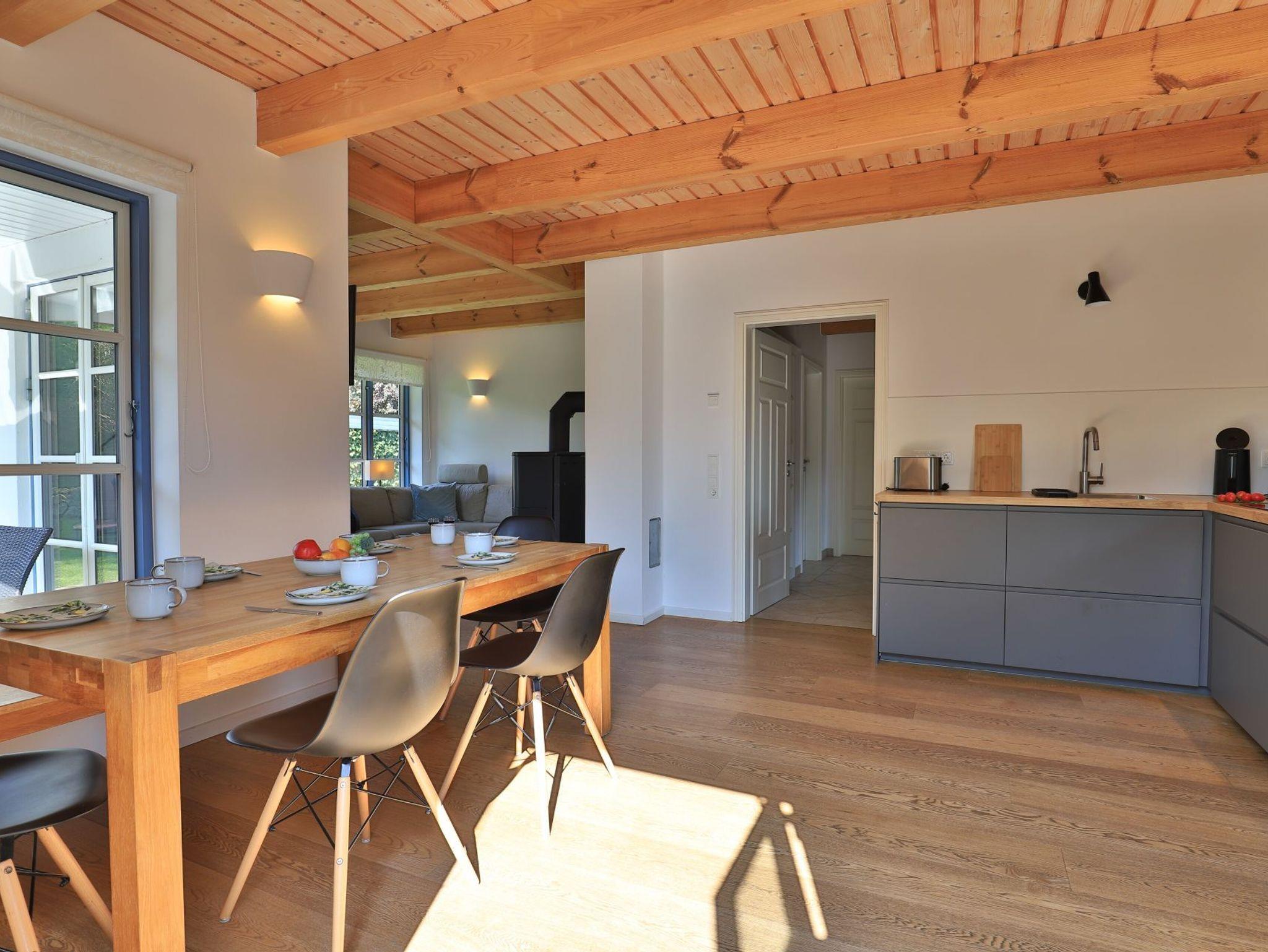 Modernes Ferienhaus mit Sauna, Kamin und Terrasse, nur 800 Meter vom Naturstrand Groß Schwansee entfernt.