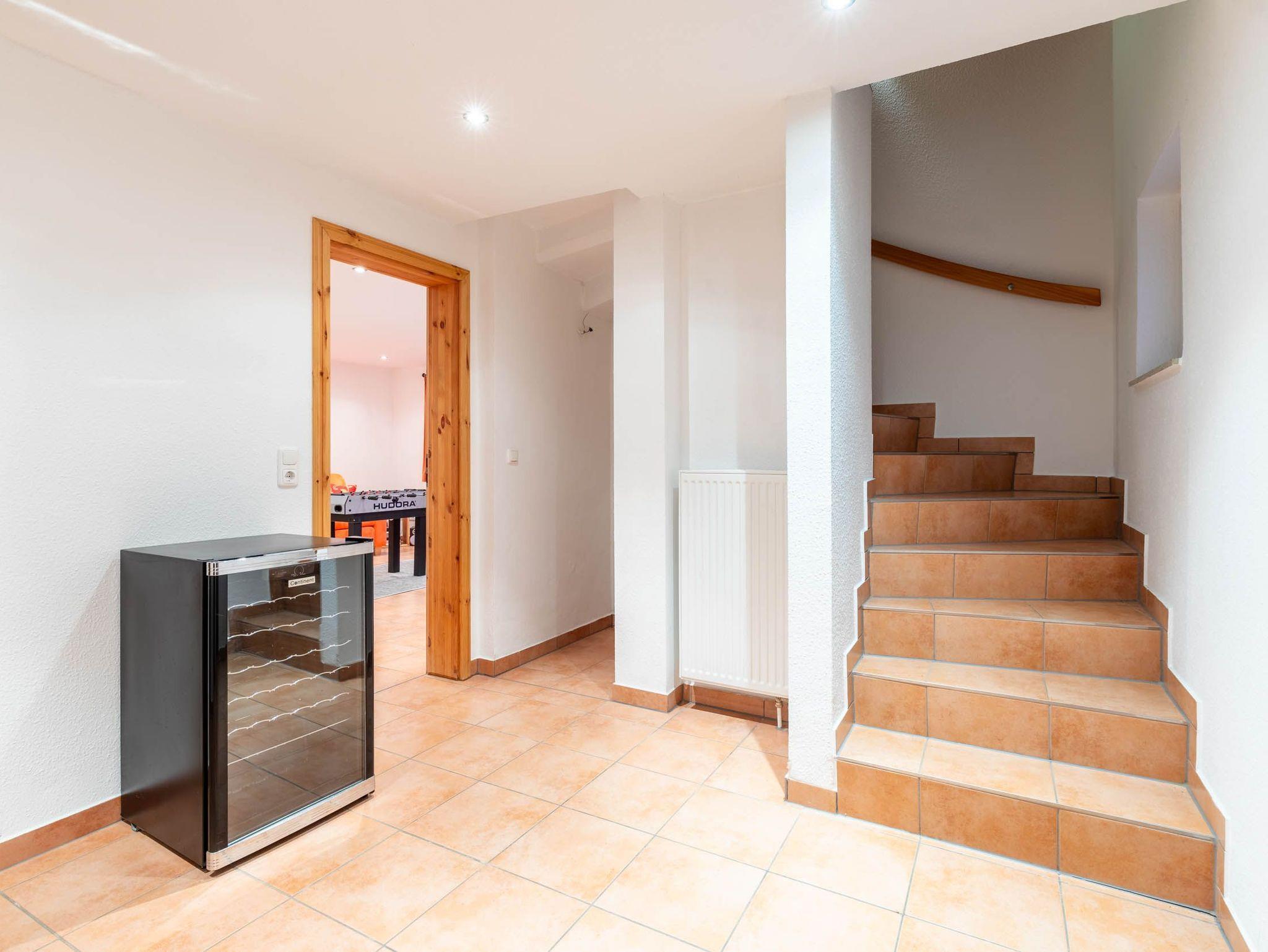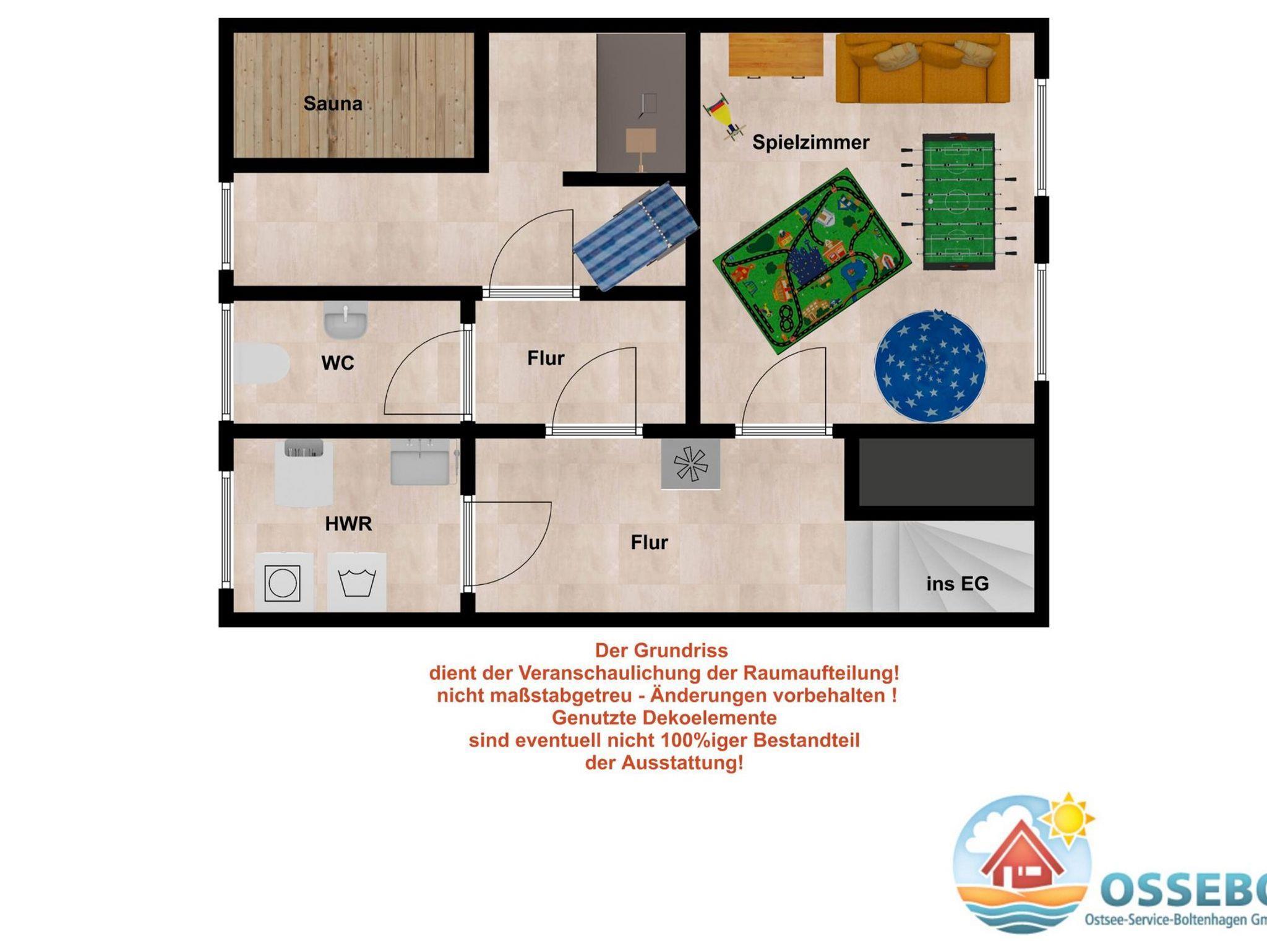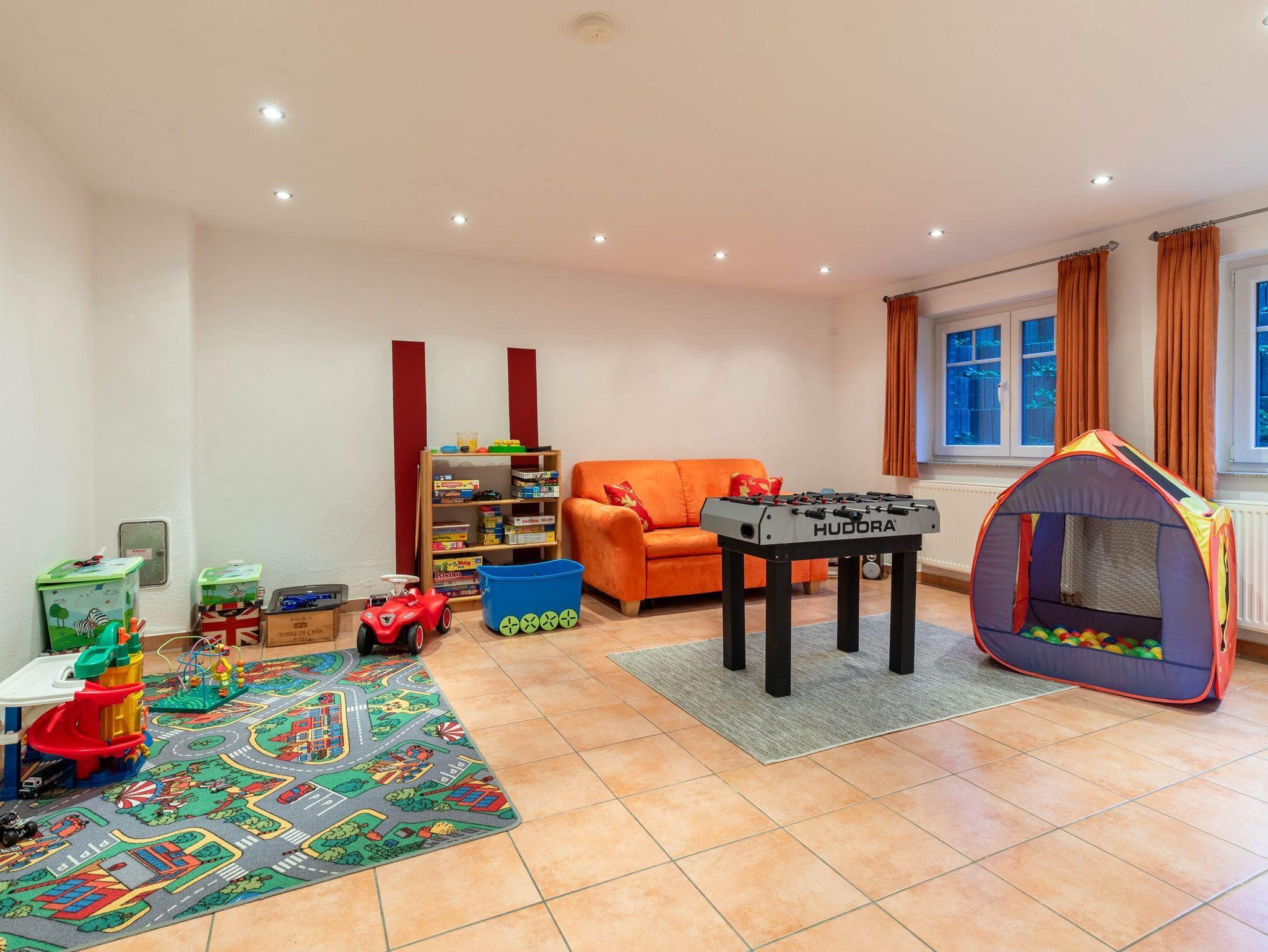 In diesem schmucken Feriendomizil kann auch das Kellergeschoss genutzt werden: Hier erwartet Sie u.a. ein 23 m² großes Spielzimmer, das mit 2 normalen Fenstern mit Rollläden versehen ist. Für den Spielspaß sorgen ein Tischkicker, zwei Matratzen zum ausgiebigen Toben sowie ein Ballhaus.
