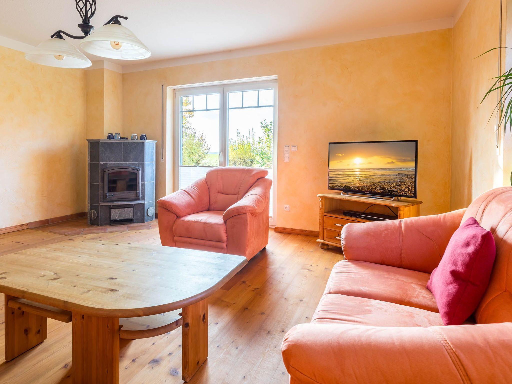 Der Wohnbereich im Erdgeschoss wartet unter anderem mit einem wunderschönen Kaminofen, zwei Sofas und einem Sessel auf perfekt für den abendlichen Ausklang nach einem ereignisreichen Tag an der Ostsee.
