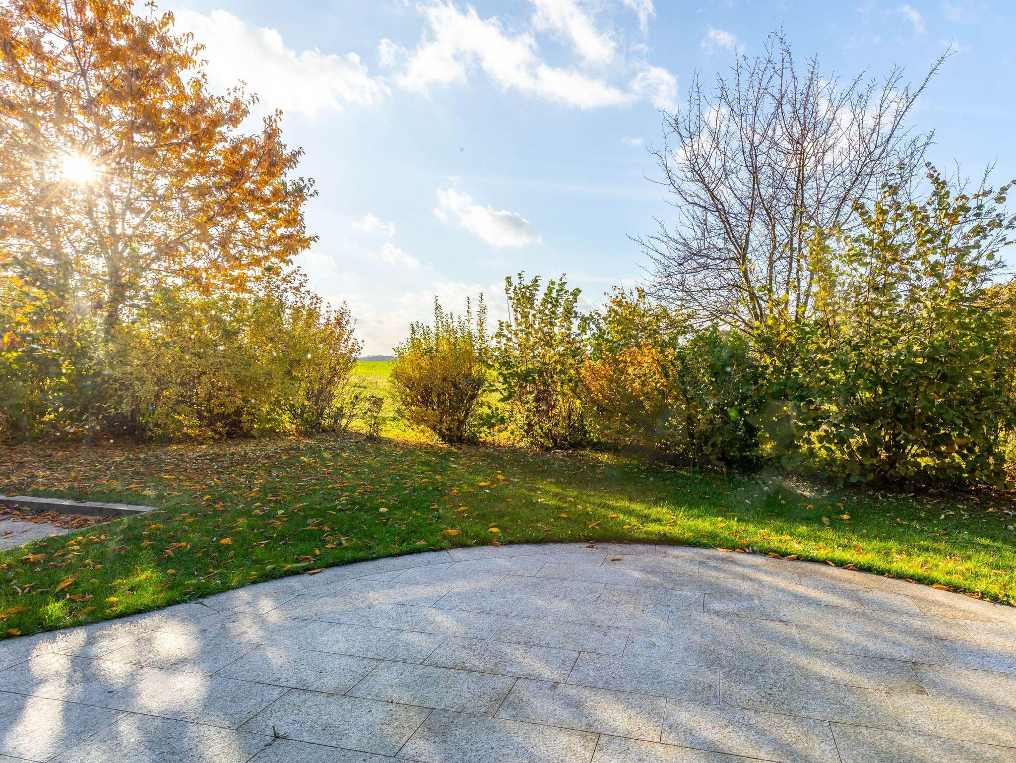 Die schöne möblierte West-Terrasse, die Sie vom Wohnzimmer aus erreichen, bietet einen tollen Blick auf die Felder. Der Garten wartet mit einer Rasenfläche, einer 4 m² großen Sandkiste mit Sandspielzeug für die Kinder und einem Trampolin auf.