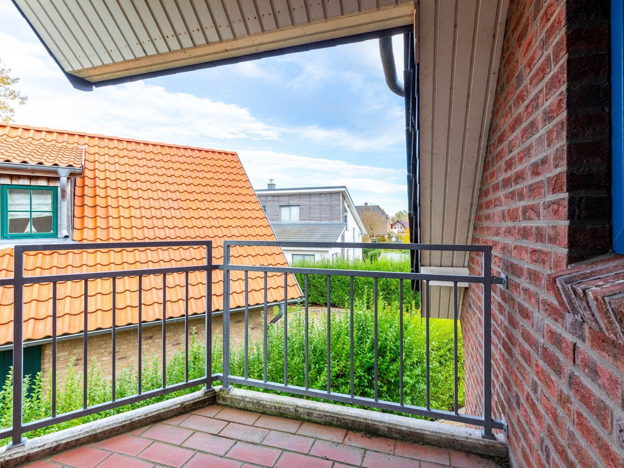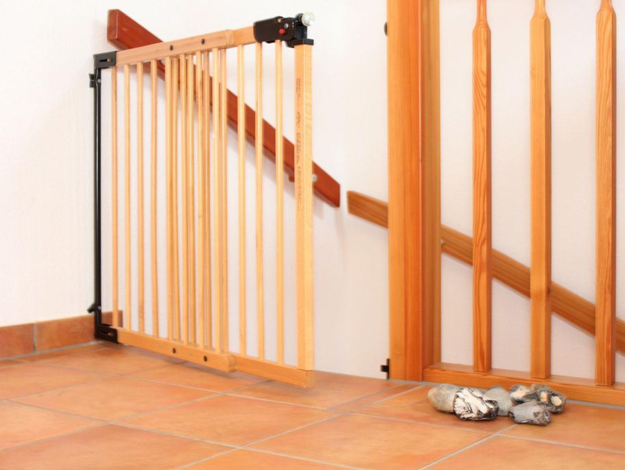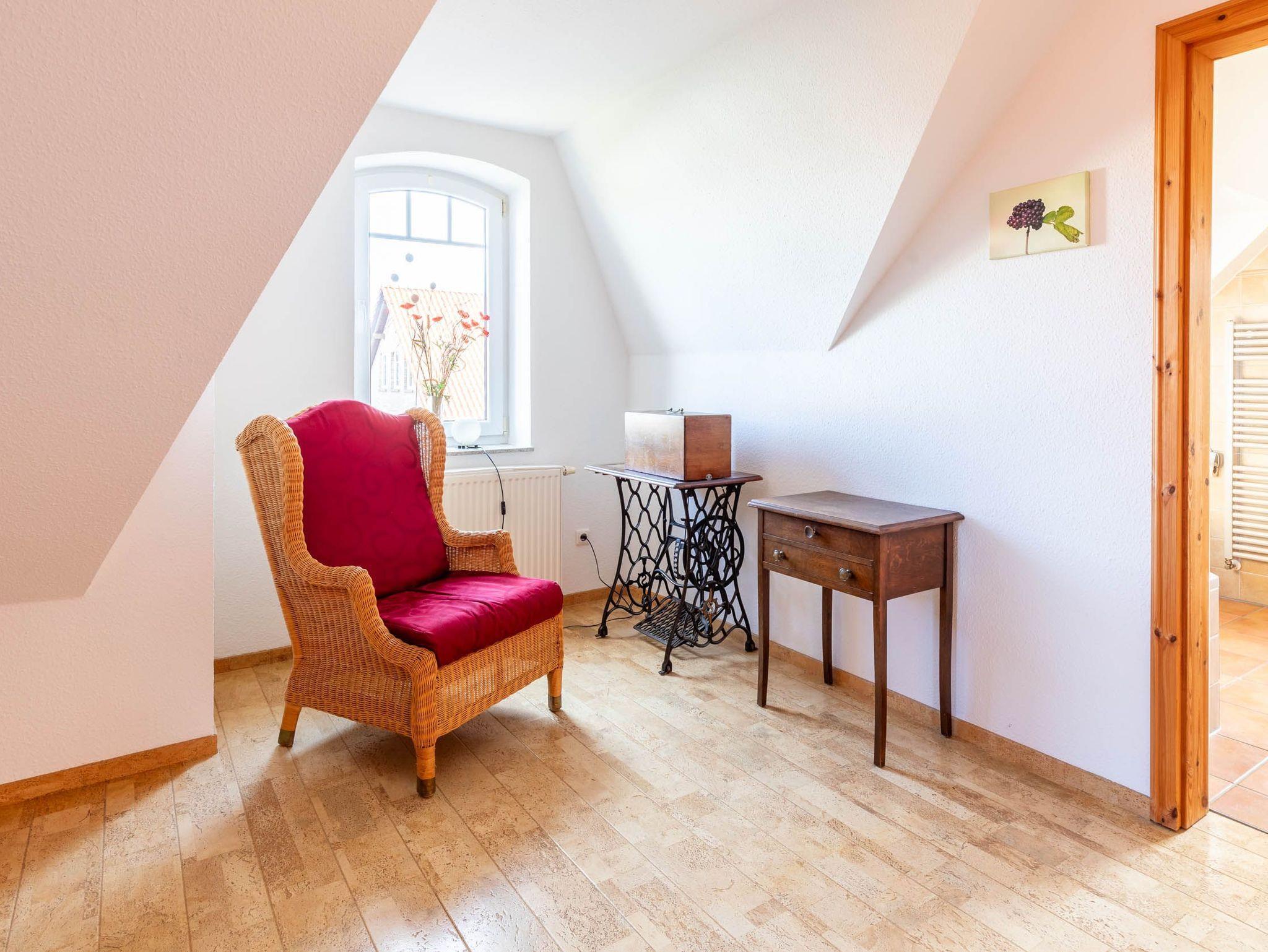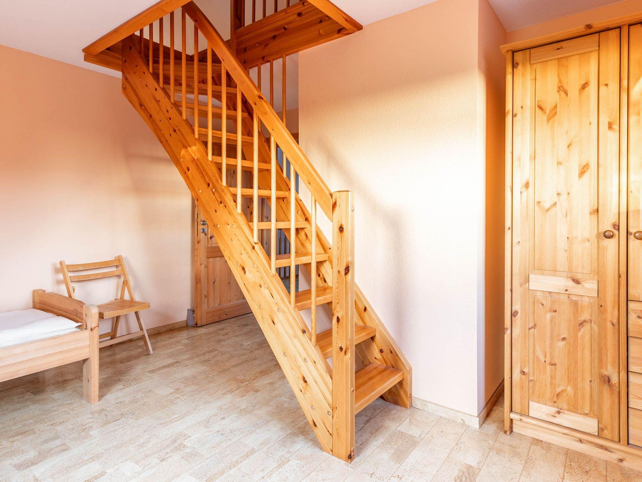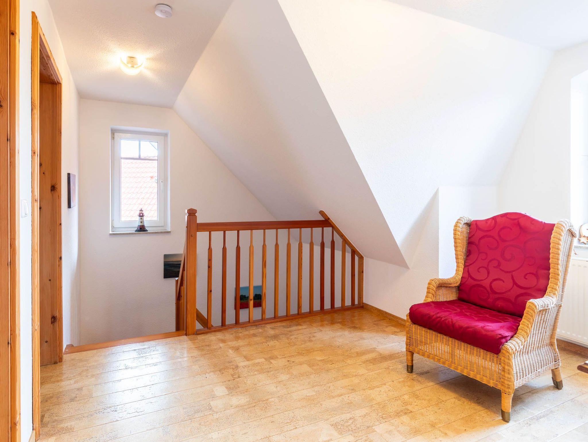 Von hier aus führt eine Holztreppe ins 1. Obergeschoss, wo sich im Friesengiebel ein schöner Sessel und eine kleine Kommode befinden - ein kleiner Rückzugsort, wenn man etwas Entspannung und Ruhe sucht. Am oberen Ende der Treppe ist ein Treppenschutzgitter befestigt.